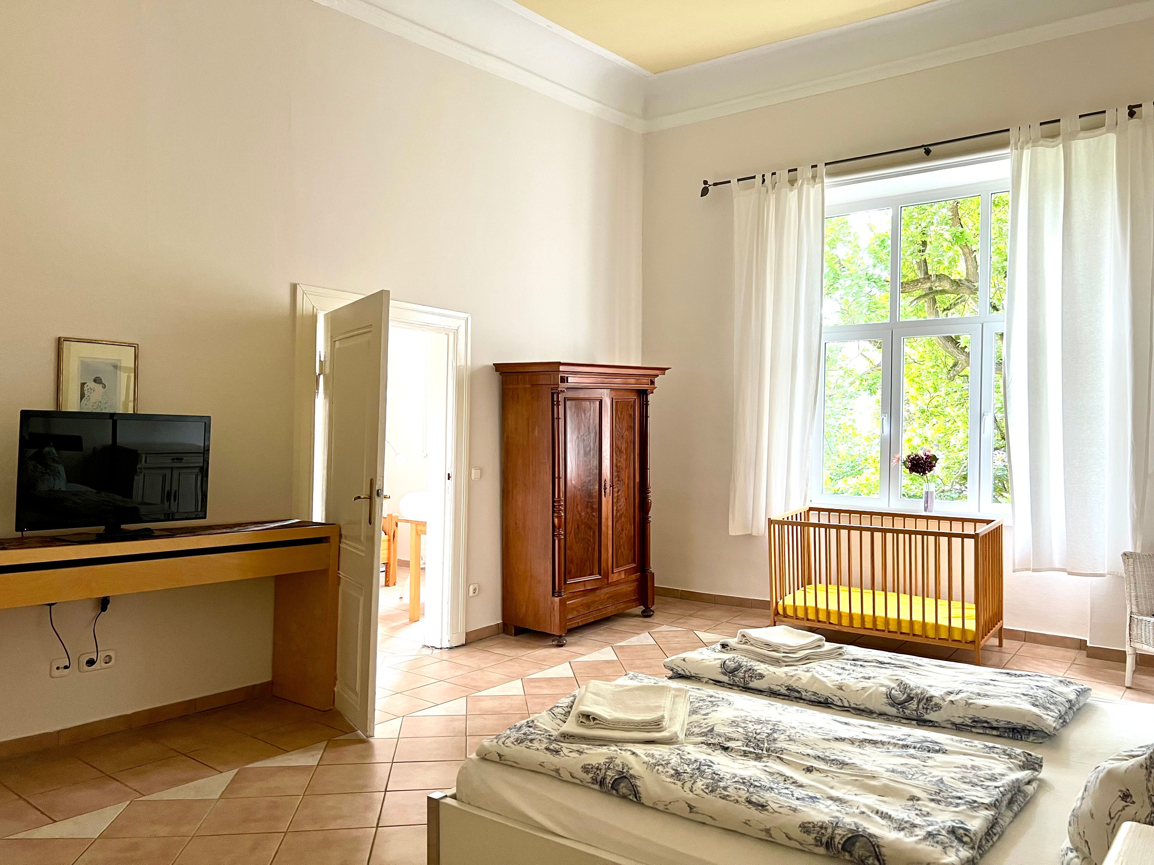 1 großes Elternschlafzimmer mit einem Doppebett mit Kinderbett. Hier ist auch Platz für ein weiteres Kinderbettchen.