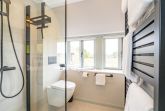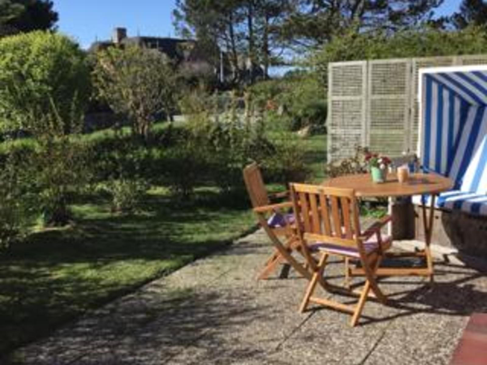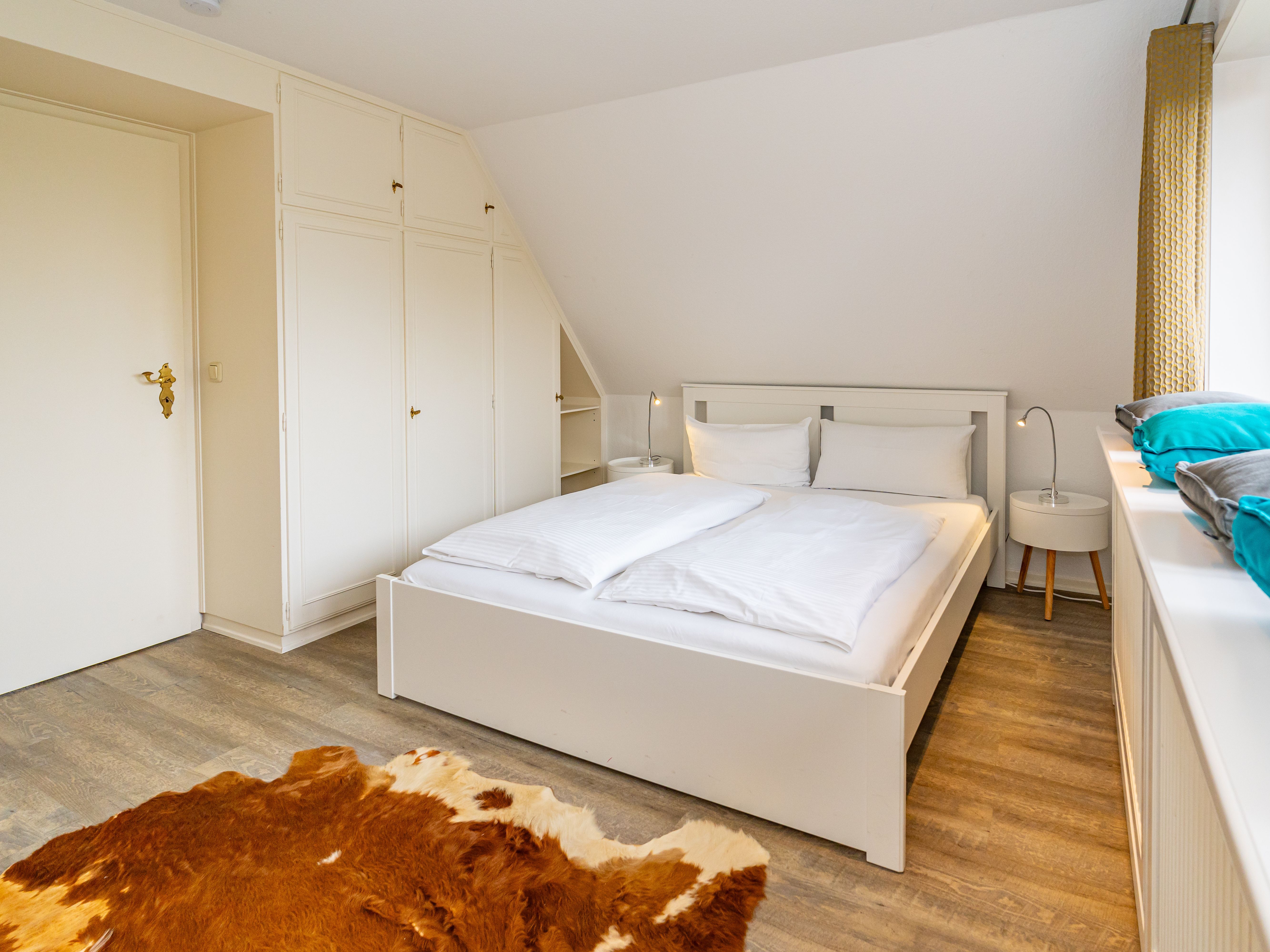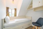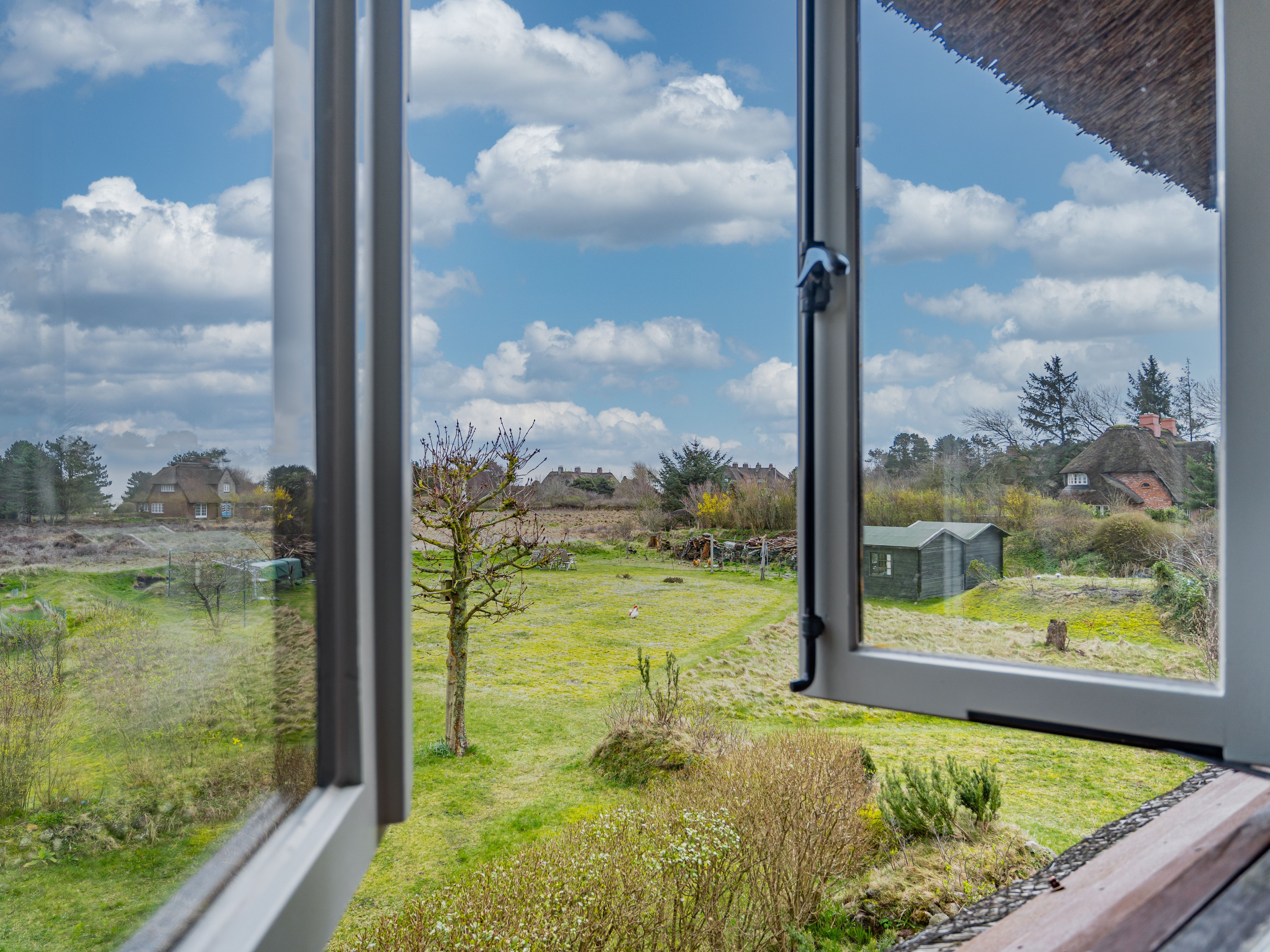 Wohnen in bester Lage und doch mitten in der Ruhe der Natur. Heideland, Wildblumenwiese und sogar ein kleiner Hühnerstall sorgen für ländliche Gemütlichkeit - fußläufig nach Kampen Mitte. Dieses Quartier für bis zu Drei liegt im 1. Obergeschoss eines klassischen Reetdachhauses, auch ein kleiner Vierbeiner hat hier Platz. Das gemütliche WohnEsszimmer begrüßt mit großer Fensterfront gen Süden und hat Platz für bis zu Vier am Esstisch. Die kleine Küche ist separat untergebracht und voll ausgestattet. Der erste Kaffee im Stehen lässt sich hier mit grandioser Aussicht über die auf dem Wattenmeer glitzernde Morgensonne genießen. Gleich nebenan ein frisch renoviertes, modernes Duschbad und gegenüber ein kleines Einzelschlafzimmer mit kuscheliger Schlafkoje. Das größere Doppelschlafzimmer liegt am Ende des Flures. Hier gibt es durch maßgeschneiderte Tischlereinbauten viel Stauraum und auch hier Natur pur - vom Bett aus kann man den Wind in den Baumwipfeln sehen. Die zugehörige Terrasse mit Strandkorb befindet sich direkt vor der Haustür und nach Westen ausgerichtet. Das Quartier ist mit Laminat ausgelegt.