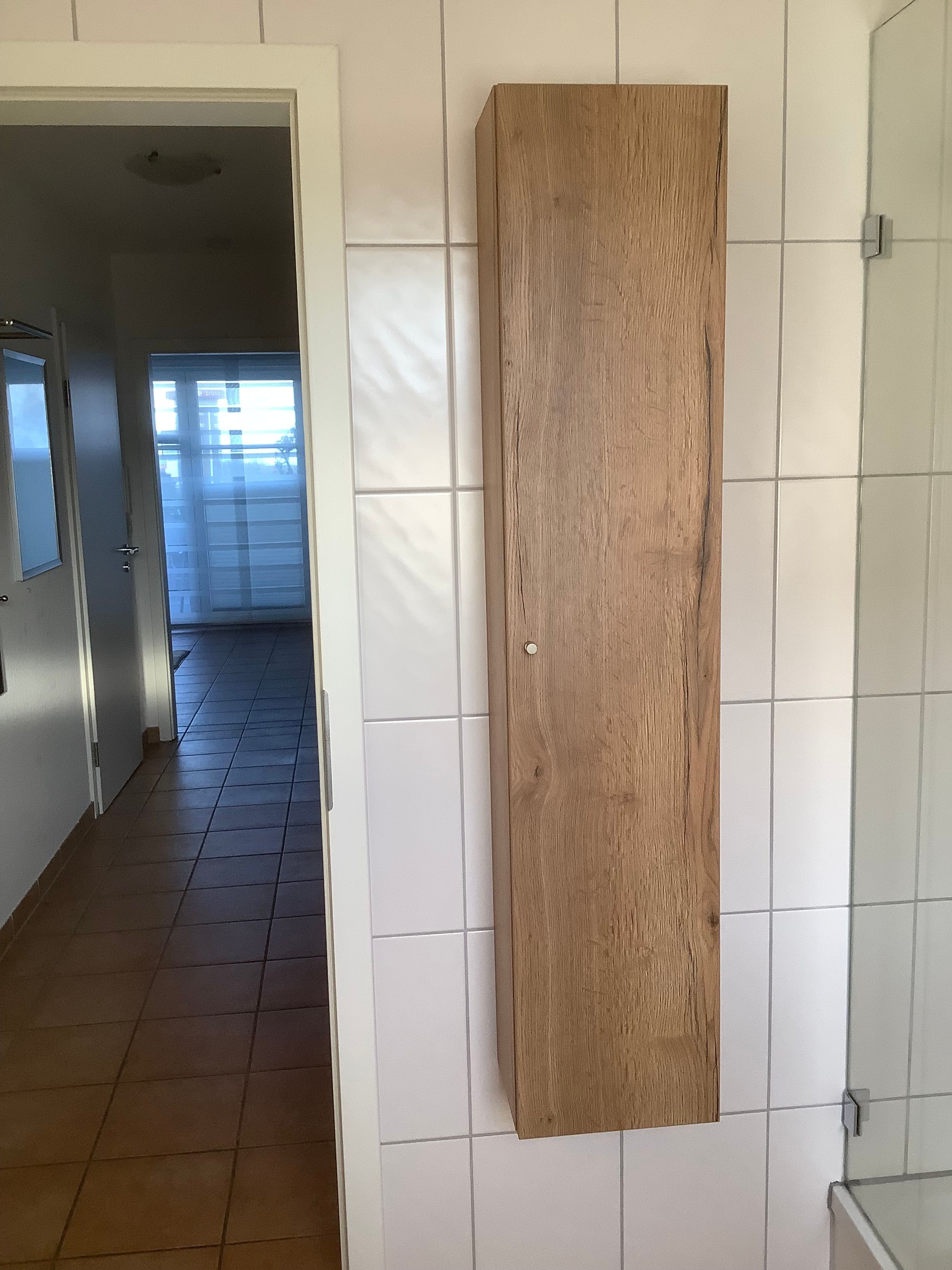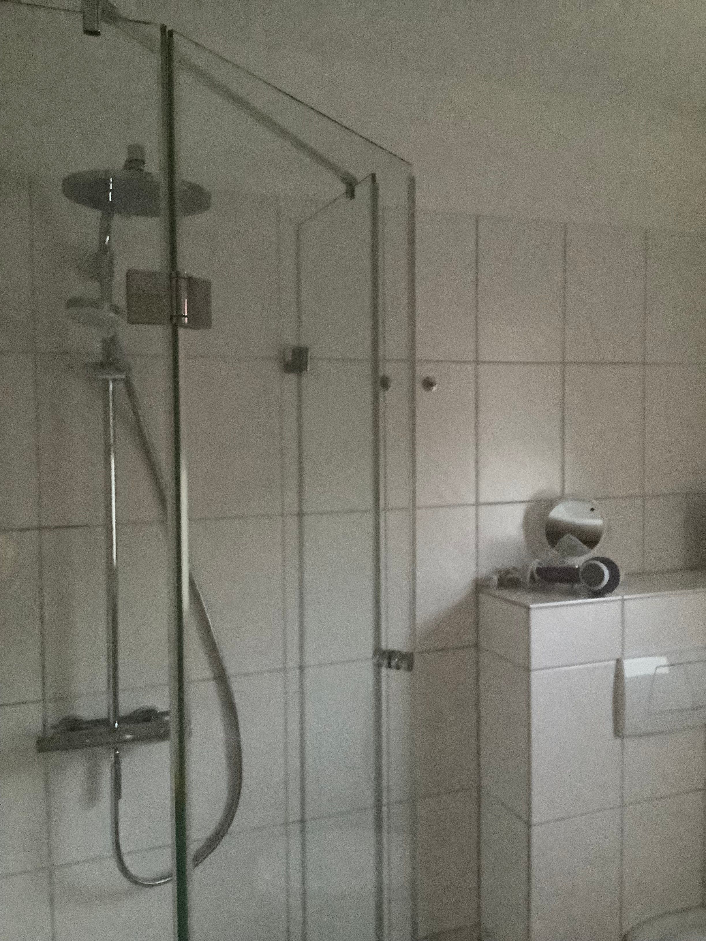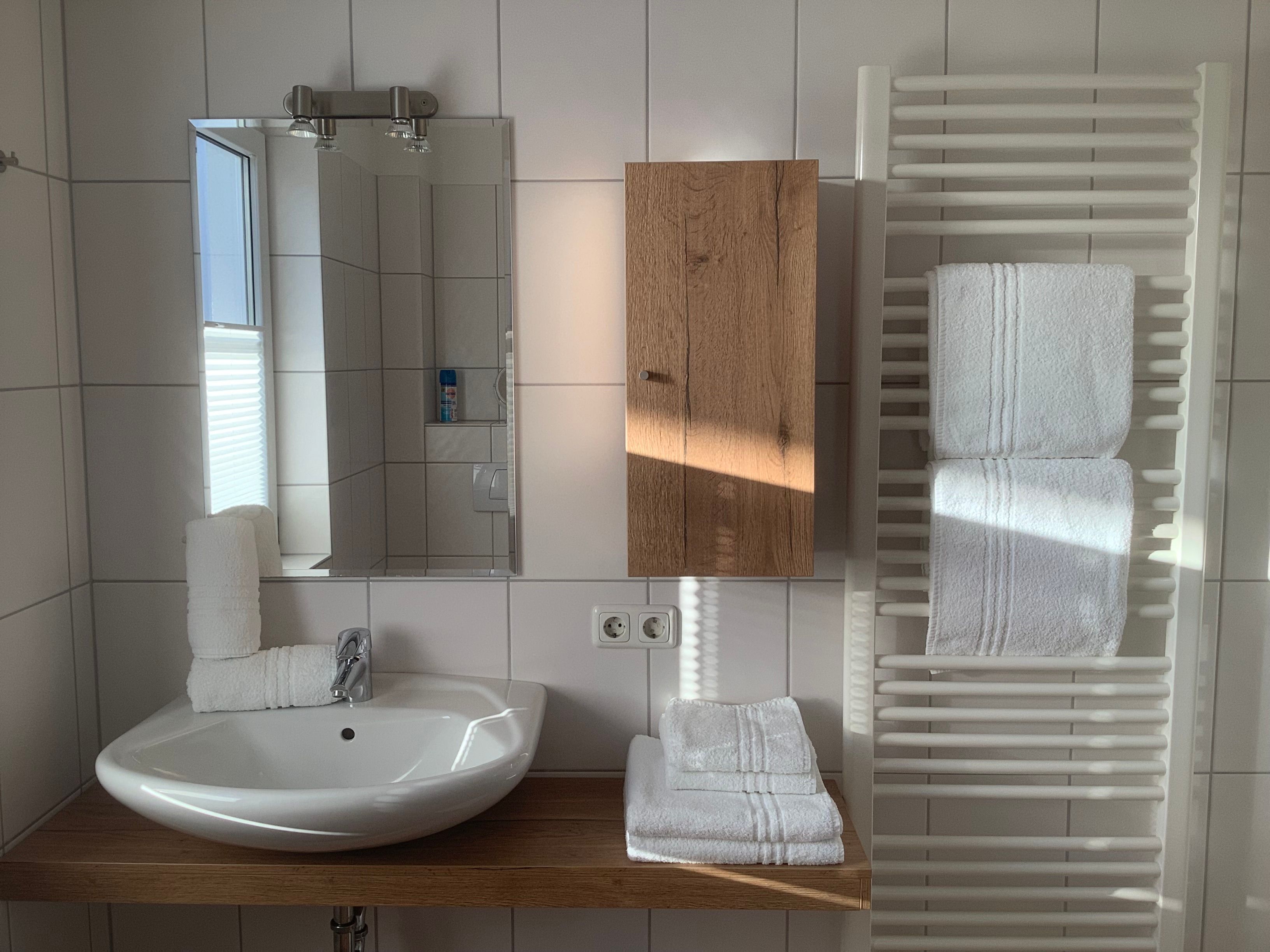 - ein großes Badezimmer mit Außenfenster sowie Fußbodenheizung + Regendusche + beheiztem Handtuchhalter und Föhn --> parkseitig