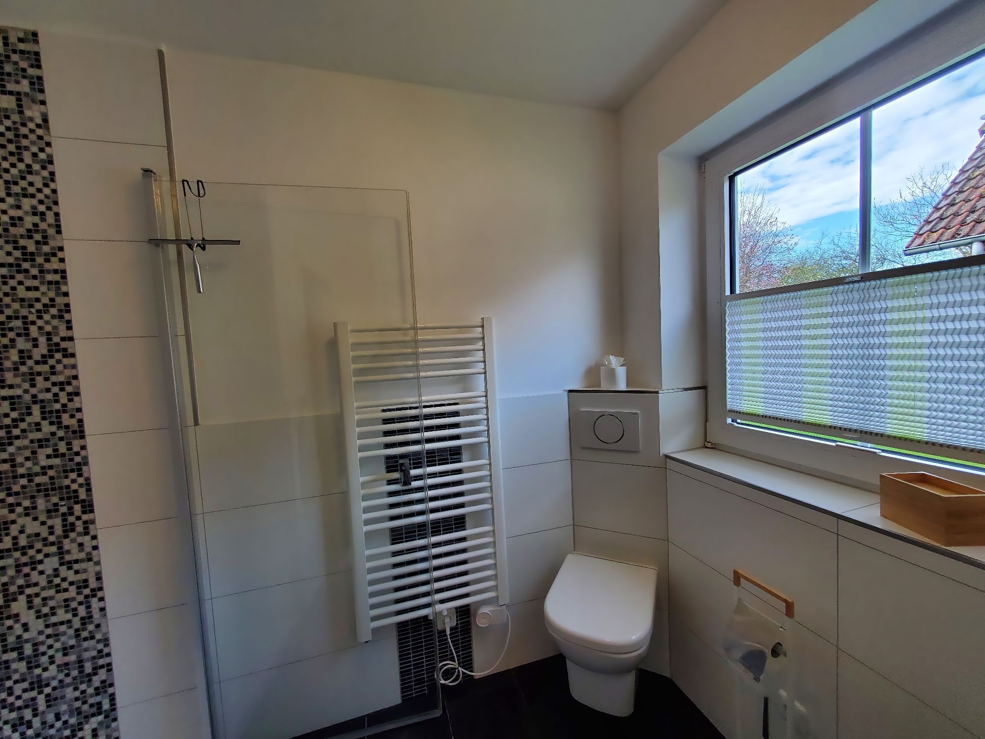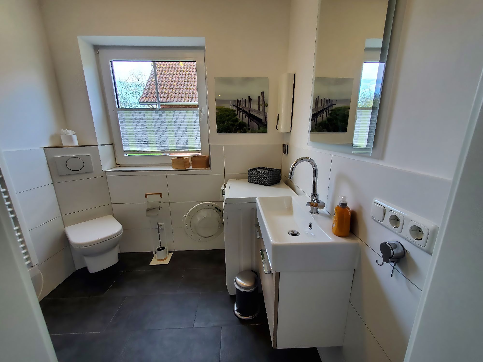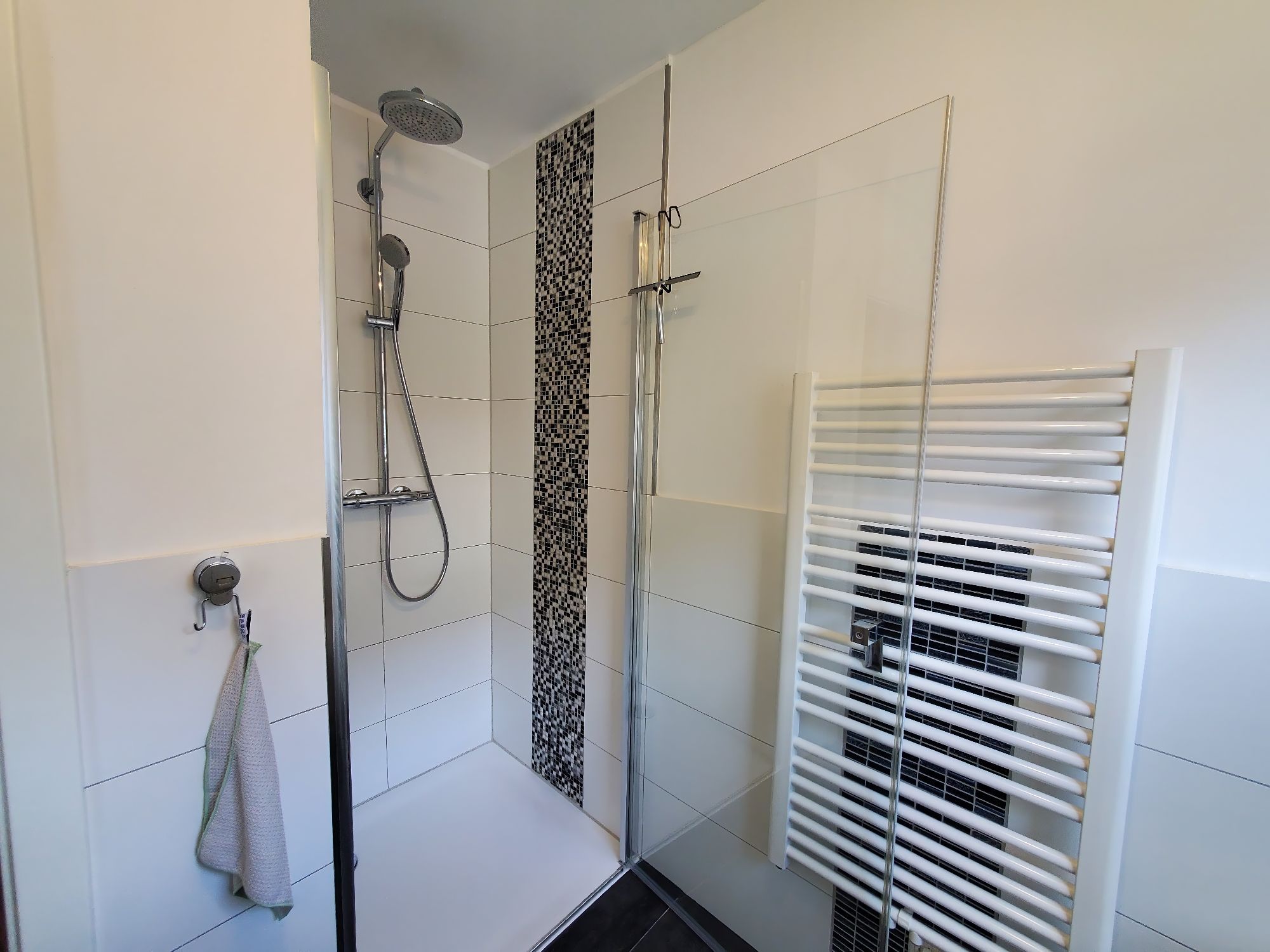 Duschbad mit Fußboden- und Handtuchheizung sowie Waschmaschine.