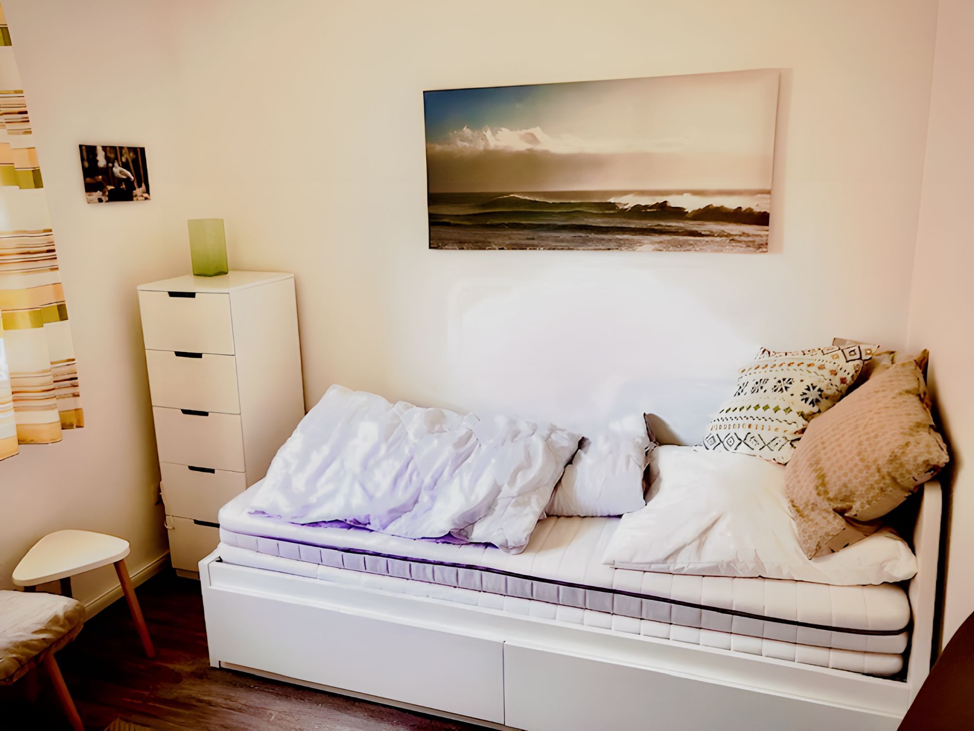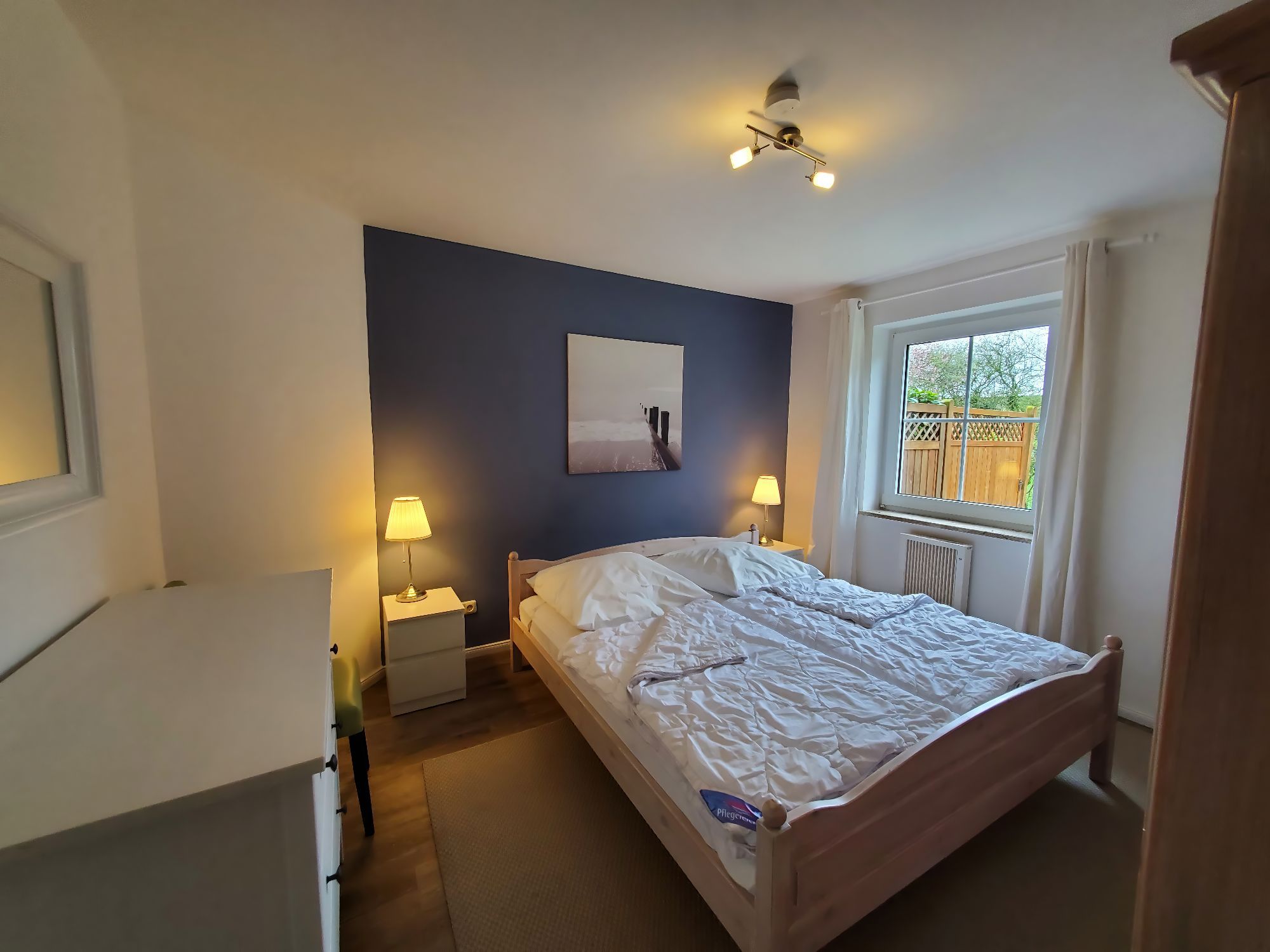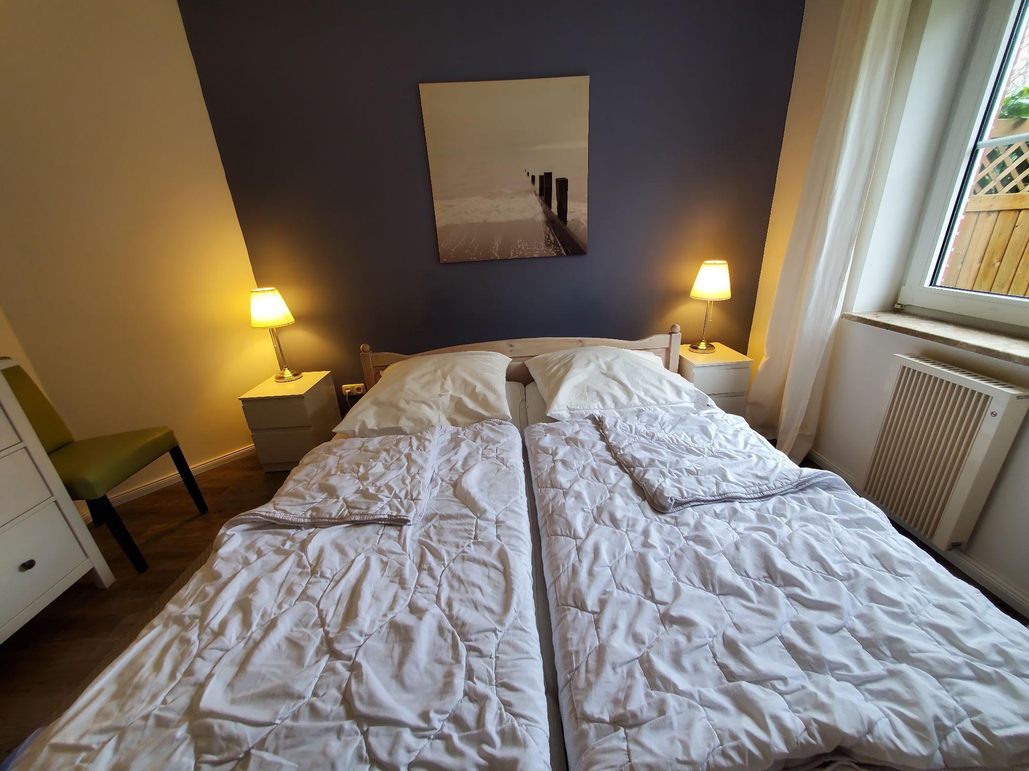Geräumiges Elternschlafzimmer mit Doppelbett und Kleiderschrank, 2. Schlafzimmer mit Ausziehbett zum Doppelbett umzufunktionieren.