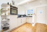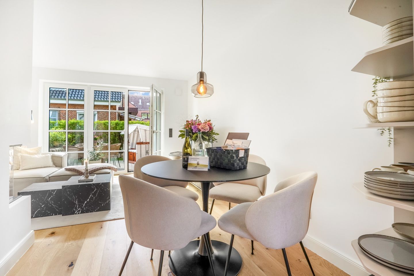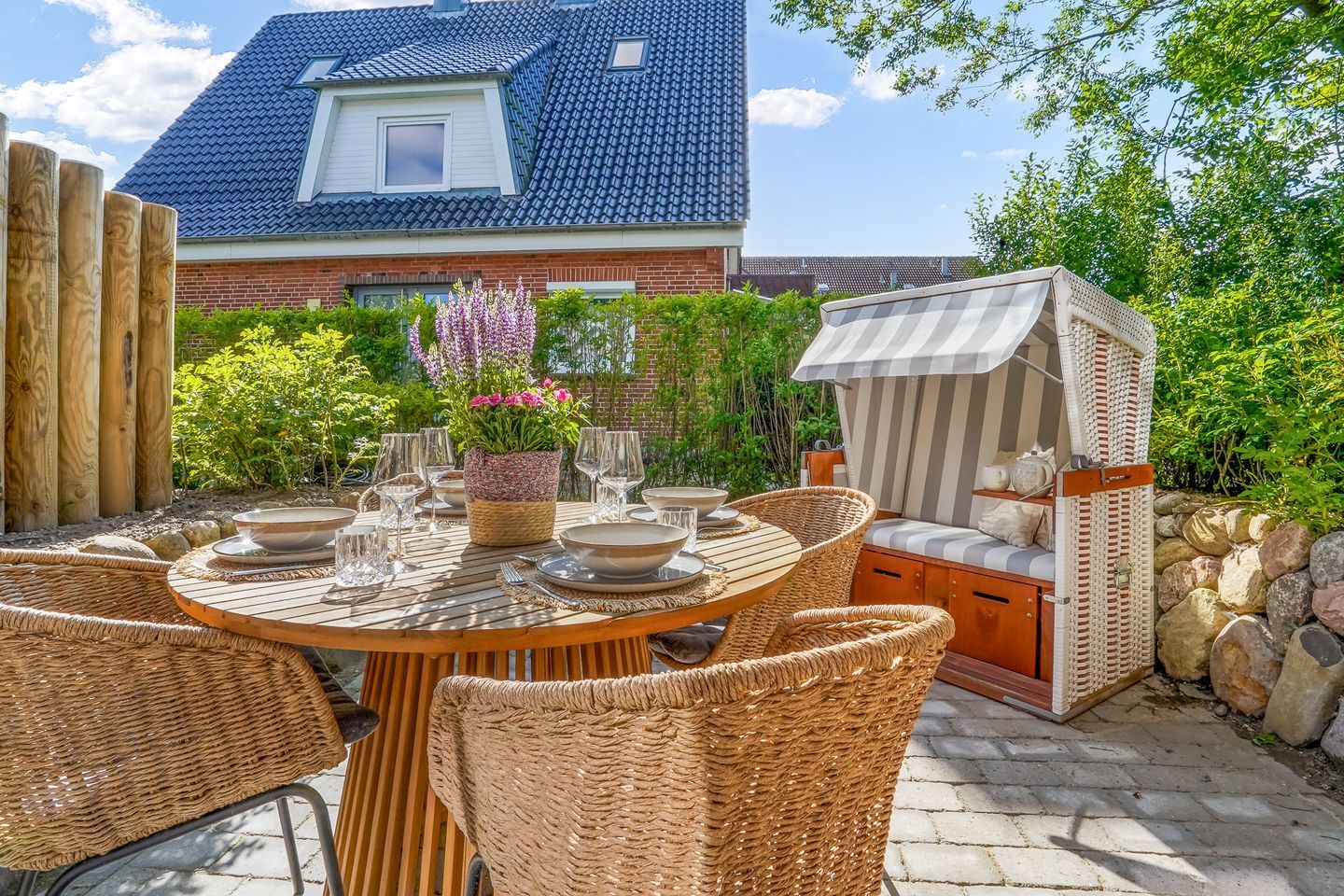 Wohnzimmer mit Gaskamin, Essecke, offener Küche und direktem Zugang zur Terrasse mit Strandkorb und Gartenmöbeln, Gäste-WC, Garderobe