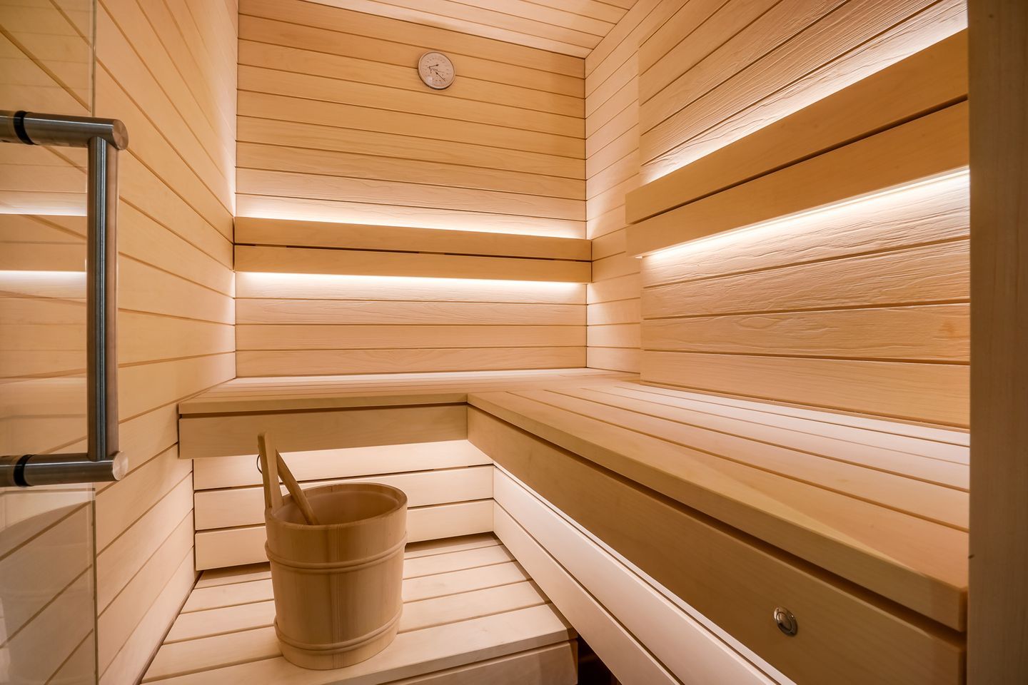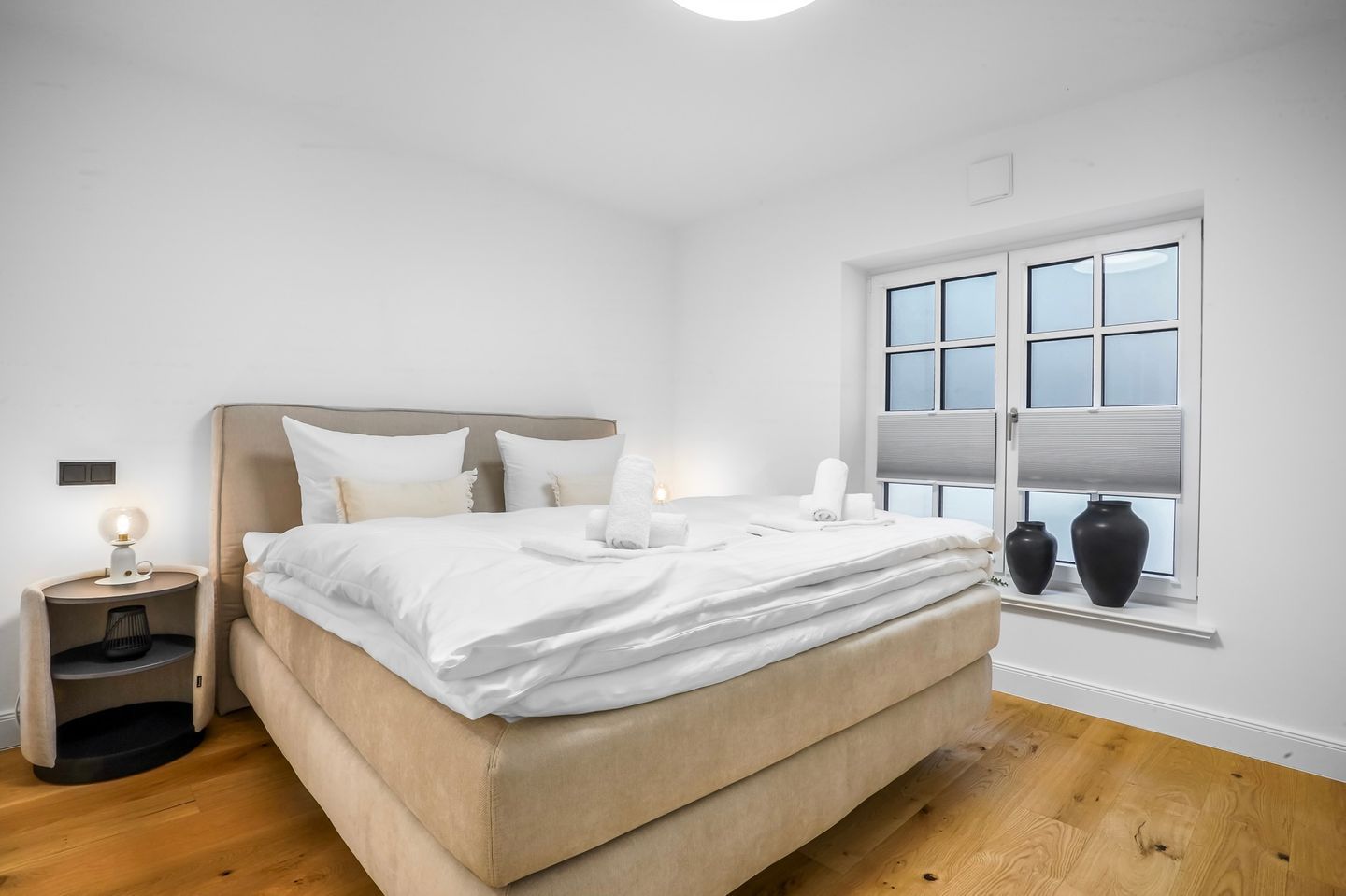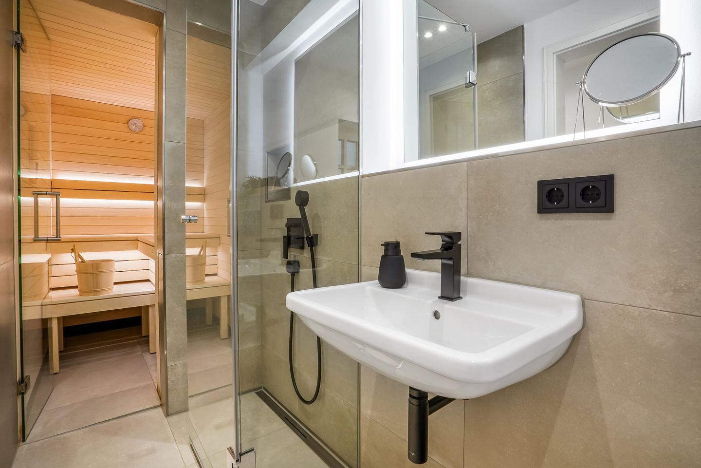Schlafzimmer mit hochwertigem Doppelbett (180x200cm), Badezimmer mit Dusche und angrenzender Sauna, Wasch-Trockner