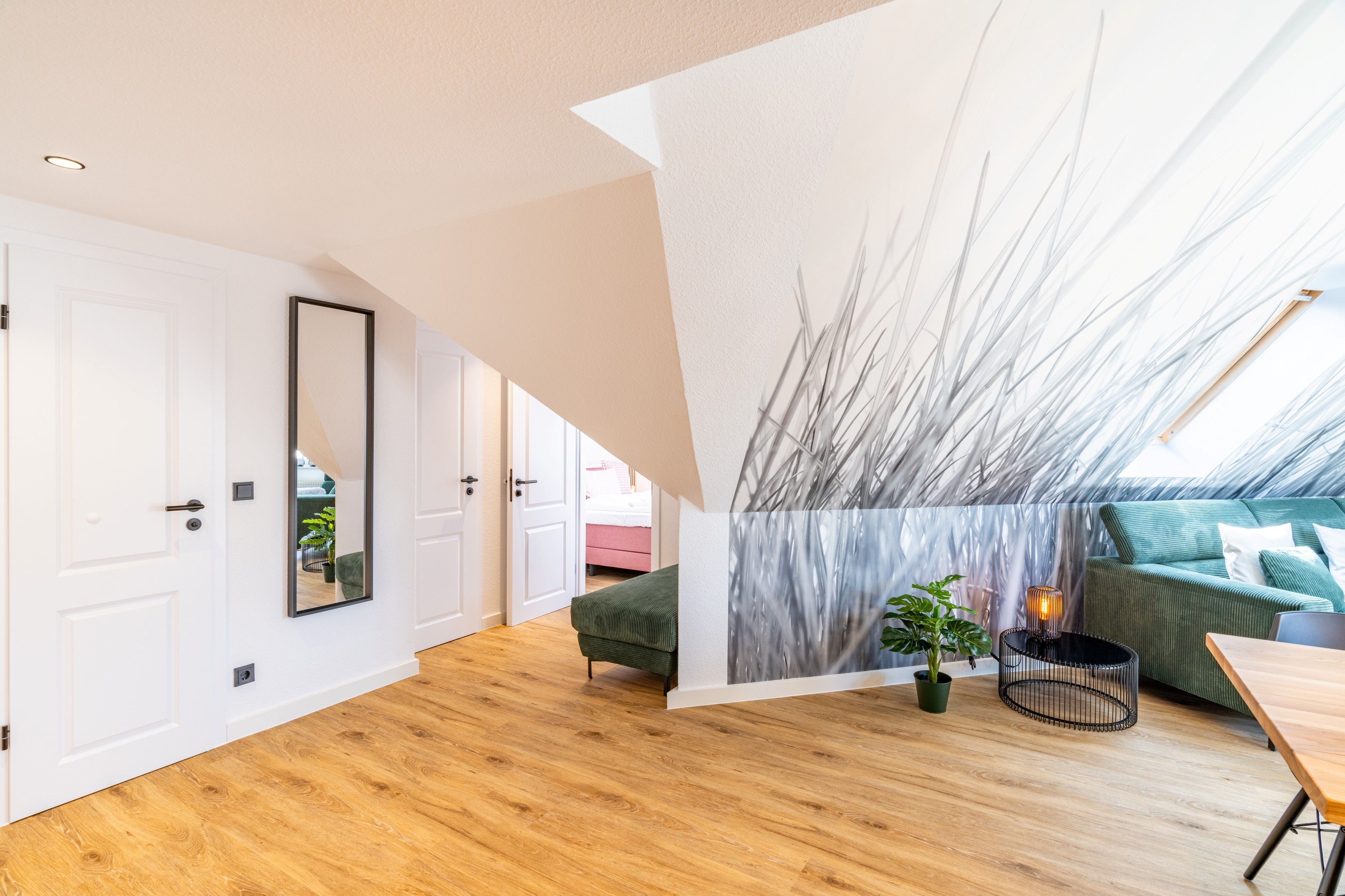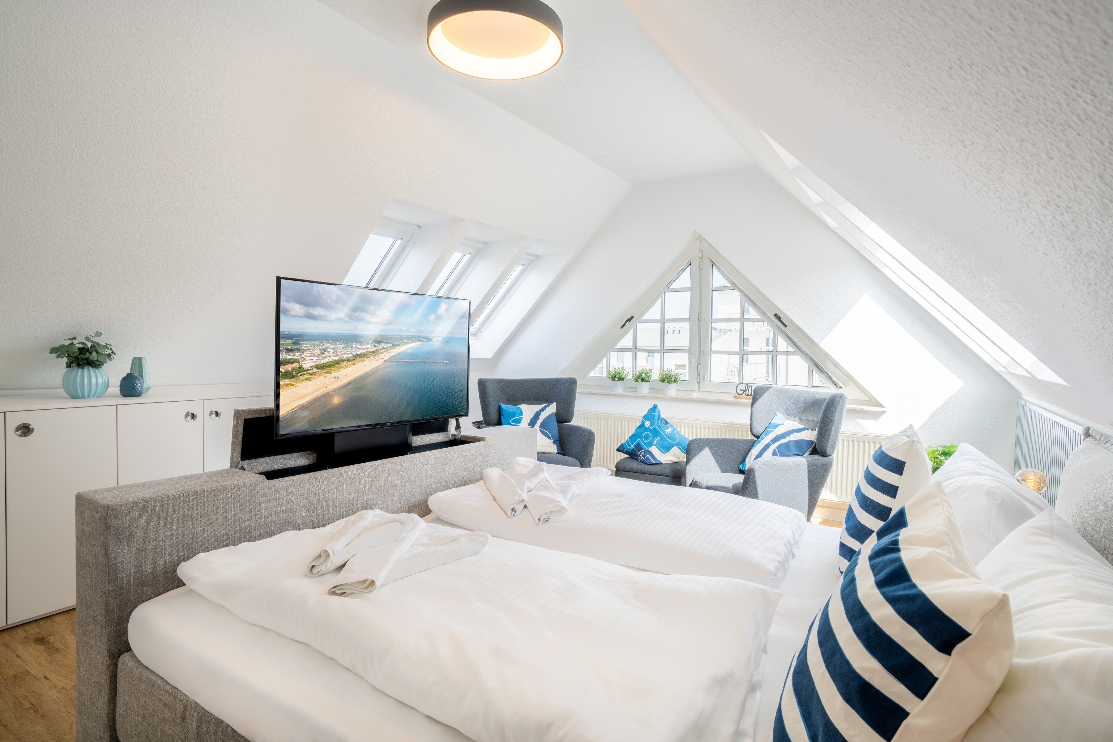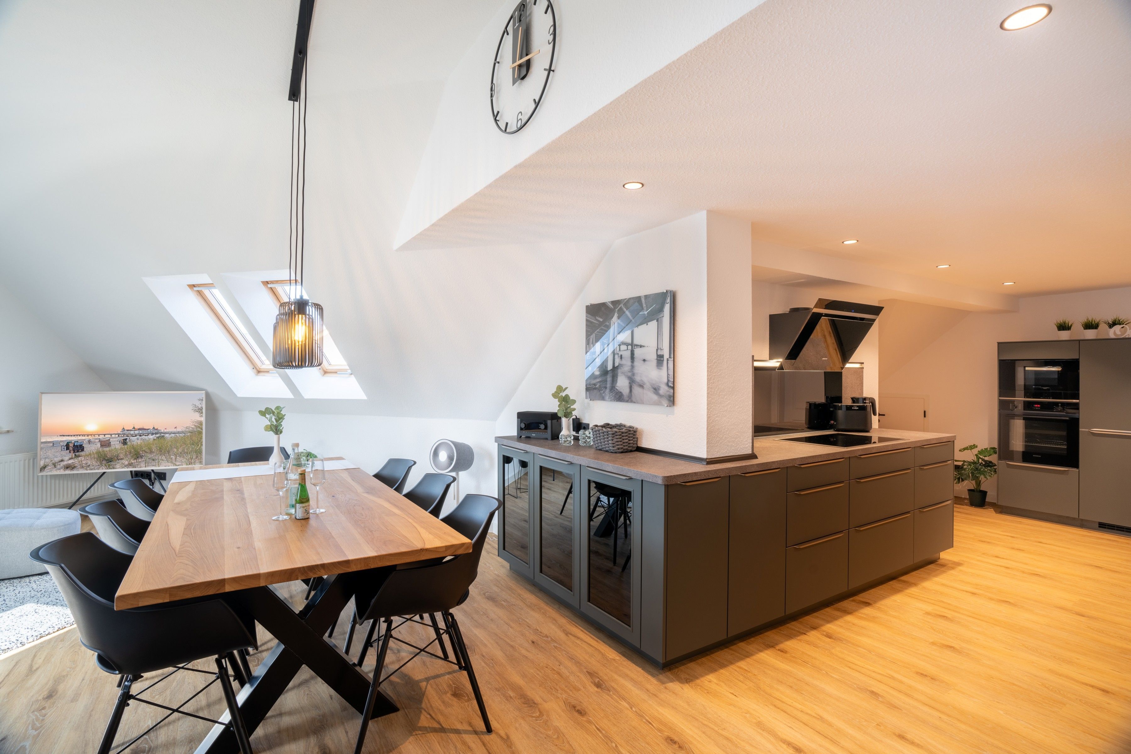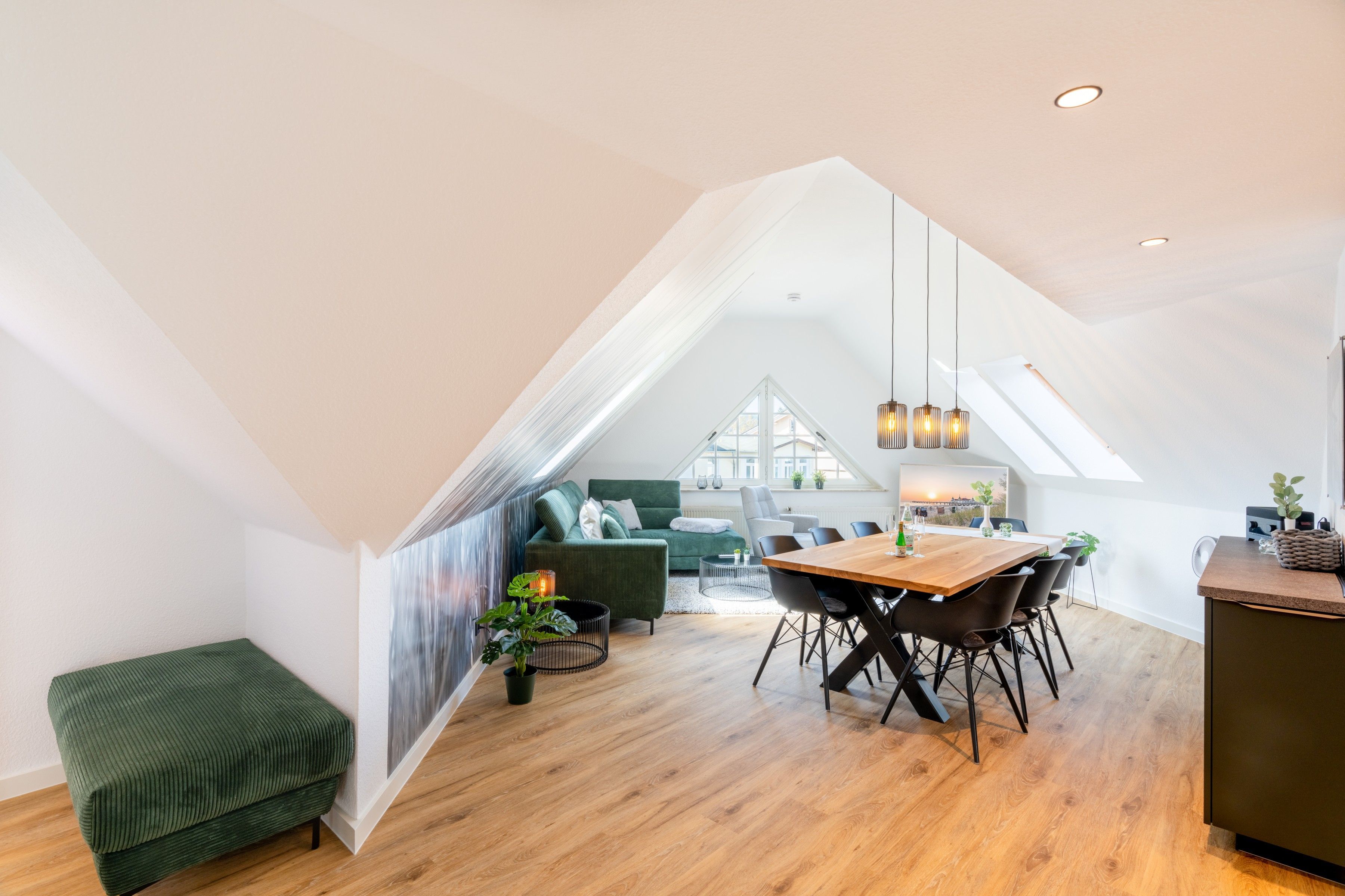Die 96 qm große und komfortable Wohnung befindet sich im Dachgeschoss und ist für bis zu sechs Personen ausgestattet. Sie wurde 2024 komplett renoviert. Die Wohnung verfügt über drei separate Schlafzimmer mit Doppelbett (mit zusätzlichem TV-Gerät), ein Wohnzimmer mit großzügiger und gemütlicher Couch-Ecke, TV sowie eine offene moderne Küche, ausgestattet mit einem Kühlschrank, Herd, Mikrowelle, Spülmaschine u.v.m.. Zwei Bäder mit ebenerdiger Dusche und WC. Bitte beachten Sie, dass durch die Lage im Dachgeschoss, die Deckenhöhe teilweise etwas niedrig ist.