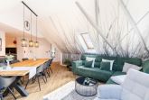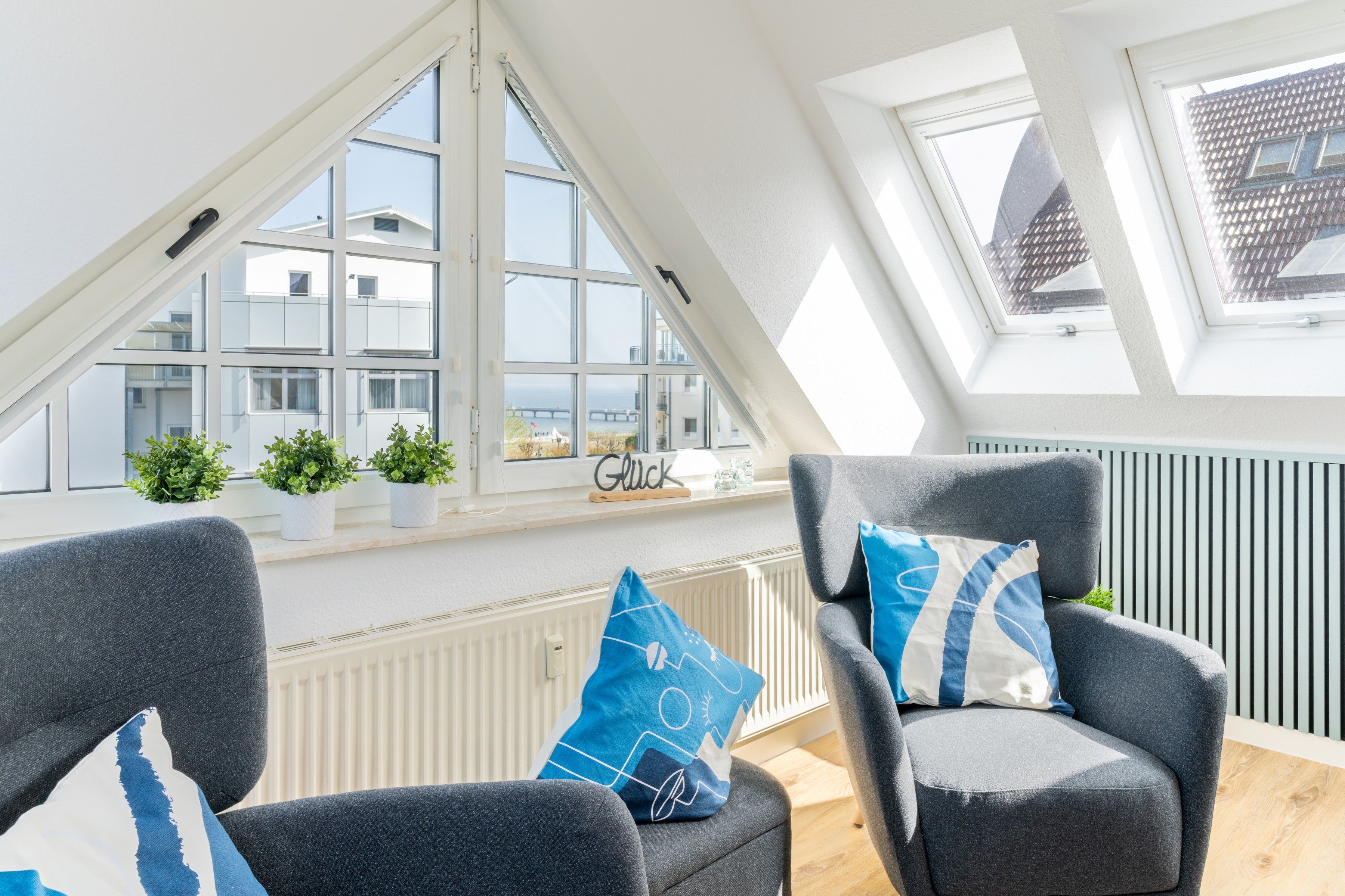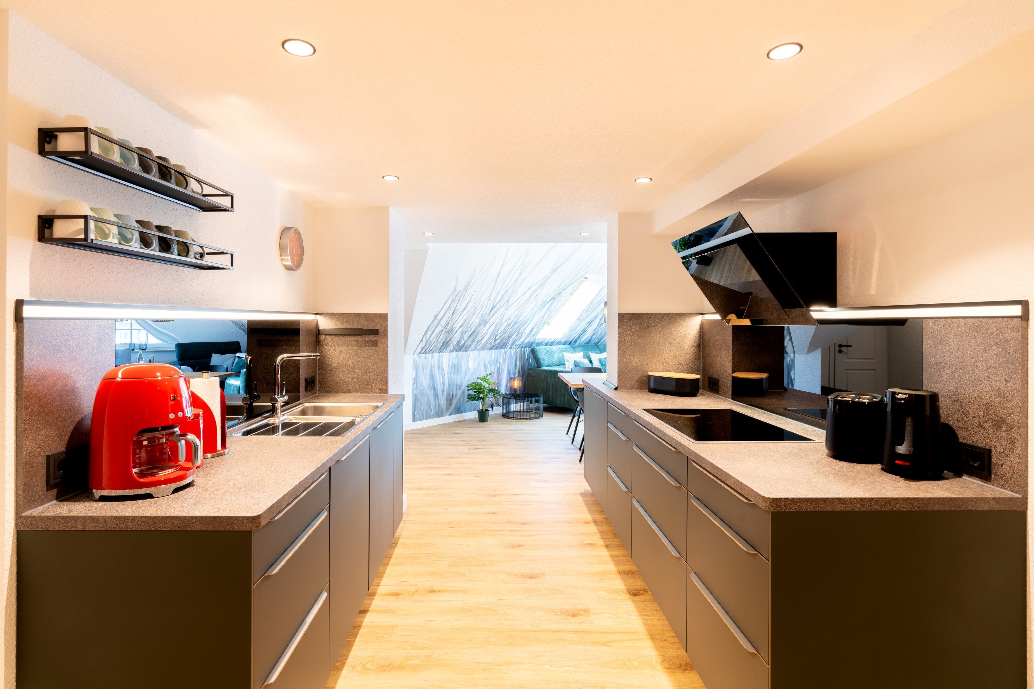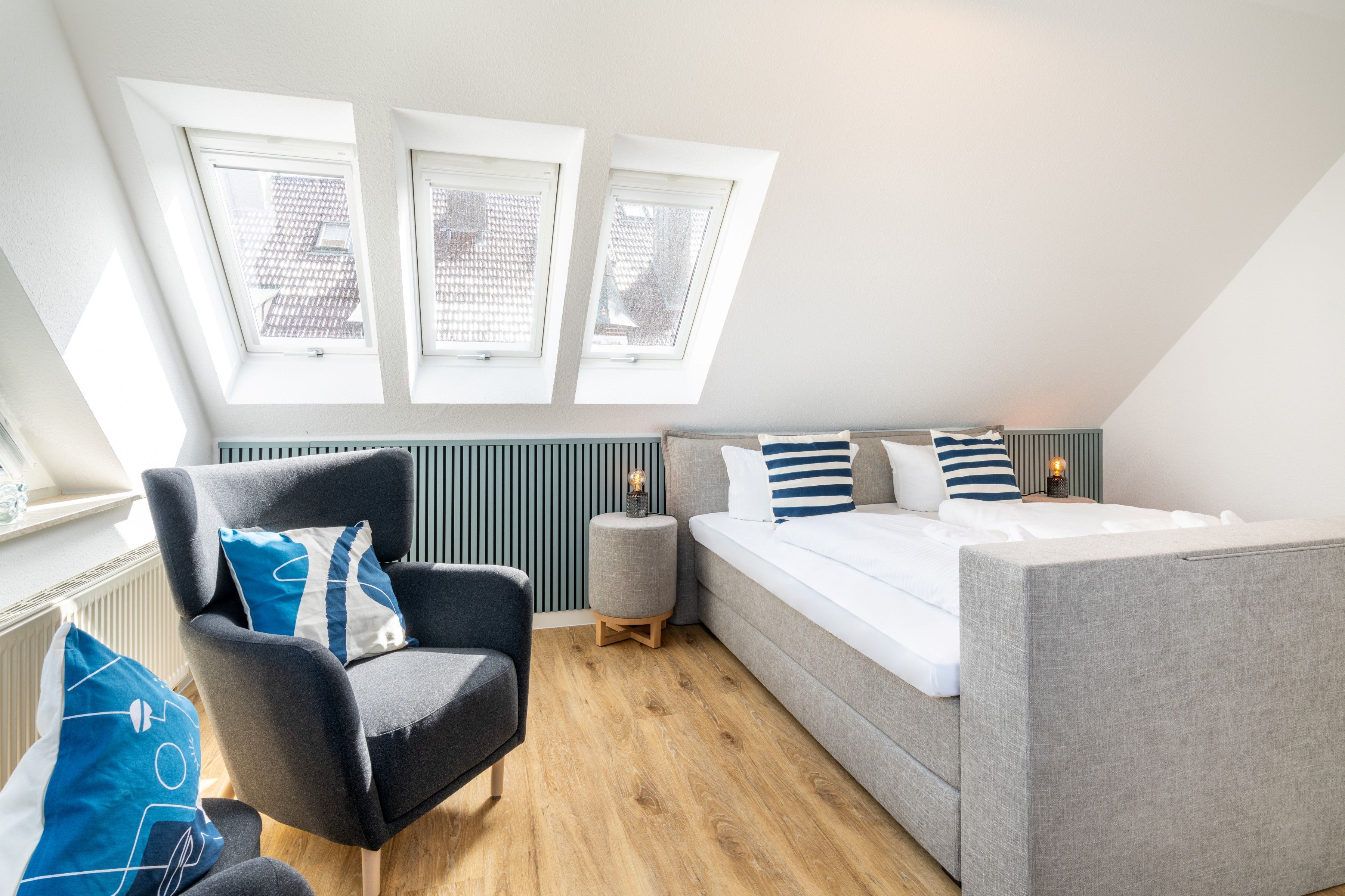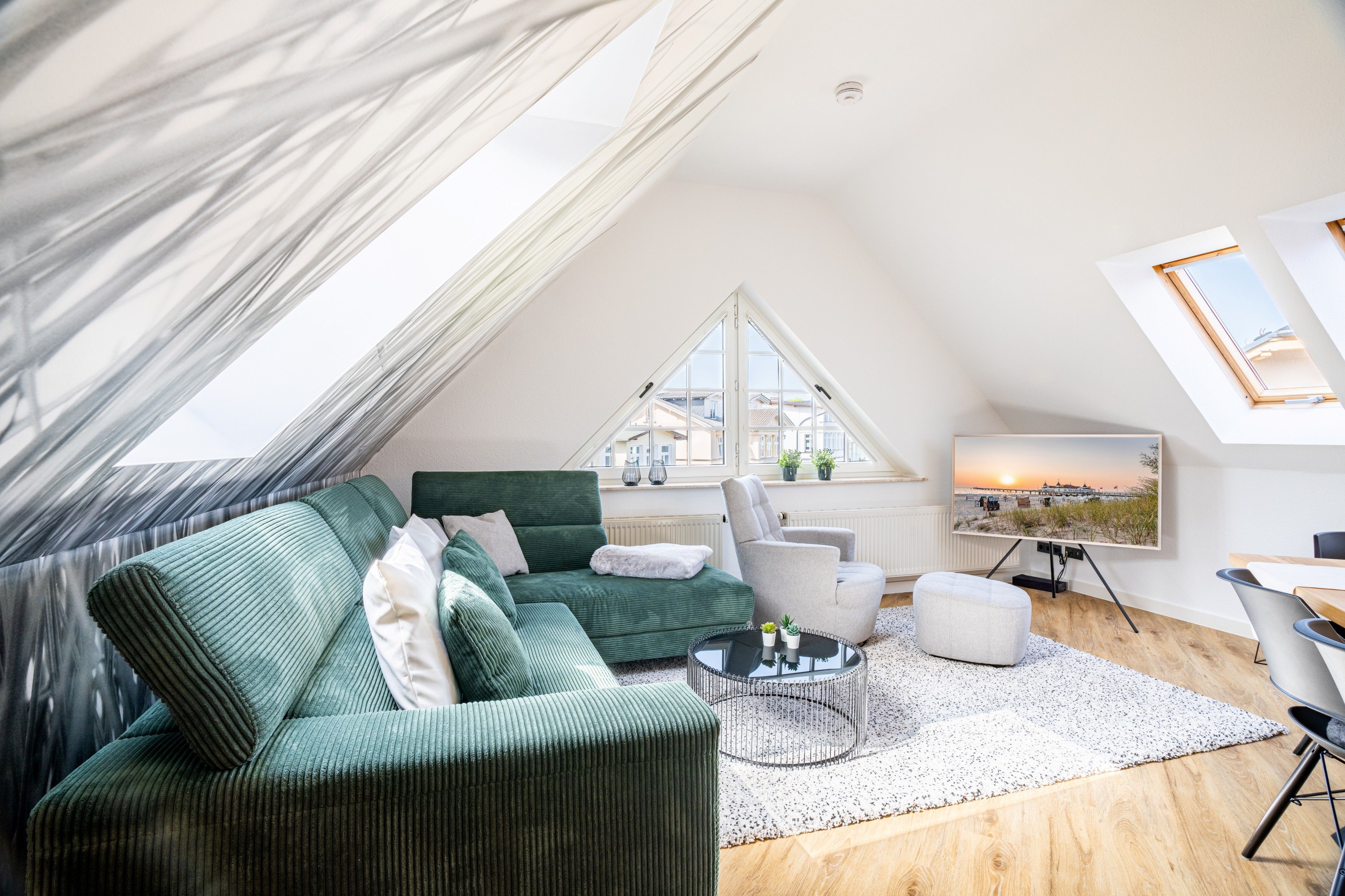 Die 96 qm große und komfortable Wohnung befindet sich im Dachgeschoss und ist für bis zu sechs Personen ausgestattet. Sie wurde 2024 komplett renoviert. Die Wohnung verfügt über drei separate Schlafzimmer mit Doppelbett (mit zusätzlichem TV-Gerät), ein Wohnzimmer mit großzügiger und gemütlicher Couch-Ecke, TV sowie eine offene moderne Küche, ausgestattet mit einem Kühlschrank, Herd, Mikrowelle, Spülmaschine u.v.m.. Zwei Bäder mit ebenerdiger Dusche und WC. Bitte beachten Sie, dass durch die Lage im Dachgeschoss, die Deckenhöhe teilweise etwas niedrig ist.