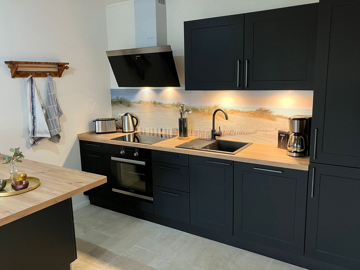 Treten Sie ein in das liebevoll eingerichtete Interieur mit einem großzügigen Wohn- und Essbereich, der mit einer offenen Küche verbunden ist. Hier erwartet Sie ein gemütlicher Kamin, der für wohlige Atmosphäre sorgt. Die voll ausgestattete Küche lässt keine Wünsche offen und verfügt über Mikrowelle, Cerankochfeld, Backofen, Kühlschrank, Spülmaschine, Filterkaffeemaschine, Wasserkocher, Toaster und Mixer.