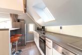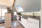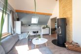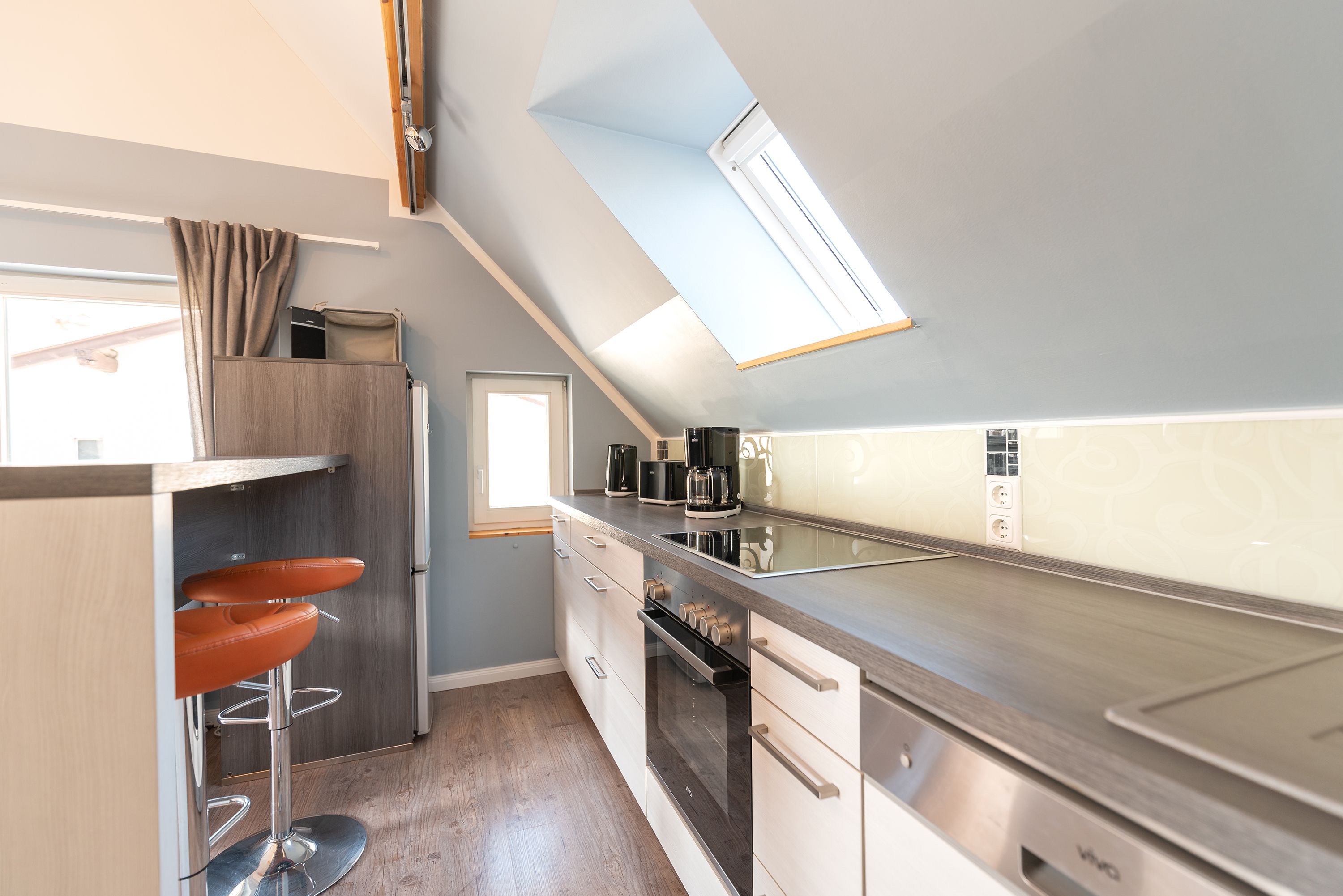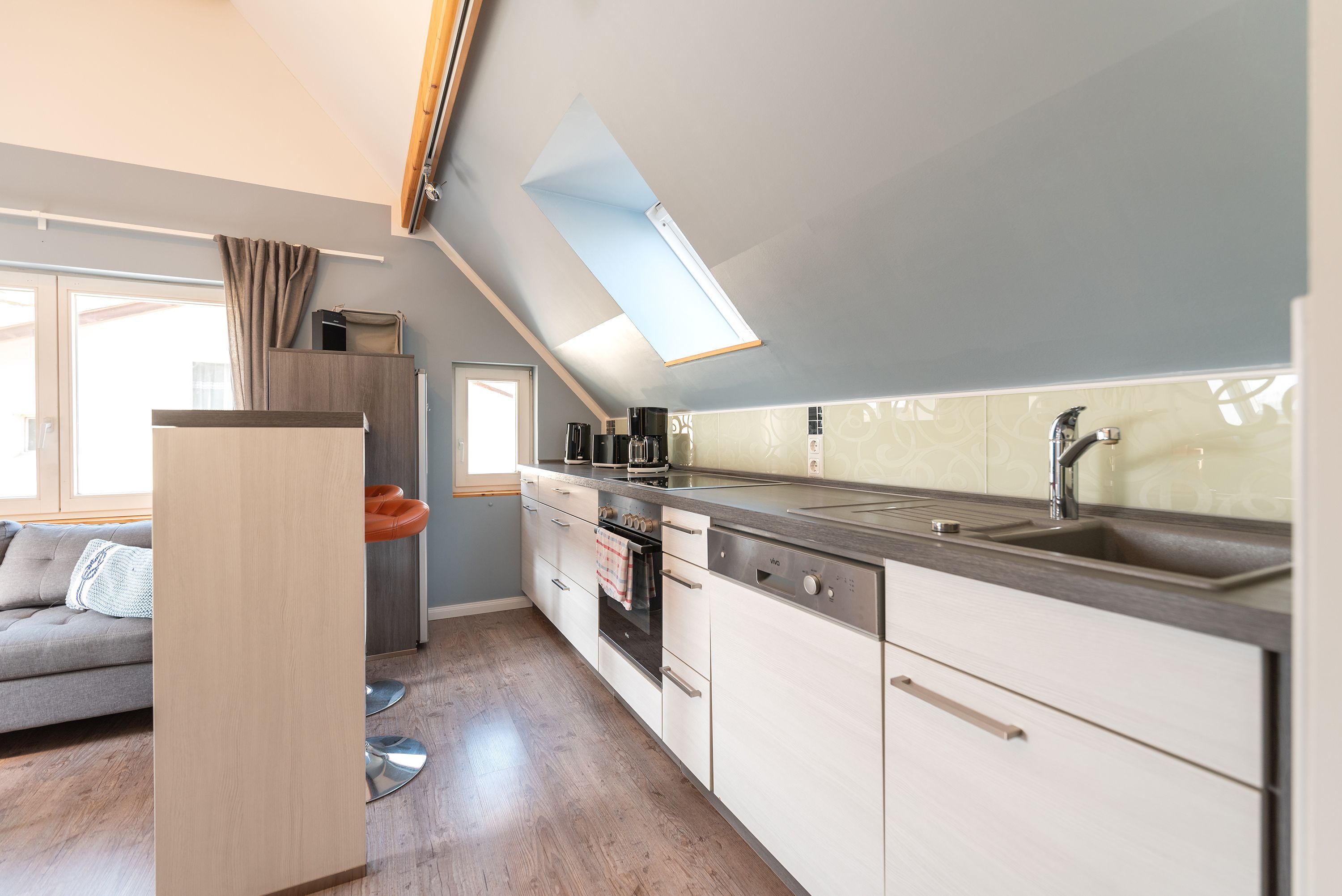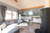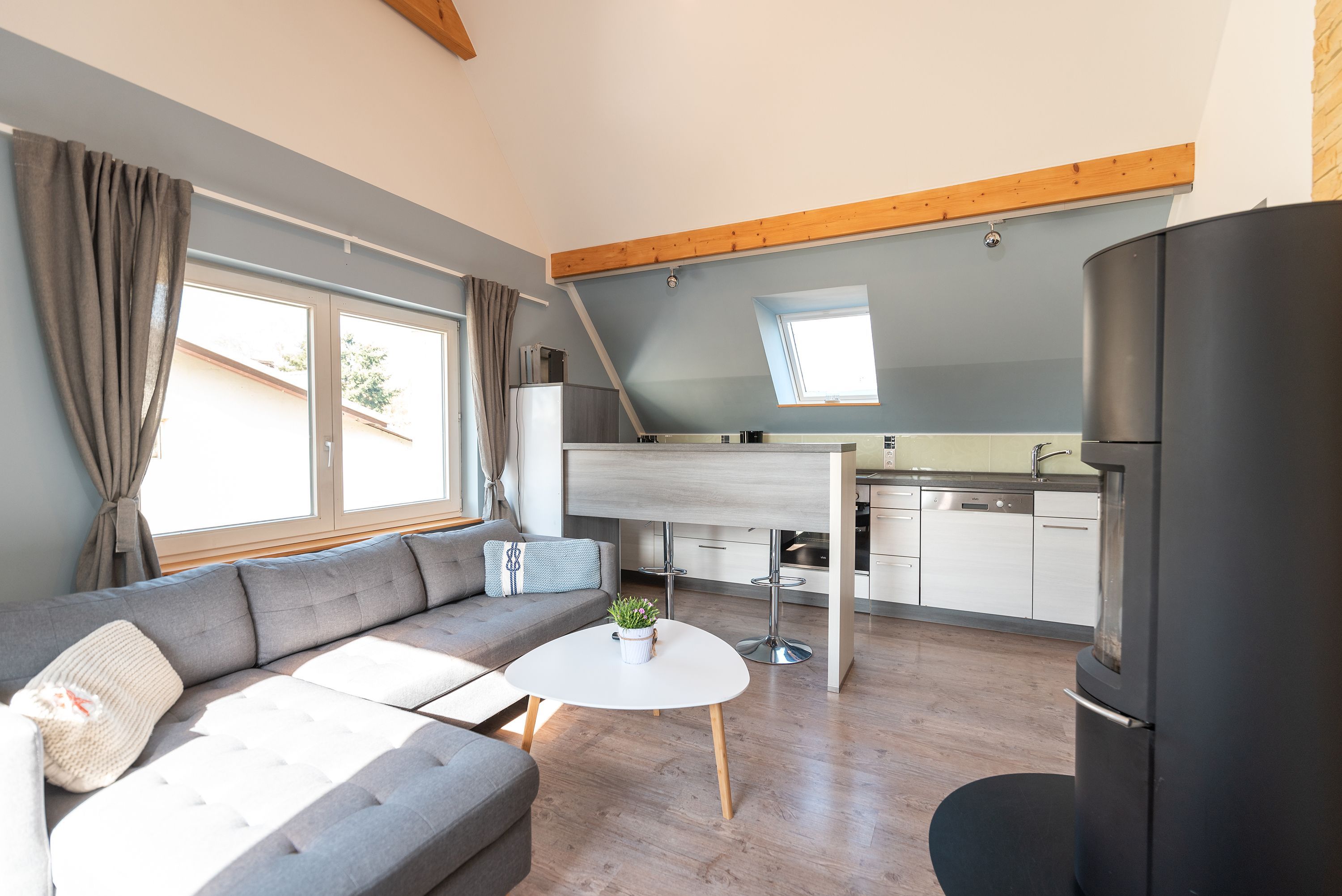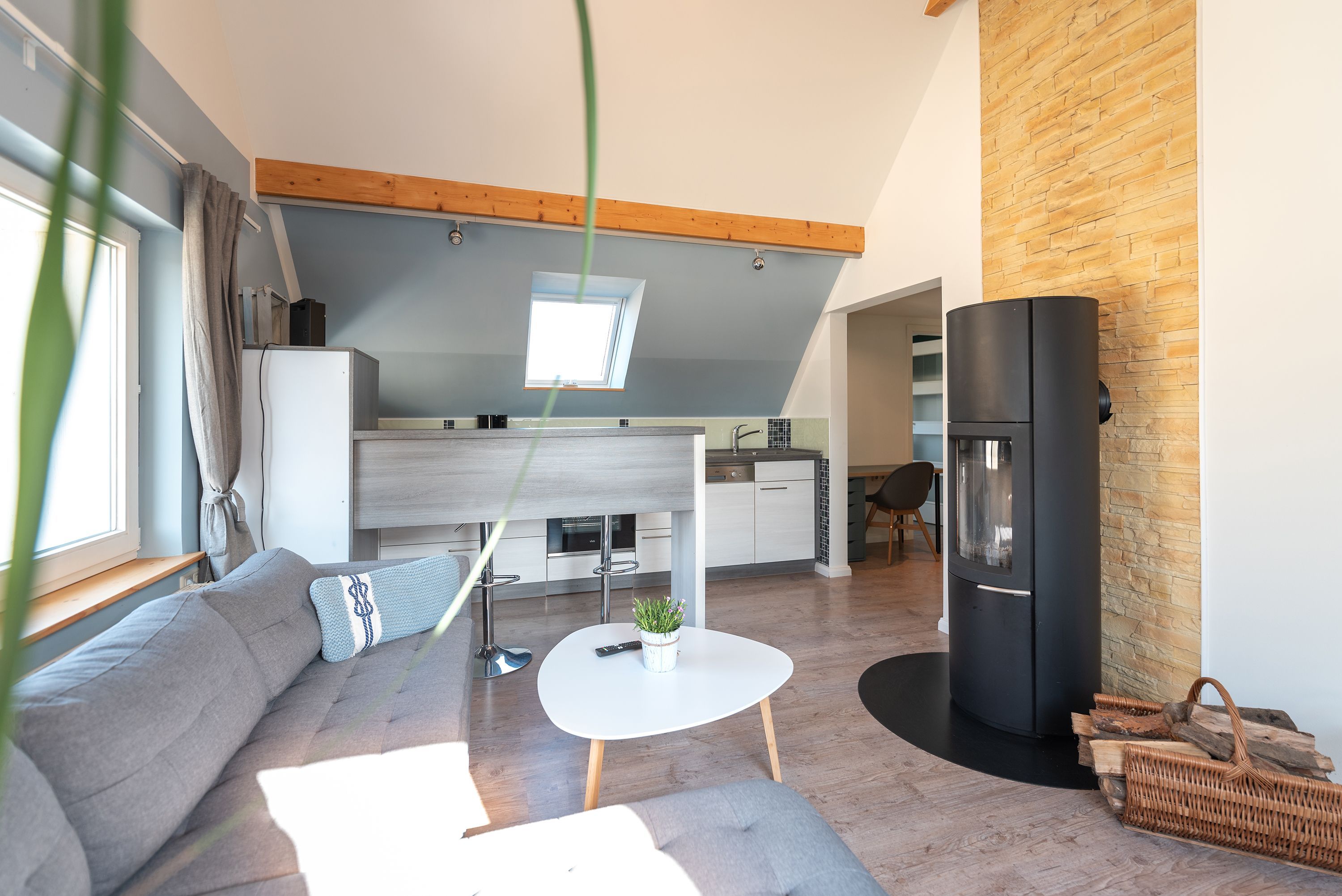 Im Wohnzimmer erwartet die Gäste eine komfortable Couch, die zum Entspannen und Verweilen einlädt. Ein moderner TV und ein Kamin ergänzen das Wohnambiente, schaffen eine warme und heimelige Atmosphäre, die besonders in den kühleren Monaten geschätzt wird. Die offene Küchenzeile, direkt angrenzend an das Wohnzimmer, ist mit allen notwendigen Geräten und Utensilien ausgestattet, die für die Selbstverpflegung benötigt werden. Hier lässt sich problemlos vom schnellen Frühstück bis zum aufwendigen Abendessen alles zubereiten.