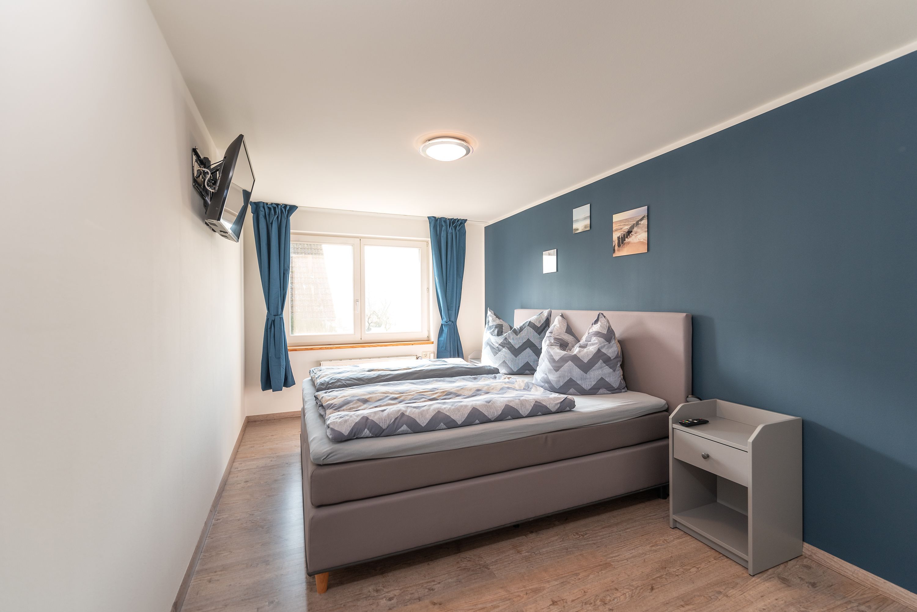 Das Schlafzimmer, ausgestattet mit einem hochwertigen Boxspringbett, Kleiderschrank und TV, verspricht erholsame Nächte und ist eine Oase der Ruhe.