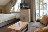 Sowohl das hochwertige Boxspringbett als auch das gemütliche Sofa bieten besten Blick auf den Smart-TV, für wetterunabhängige Unterhaltung zu jeder Jahreszeit. Dazu gibt ein ein Radio mit CD-Player und kostenfreies WLAN.