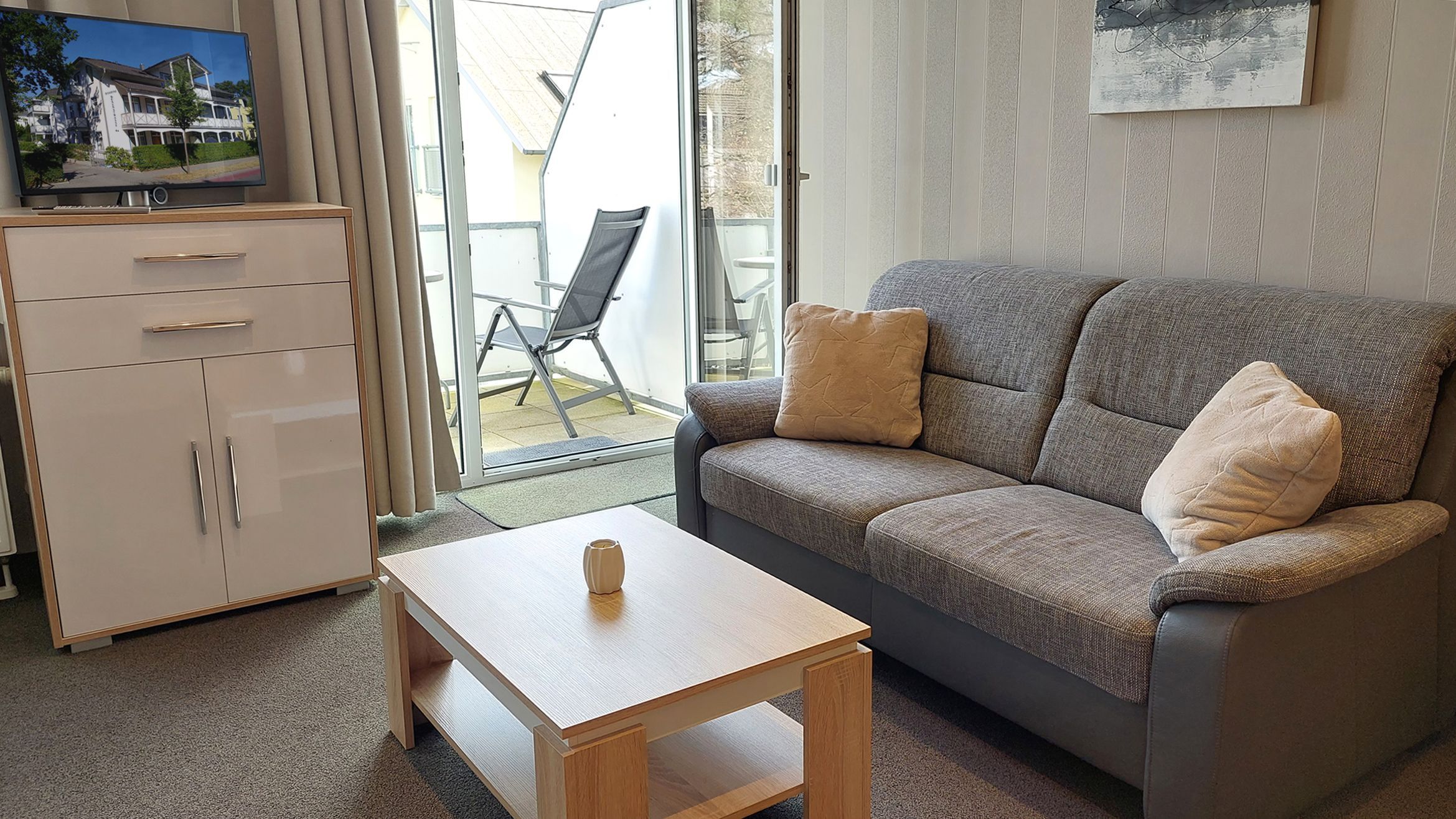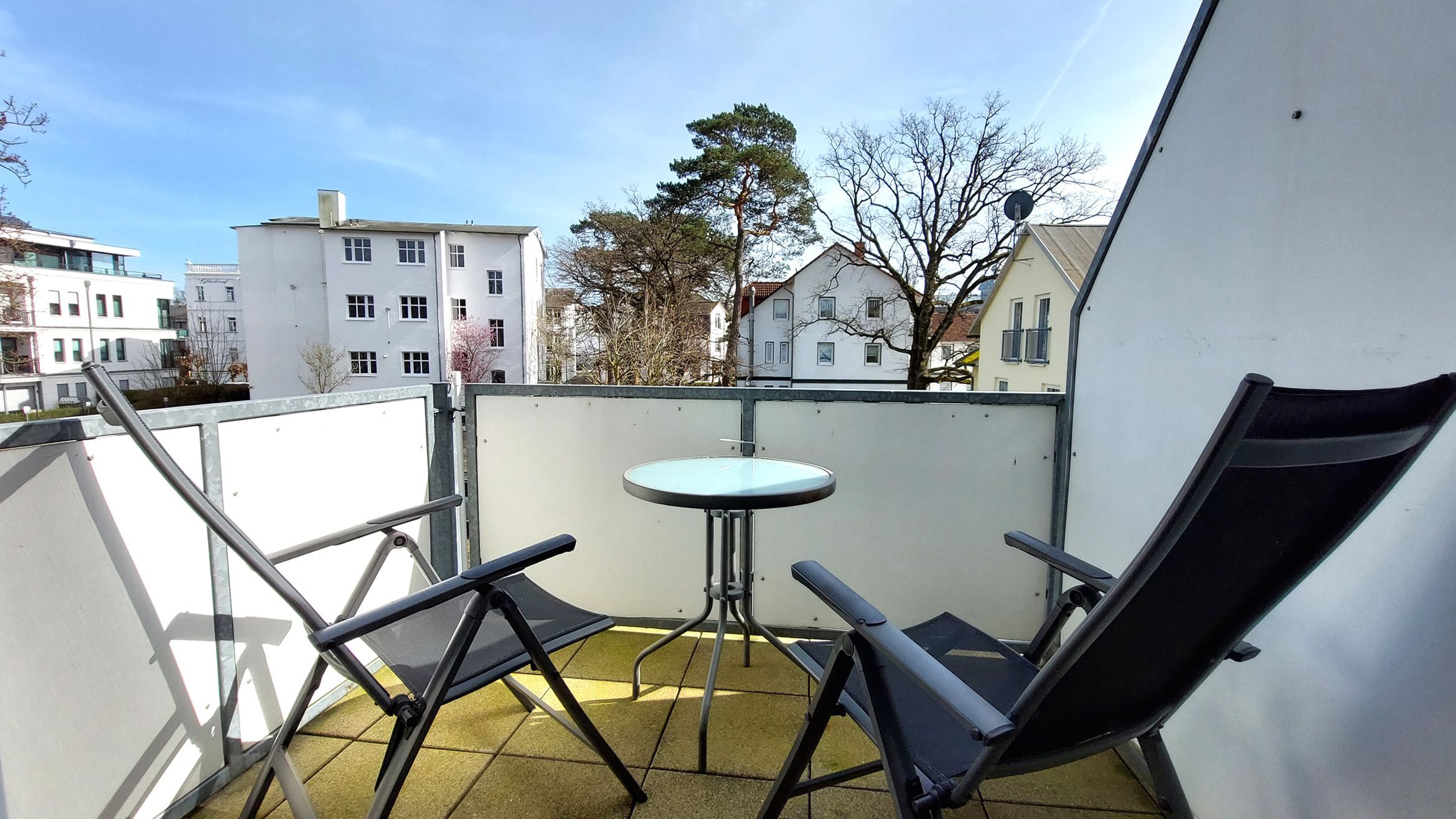 Vom Wohnbereich gelangen Sie auf den möblierten Frühstücksbalkon mit Blick ins Grüne.