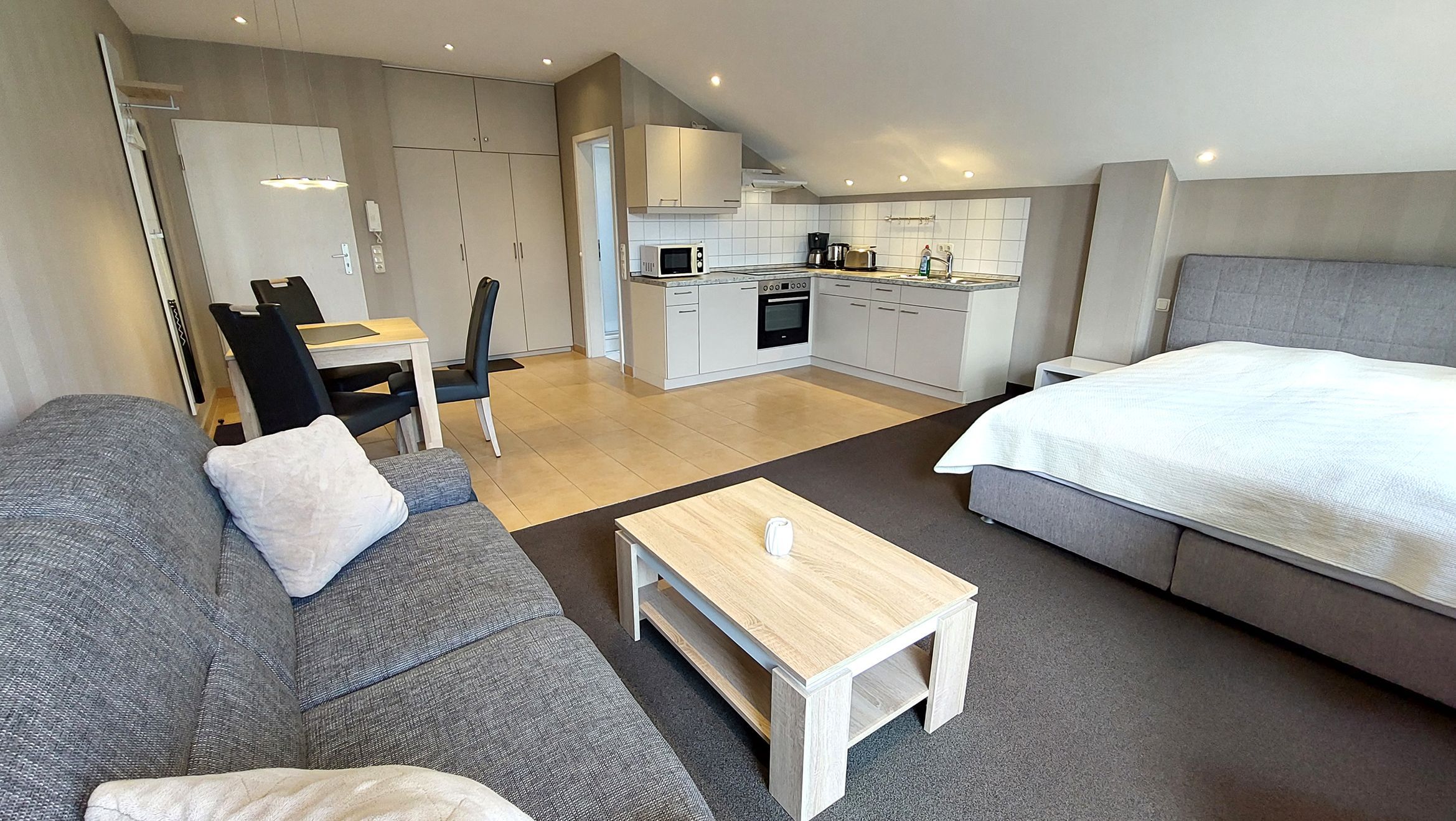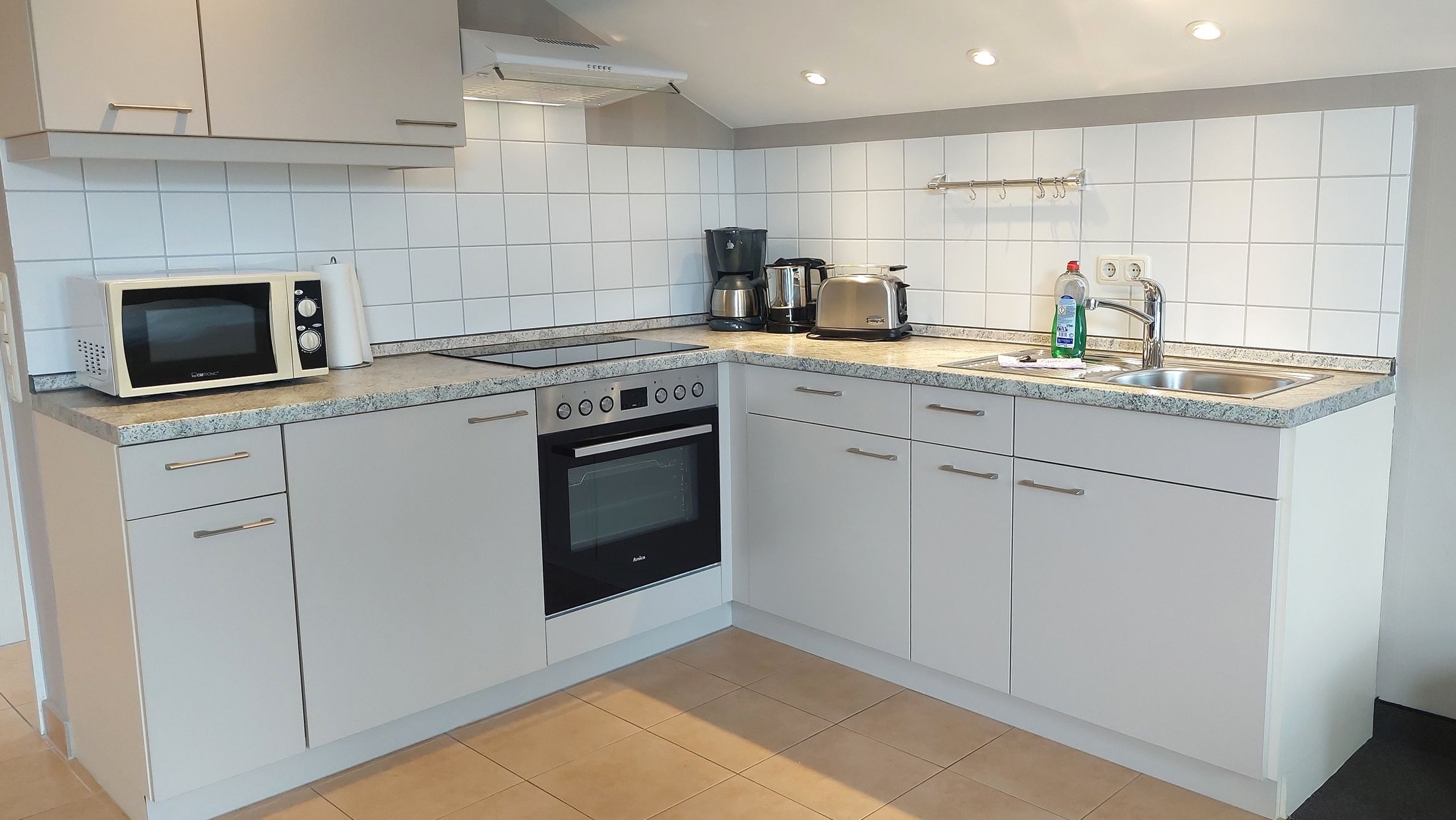 Der Kochbereich bietet einen Backofen, Cerankochfeld, Mikrowelle und ein Kühlschrank mit Gefrierfach. Am Esstisch finden bis zu 3 Personen Platz.