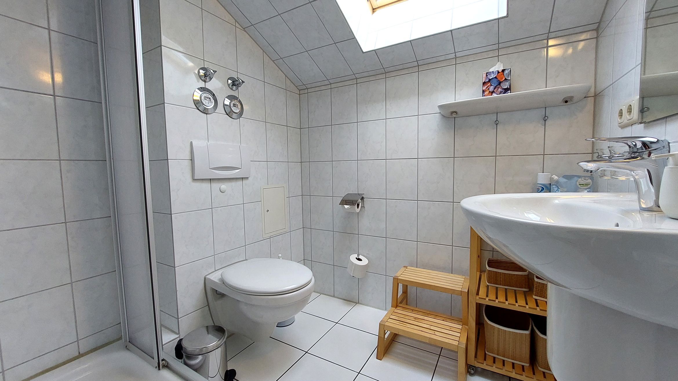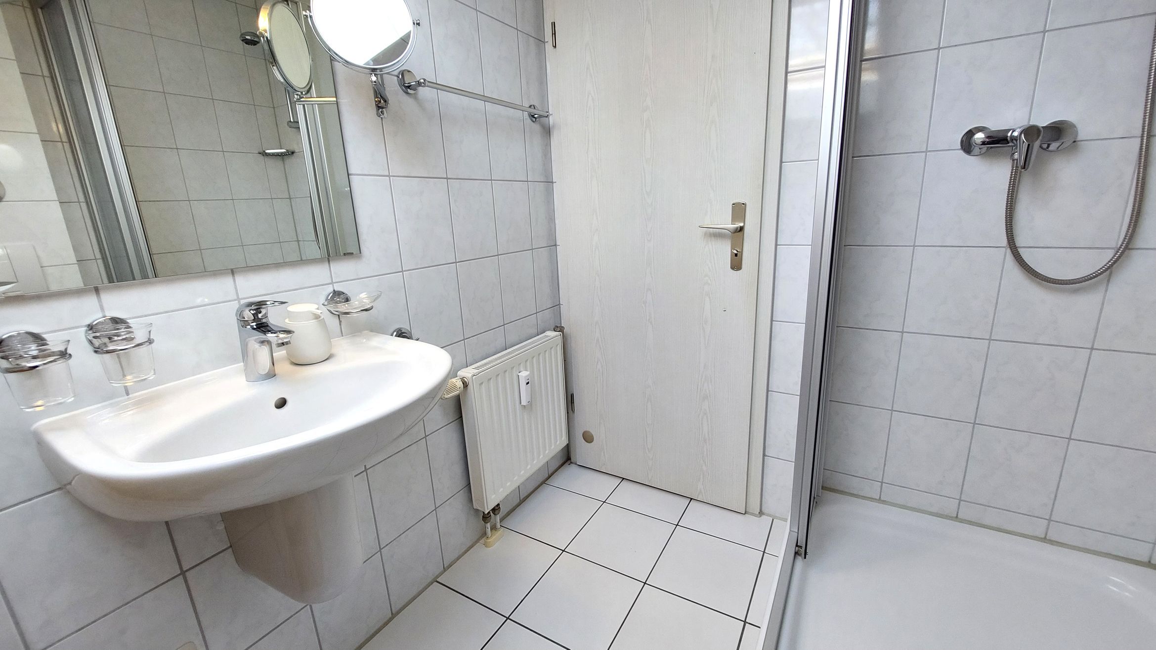 Das Badezimmer verfügt über Dusche und WC sowie einem Vergrößerungskosmetikspiegel.