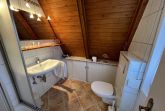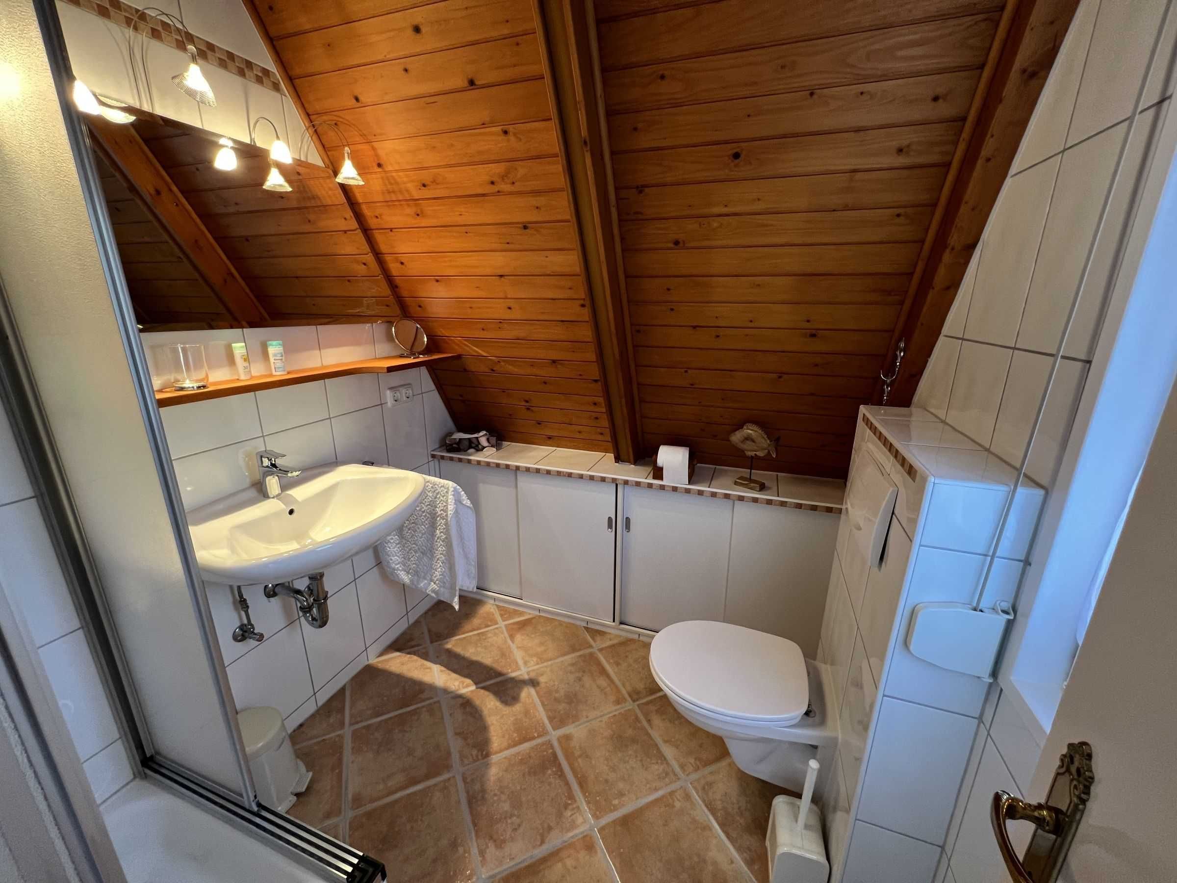 Das Badezimmer im Erdgeschoss verfügt über Dusche, WC, Waschbecken und Fön. Ein Heizkonvektor sorgt für wohlige Wärme. Eine Wasch-Trockner-Kombination ist im angrenzenden Abstellraum vorhanden.
