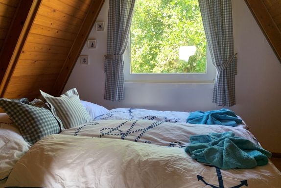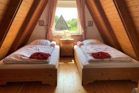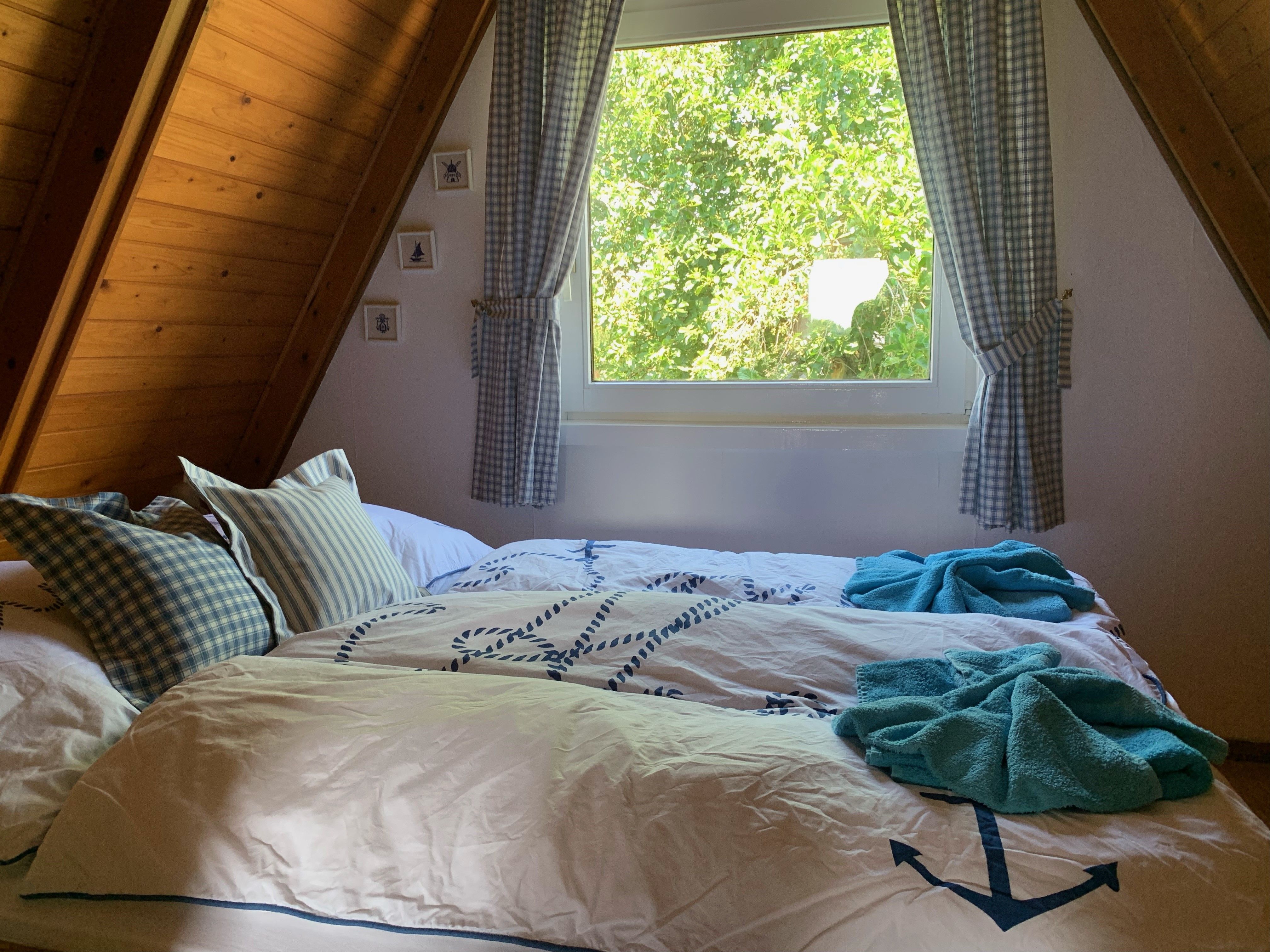 Ein Schlafzimmer im Obergeschoss verfügt über zwei Einzelbetten, die sich auch zusammenschieben lassen, während das andere Schlafzimmer über ein Doppelbett (1,40m x 2,00m) verfügt.