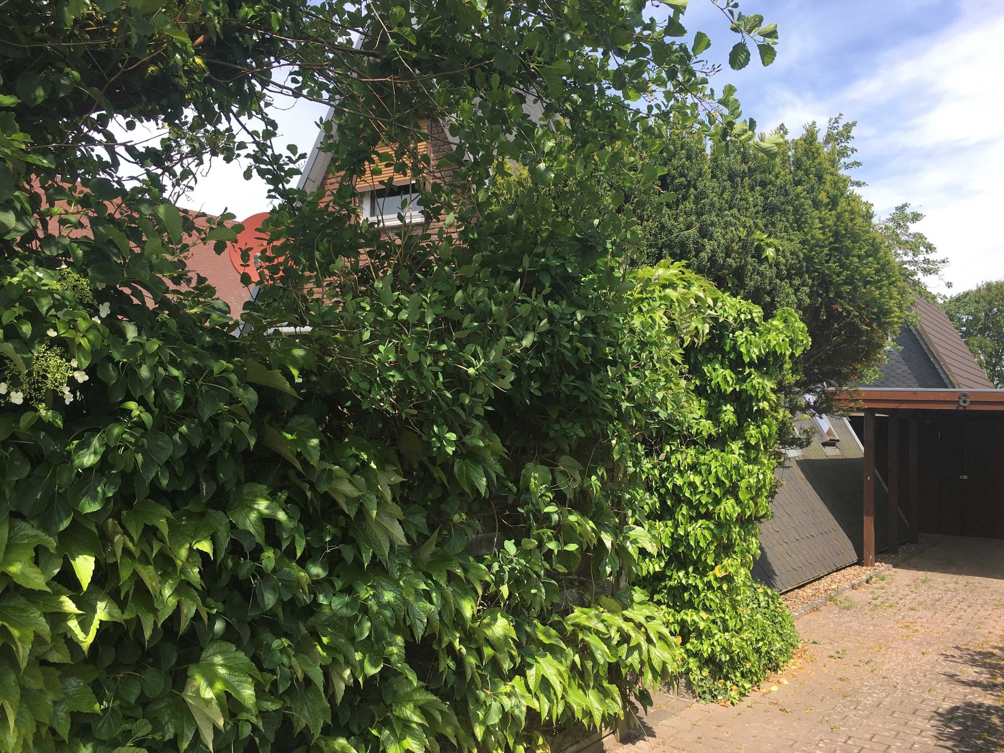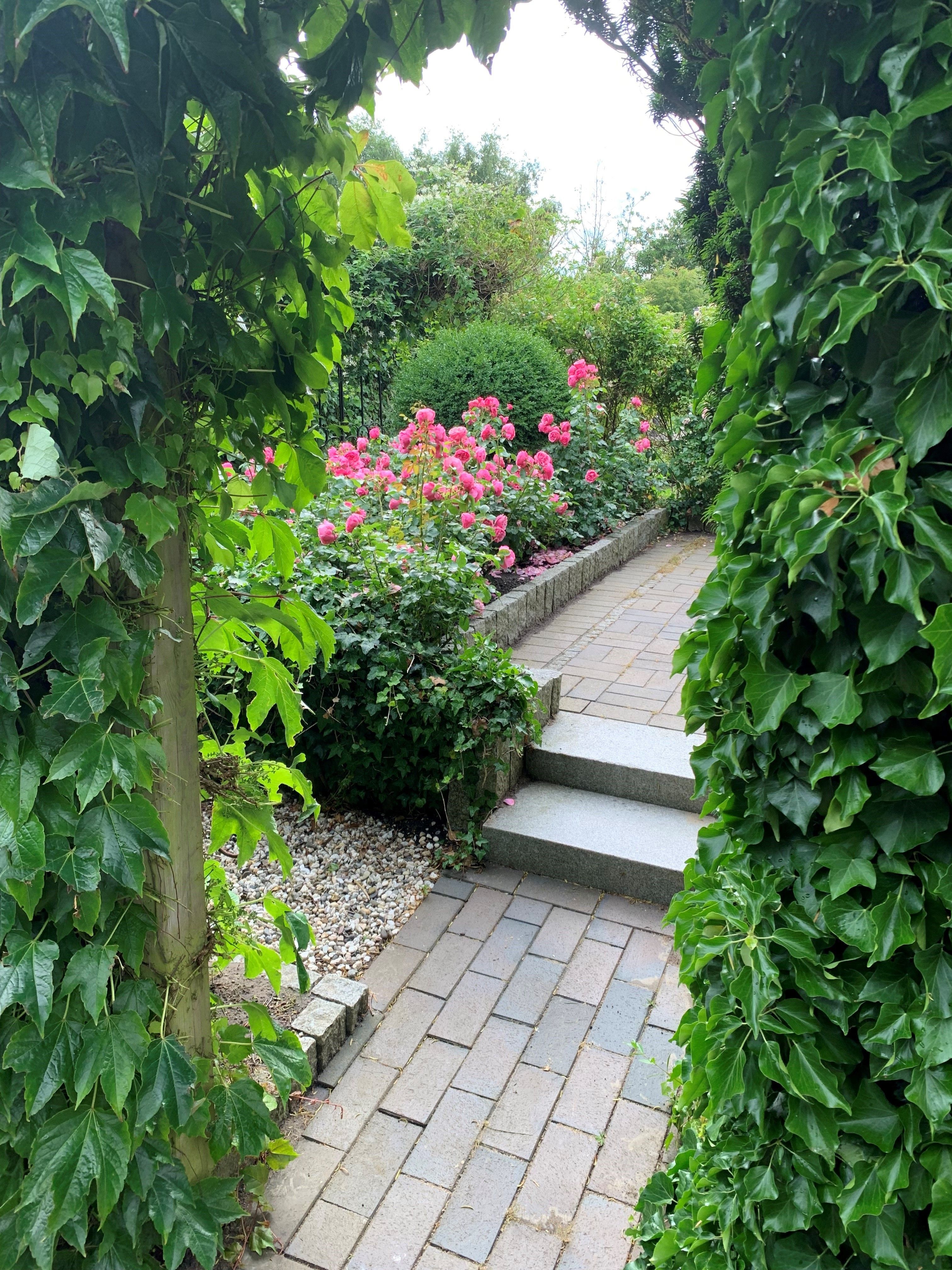 Auf der einladenden Terrasse im Rosengarten lädt eine Sitzgarnitur zum Verweilen ein. Zum Haus gehört eine Auffahrt mit Parkmöglichkeit und ein Geräteschuppen.