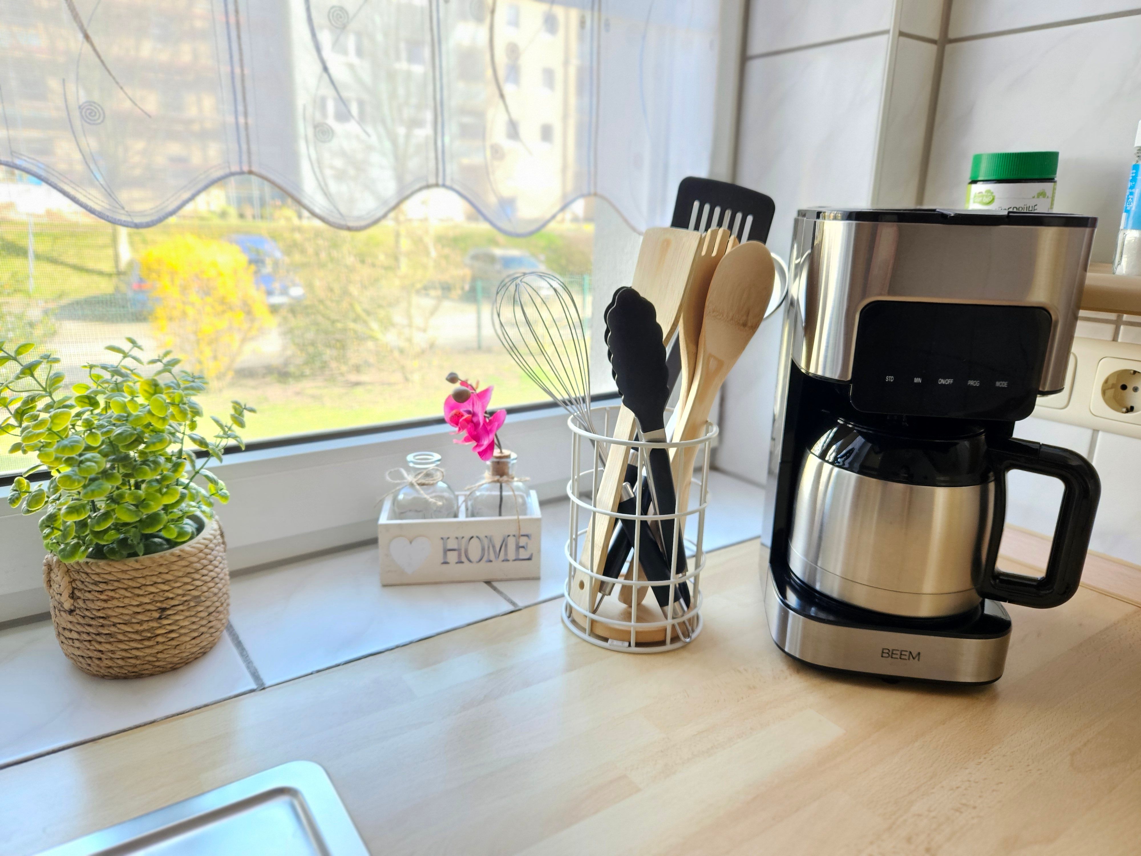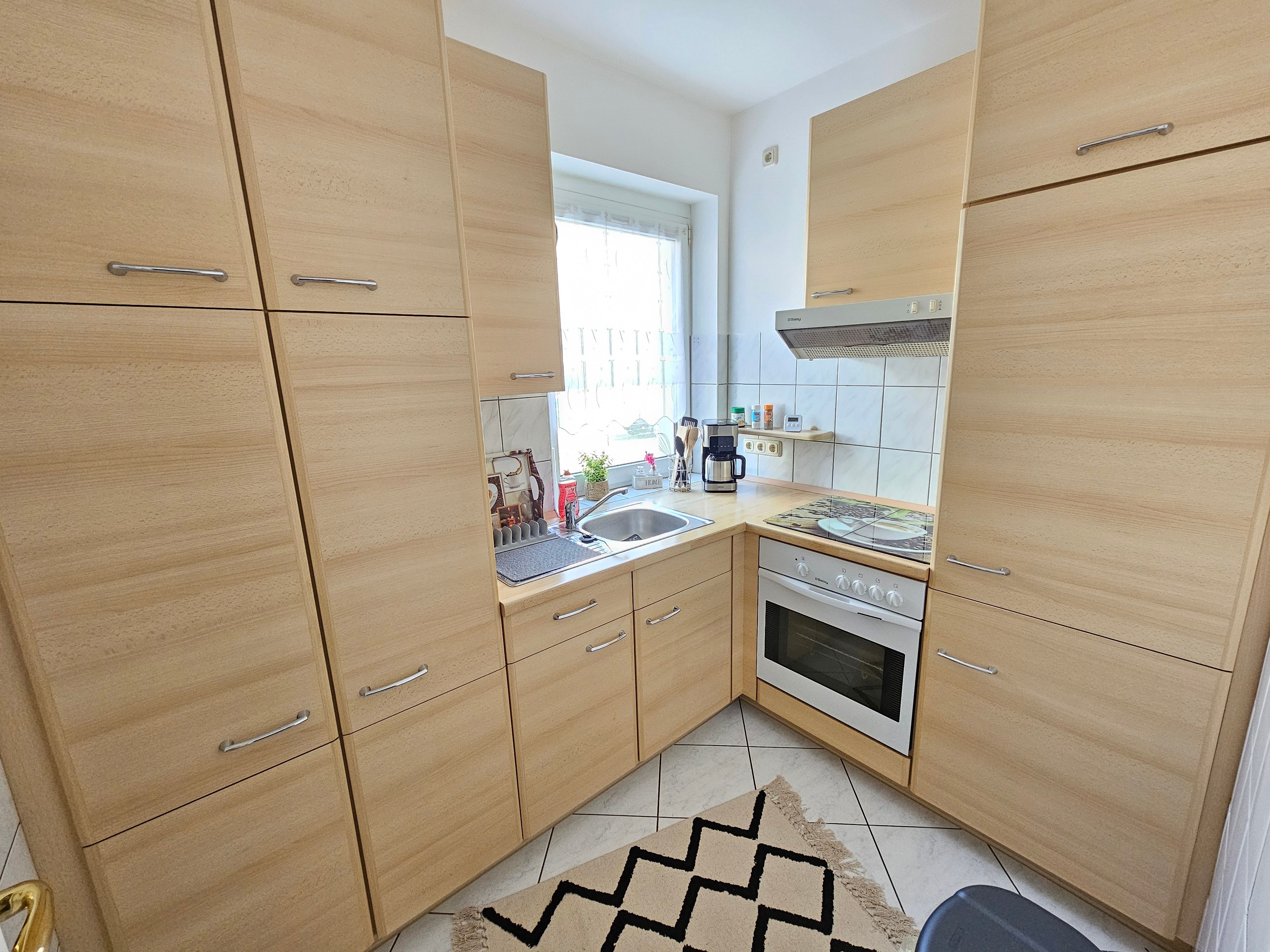 Die im Hochparterre gelegene Wohnung empfängt Sie mit einem gemütlichen Wohn-/Esszimmer sowie einer gut ausgestatteten separaten Küche (Backofen, 4-Zonen-Cerankochfeld, Mikrowelle, Kaffeemaschine, Toaster, Wasserkocher).