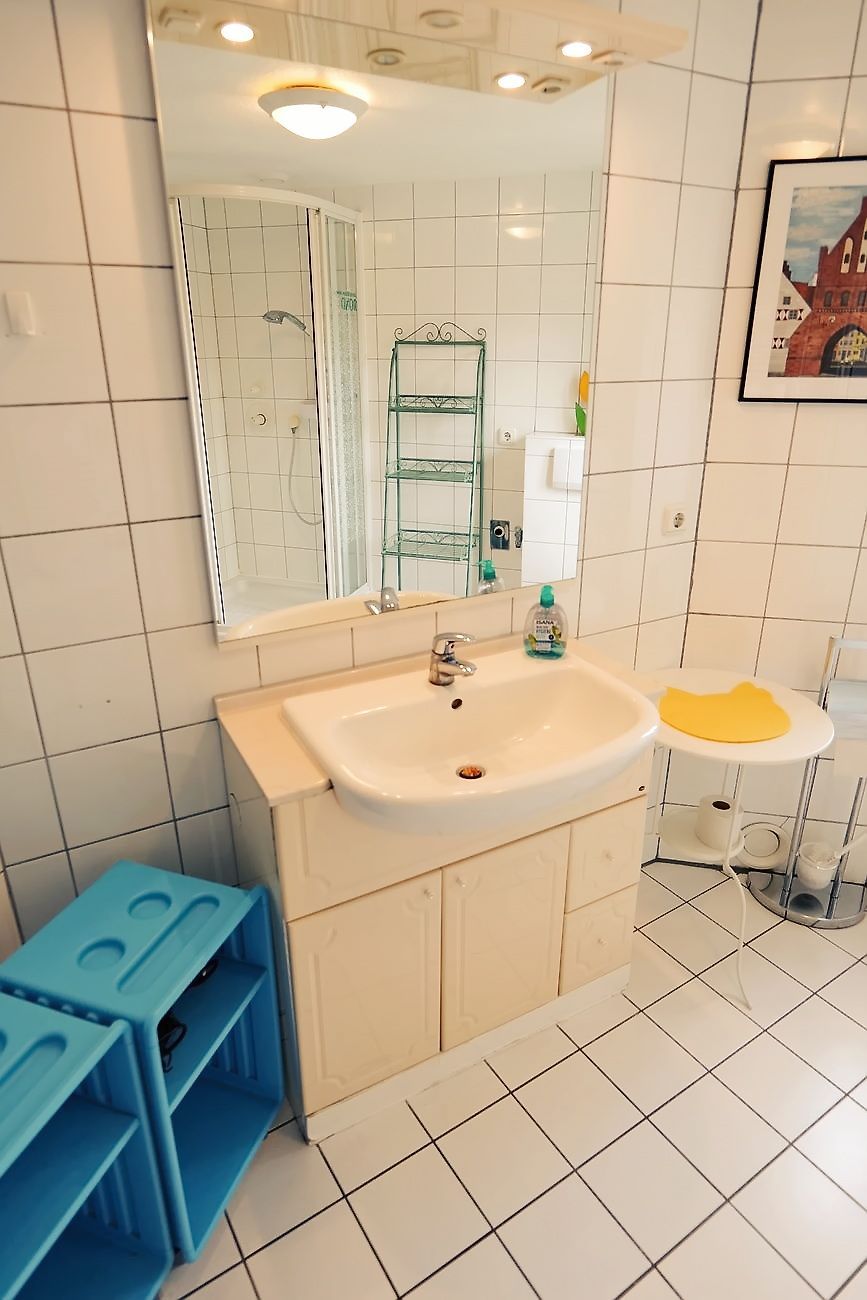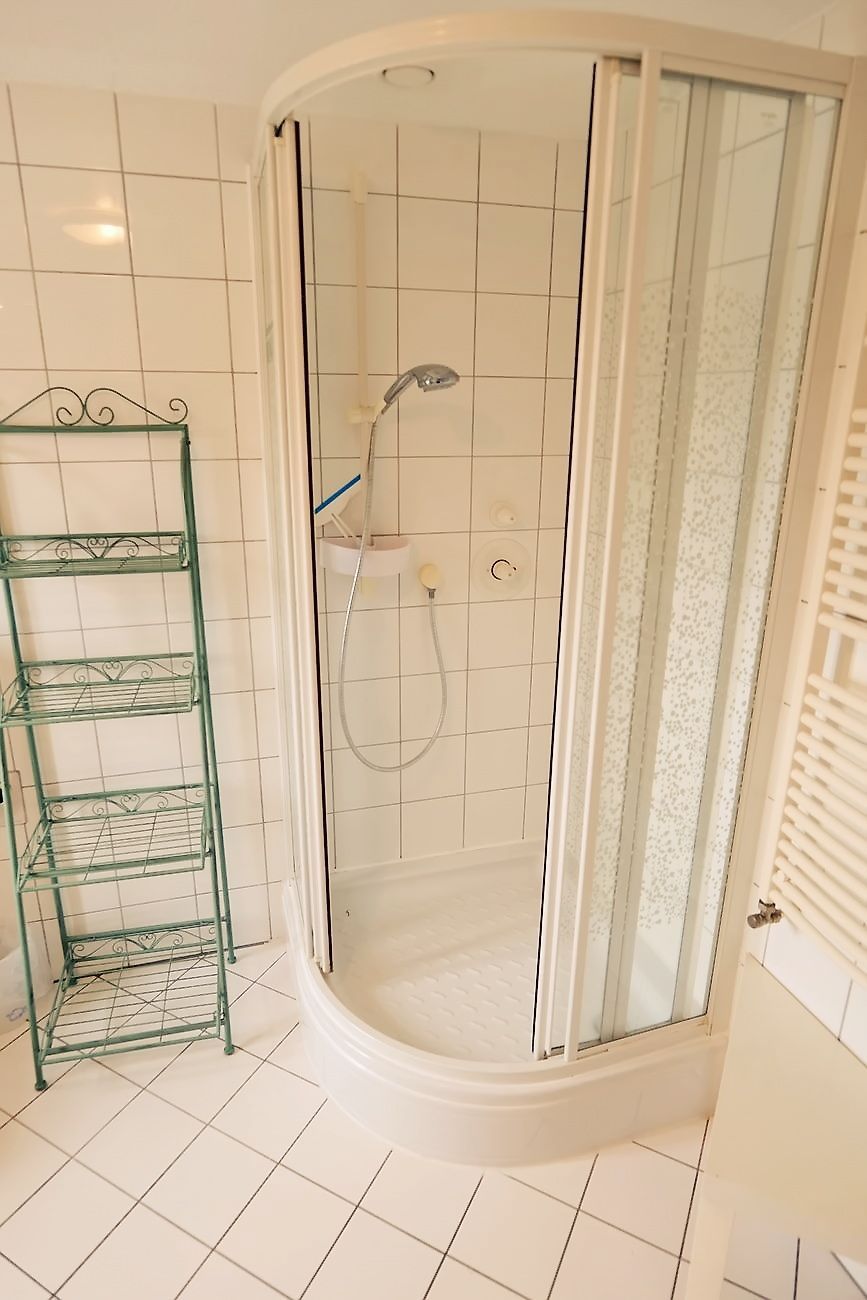 - Badezimmer mit Dusche, WC, Waschmaschine und Trockner, Spiegel und Ablage (Fön)