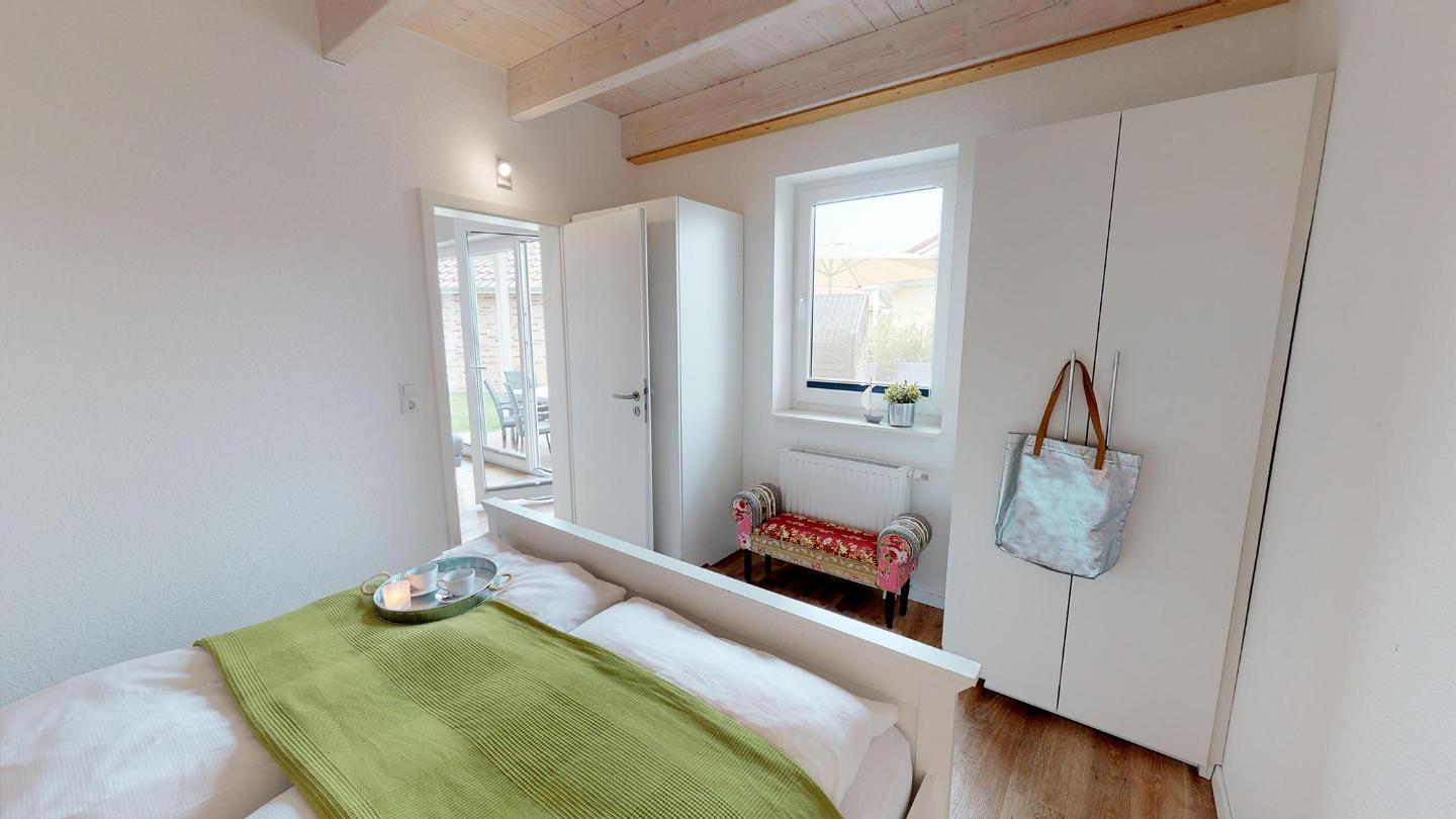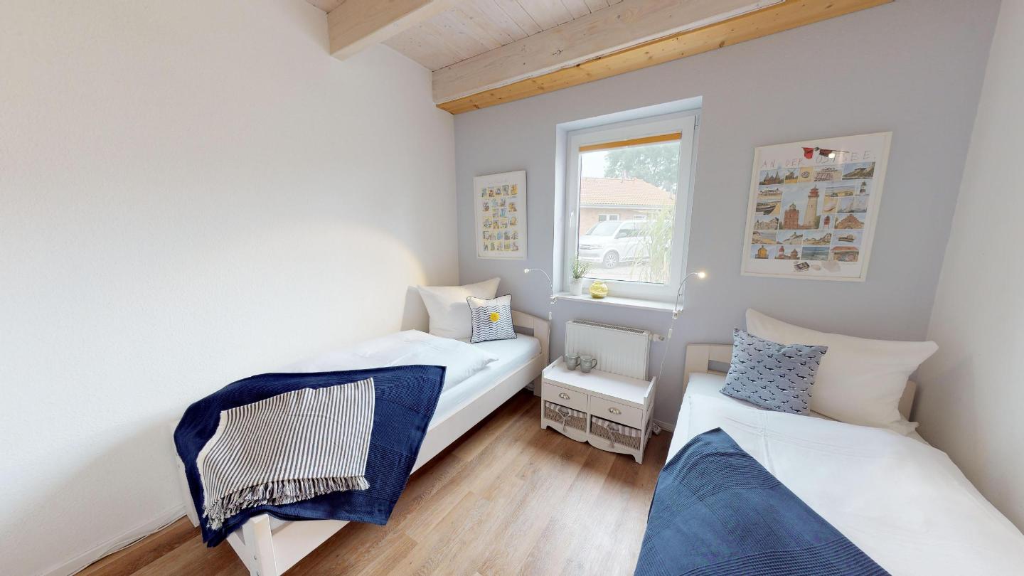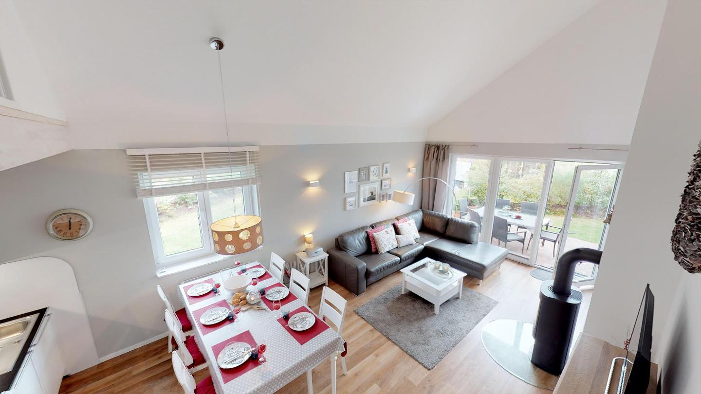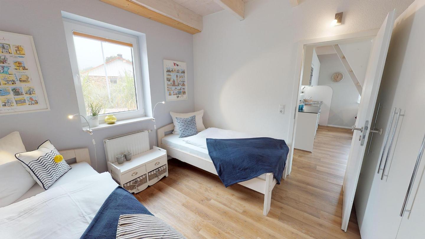 Das Erdgeschoss teilt sich in den Ess- und Wohnbereich mit Einbauküche, Esstisch, Sofa, TV und Kaminofen auf. Daran grenzen zwei Schlafzimmer (einmal mit Doppelbett, einmal mit zwei Einzelbetten) und ein Duschbad. Ein Gäste-WC ist ebenfalls vorhanden. Auf der Empore des Dachgeschosses finden Sie vor dem Kinderzimmer mit zwei Einzelbetten, Babybett und TV eine kleine, gemütliche Leseecke.