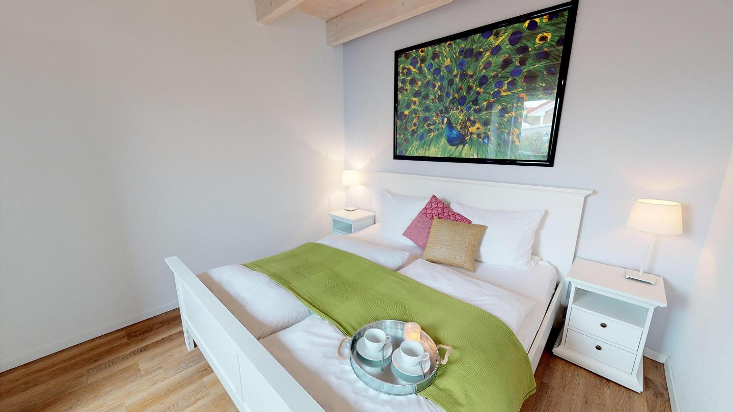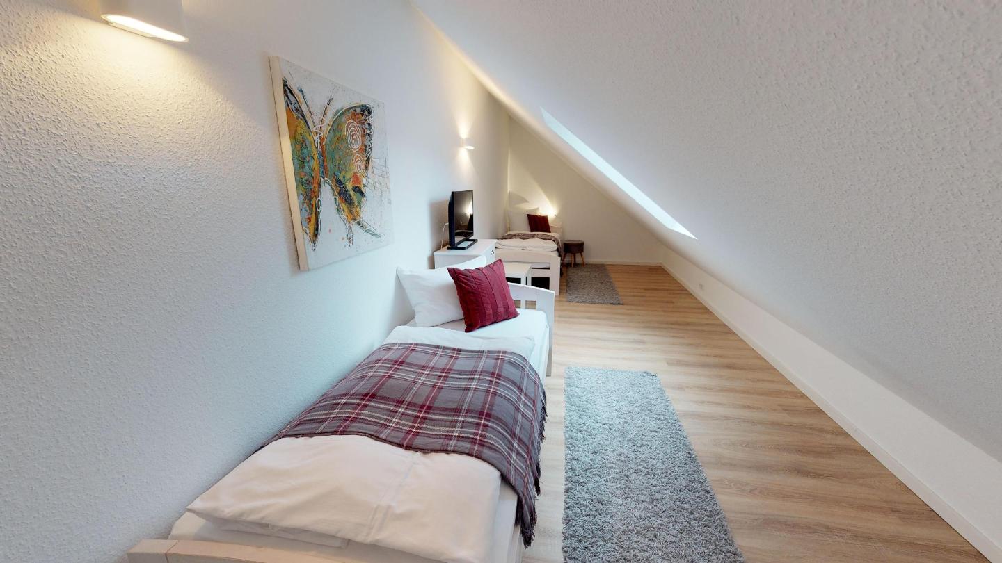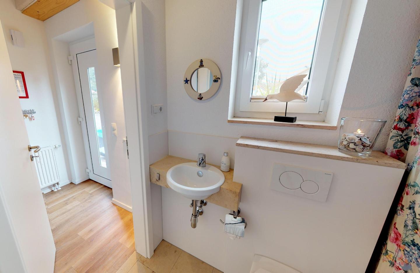 Das Erdgeschoss teilt sich in den Ess- und Wohnbereich mit Einbauküche, Esstisch, Sofa, TV und Kaminofen auf. Daran grenzen zwei Schlafzimmer (einmal mit Doppelbett, einmal mit zwei Einzelbetten) und ein Duschbad. Ein Gäste-WC ist ebenfalls vorhanden. Auf der Empore des Dachgeschosses finden Sie vor dem Kinderzimmer mit zwei Einzelbetten, Babybett und TV eine kleine, gemütliche Leseecke.