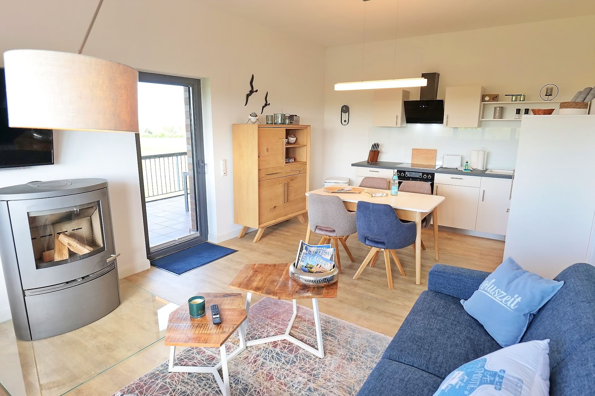 - großes Wohnzimmer mit offener Küche und Essbereich, ua. mit Couch (ausziehbar zur Schlafcouch mit Lattenrost), Flat-TV, Kamin, Wohnzimmertisch, Highboard, Internetradio