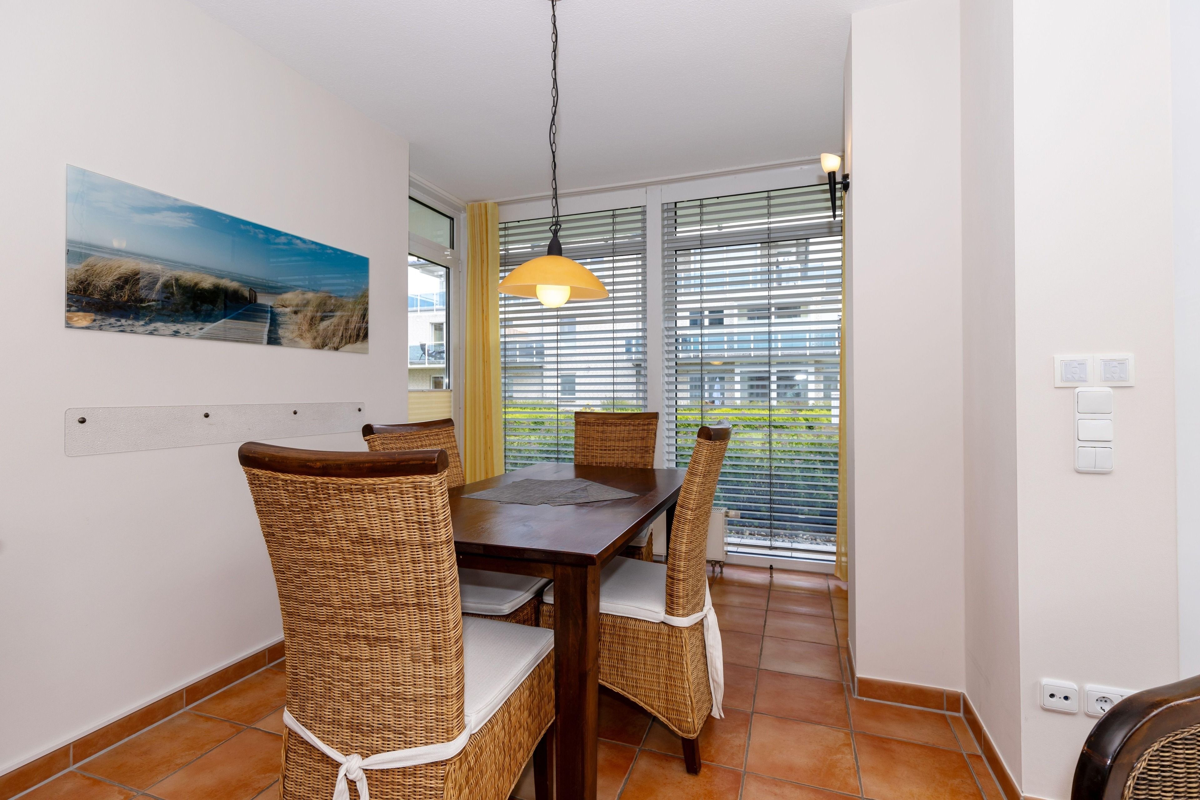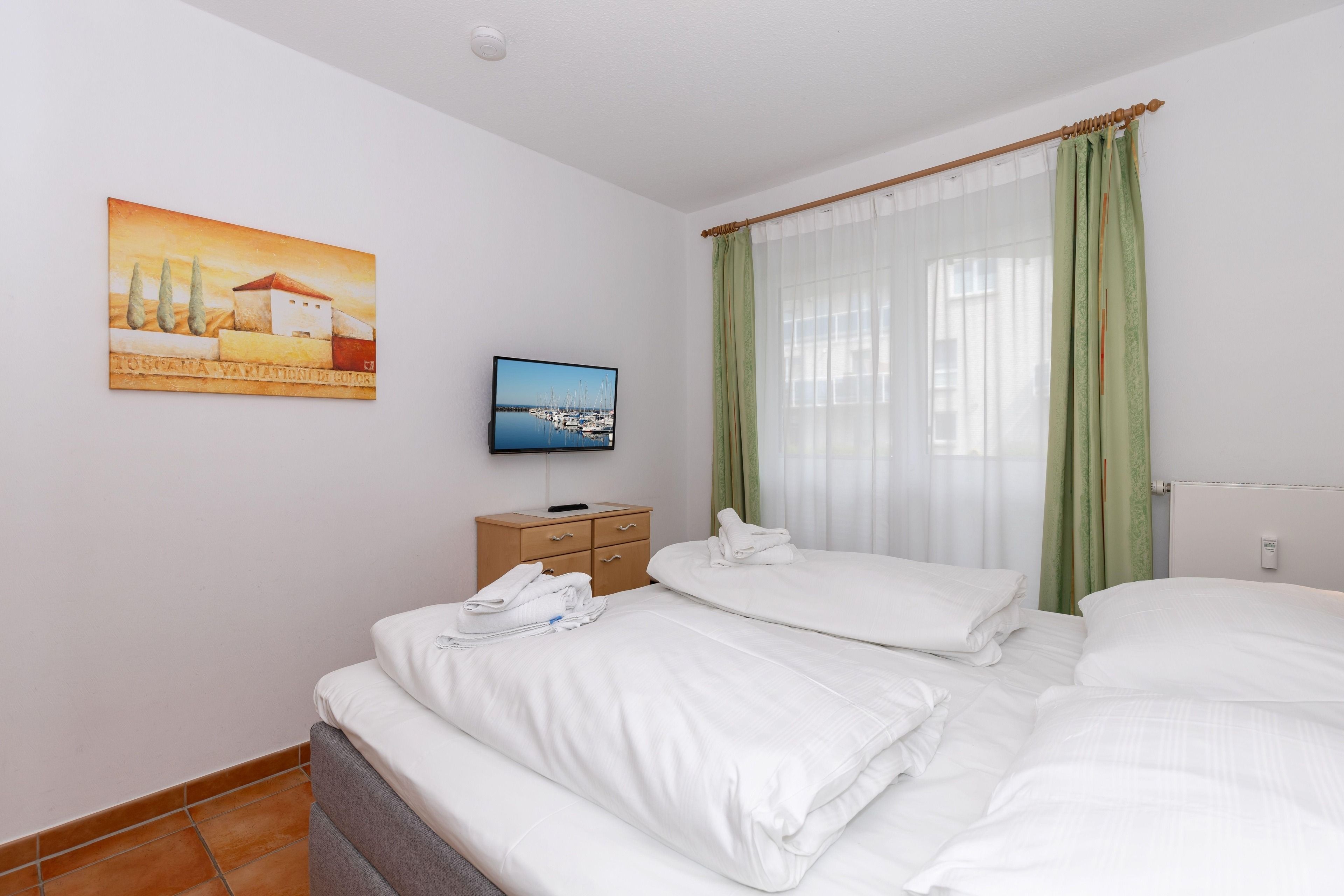 Die 61 m² große Wohnung für 3 Personen befindet sich im Erdgeschoss und verfügt über einen problemfreien ebenerdigen Zugang mit Süd-Ost-Terrasse, die einen schönen Blick über den Yachthafen und das Meer ermöglicht.