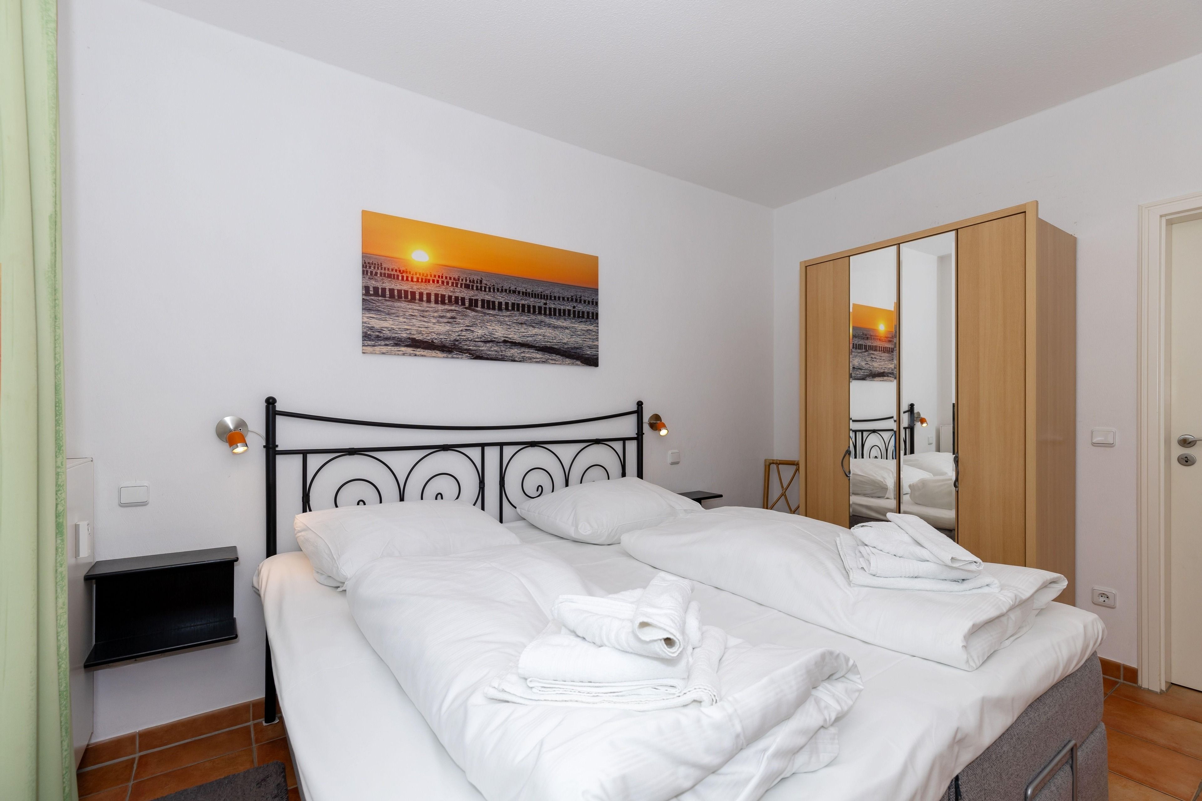Das Schlafzimmer ist mit einem hochwertigen Boxspringbett, einem geräumigen Kleiderschrank, Verdunklungsvorhängen und einem Zweitfernseher (32 Zoll) ausgestattet und besitzt ebenfalls einen direkten Zugang zur Terrasse.