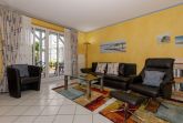 Das geräumige, freundlich gestaltete Wohnzimmer bietet neben ausreichenden Sitzgelegenheiten auch eine ausziehbare Ledercouch, einen gemütlichen Relaxsessel, eine kleine Bibliothek, Kabel-TV und Blue-Ray-Player.