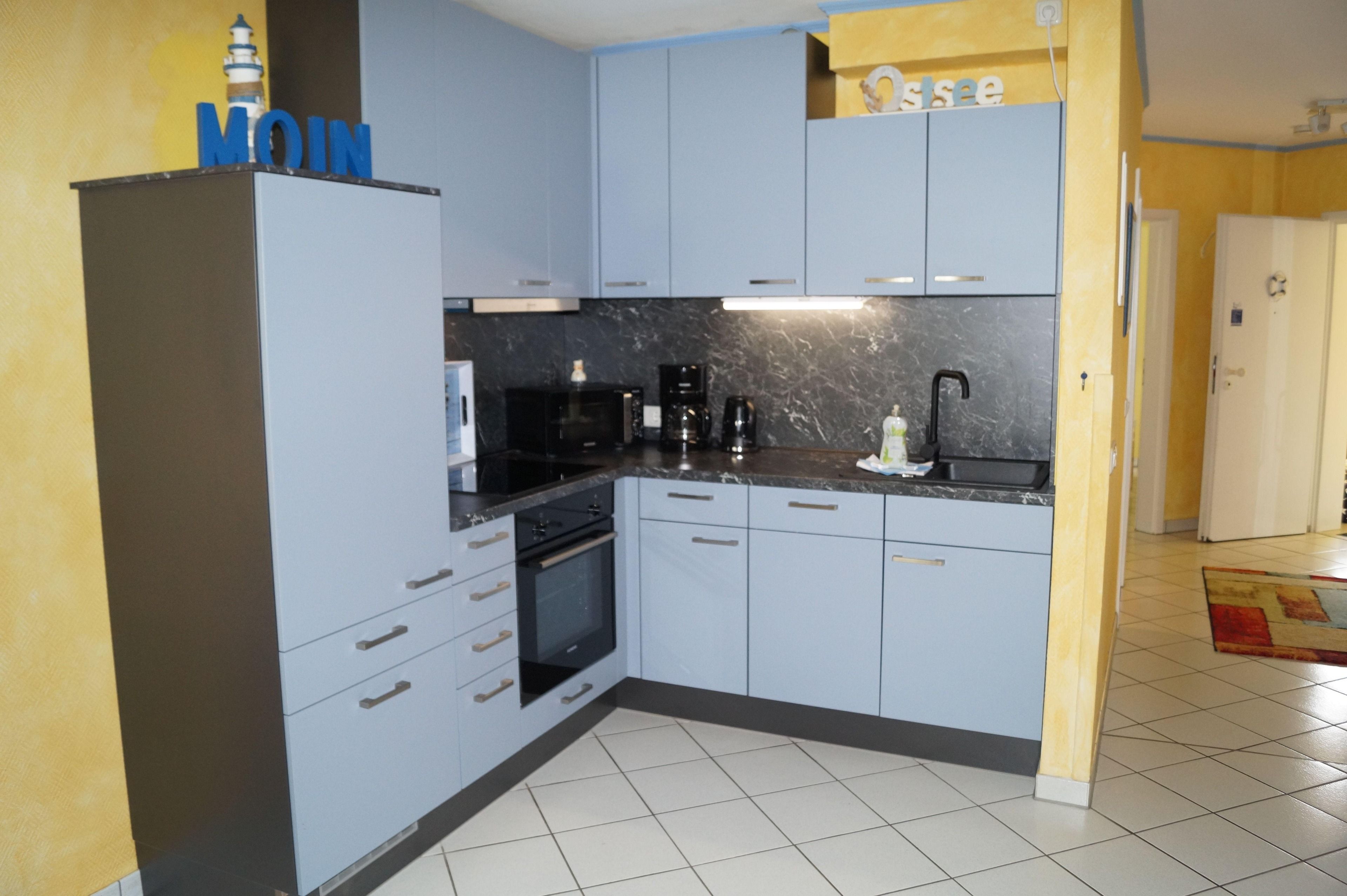 Die integrierte Küche verfügt über ein 4-Zonen-Ceran-Kochfeld, Spülmaschine, Mikrowelle, Kühlschrank mit Gefrierfach & viel Geschirr und Töpfe. Hier müssen Sie auf nichts verzichten.