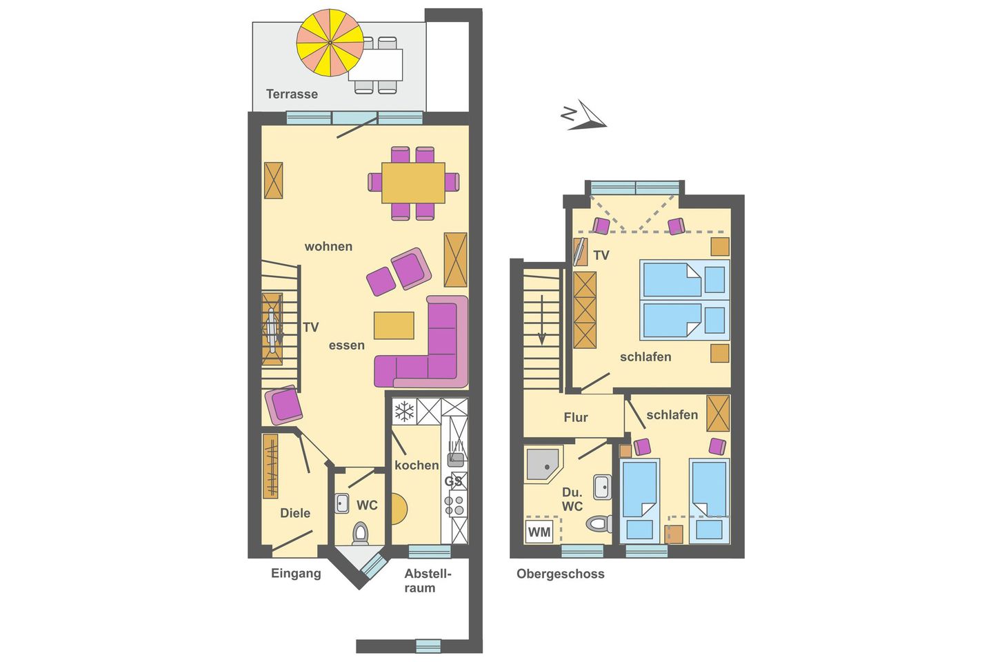 Im Erdgeschoss lädt der helle Wohnbereich mit gemütlicher Sitzgruppe, TV und DVD-Player zum Verweilen ein. Am Esstisch finden vier Personen bequem Platz. Die angrenzende, gut ausgestattete Küche verfügt über Herd, Backofen, Mikrowelle, Kühlschrank mit Gefrierfach, Dunstabzugshaube und Geschirrspüler – ideal für gemeinsame Kochabende. Zusätzlich stehen ein Gäste-WC und ein praktischer Garderobenbereich zur Verfügung.