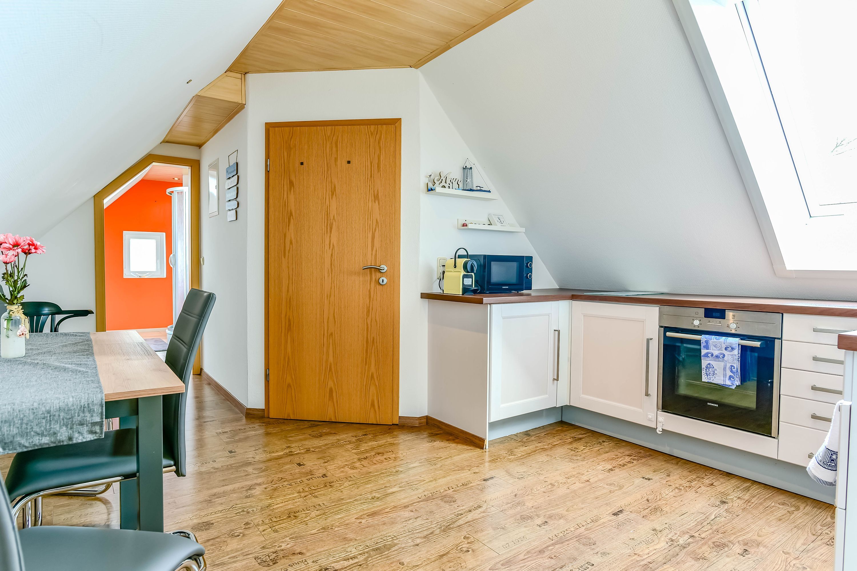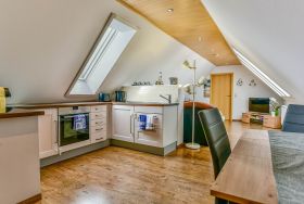 Die Küchenzeile ist komplett ausgestattet mit einem Kühlschrank, einer Mikrowelle, einem Induktionskochfeld, Töpfen, Pfannen und Besteck. Ein Wasserkocher für heiße Getränke und eine Espressomaschine für köstlichen Kaffee stehen ebenfalls zur Verfügung. Und für die schnellen Snacks der Kinder gibt es natürlich auch einen Toaster.