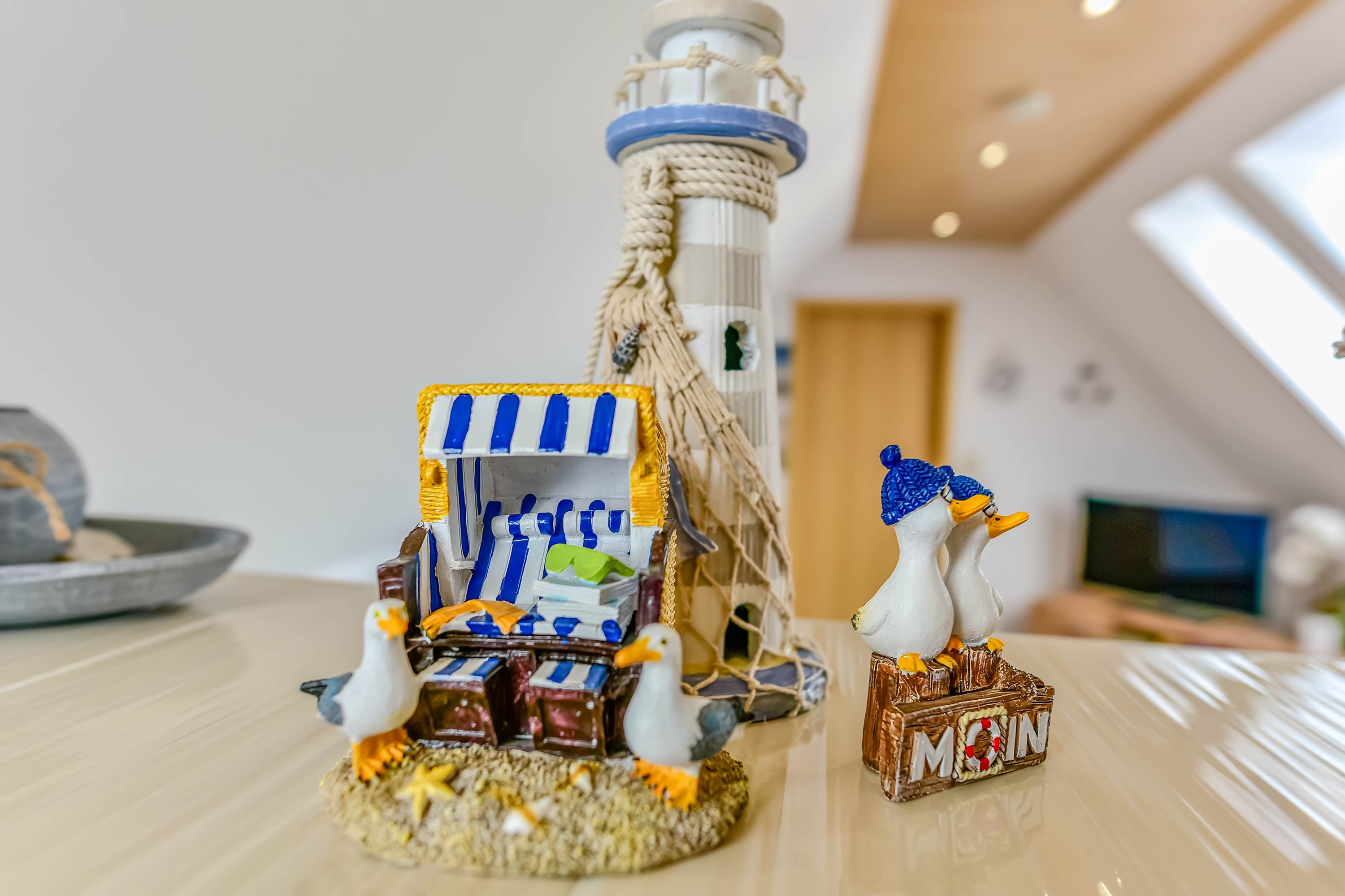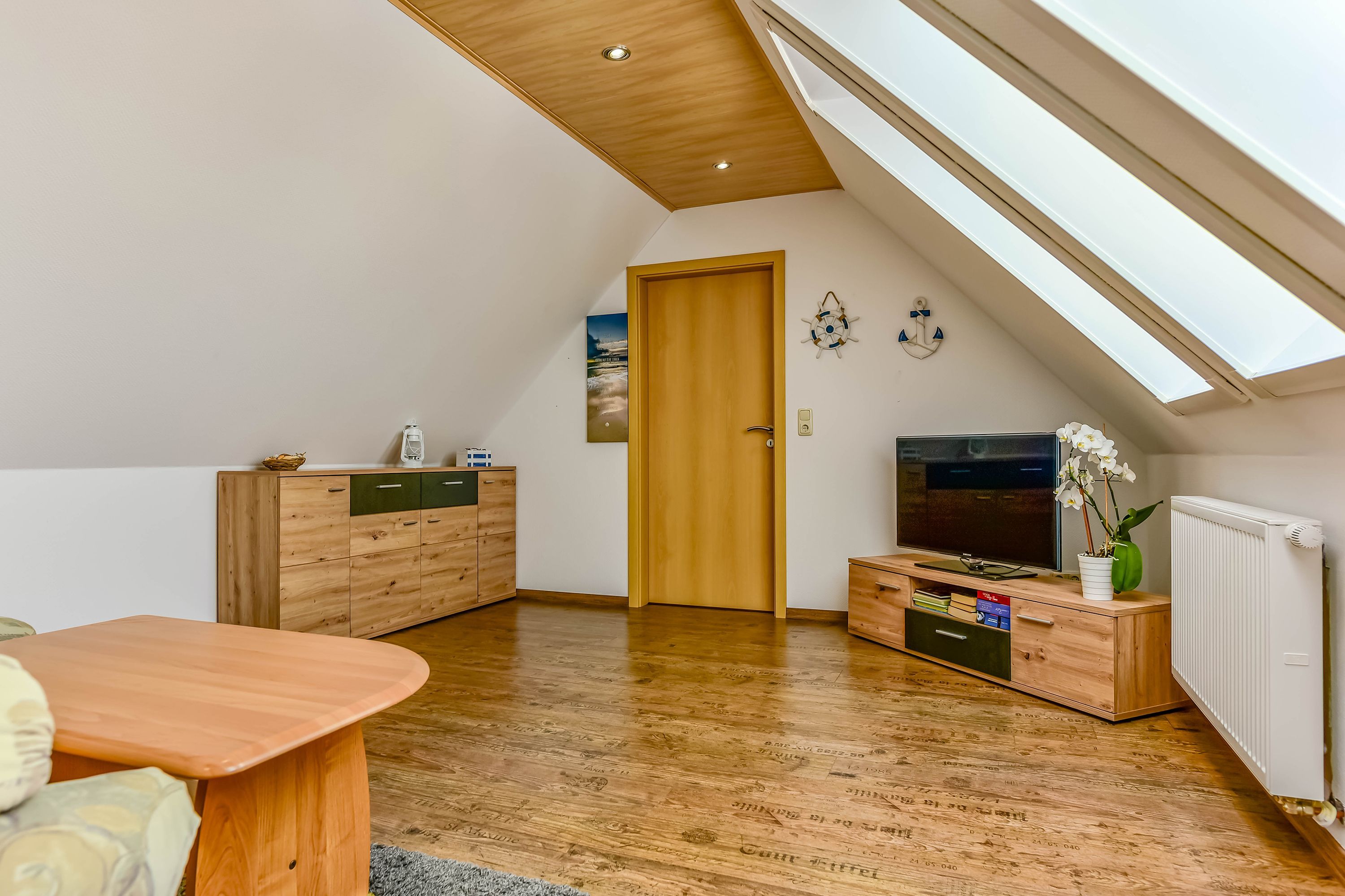 Das Wohnzimmer ist mit maritimen Accessoires in hellen Farben dekoriert, was der Wohnung eine gleichzeitig gemütliche und elegante Atmosphäre verleiht. Hier findest du ein Sofa zum Entspannen und Schlafen sowie alles, was du für deinen Aufenthalt benötigst. Das Schlafzimmer bietet ein geräumiges Doppelbett und im Kinderzimmer stehen weitere Betten für die kleinen Gäste bereit.