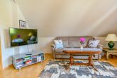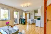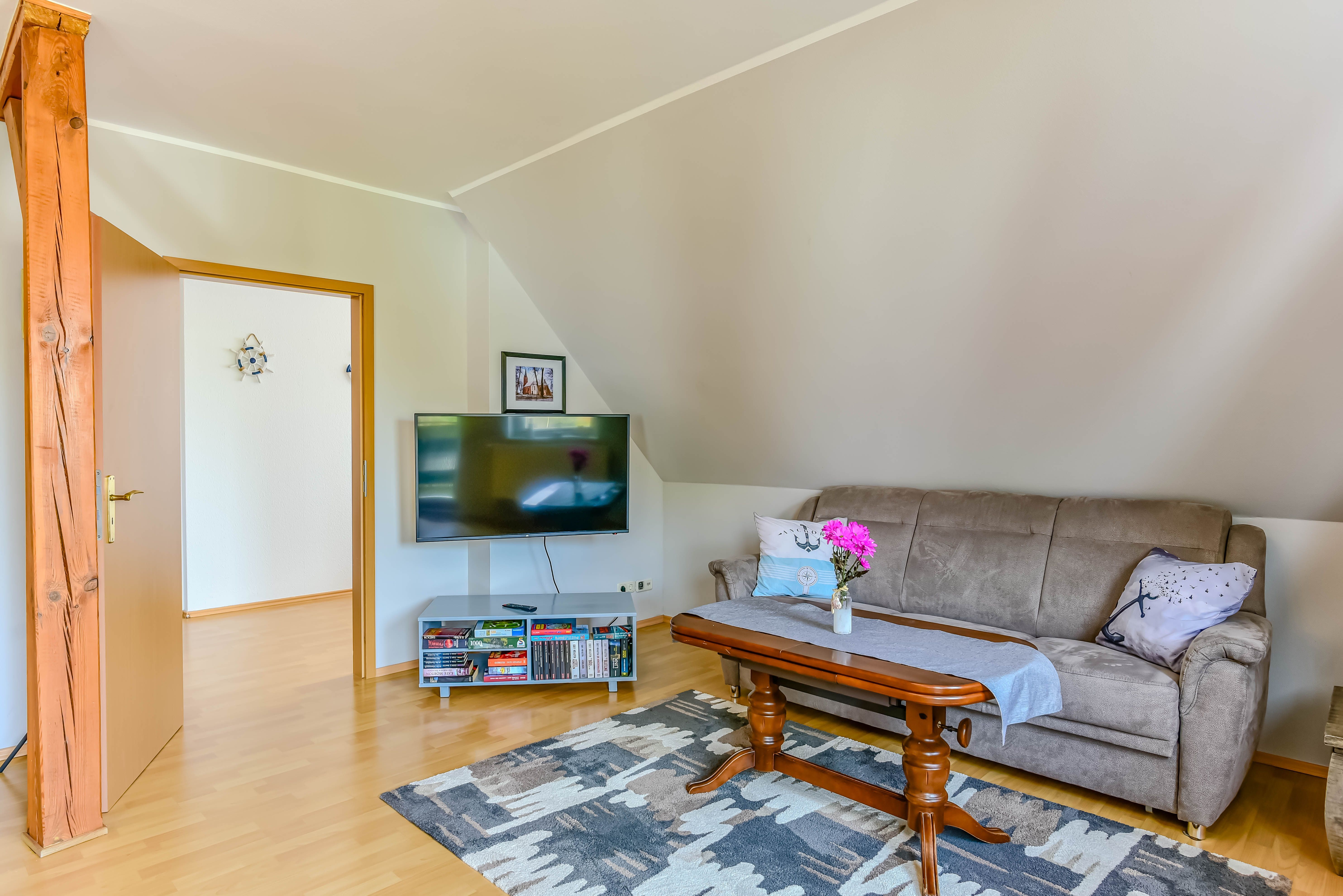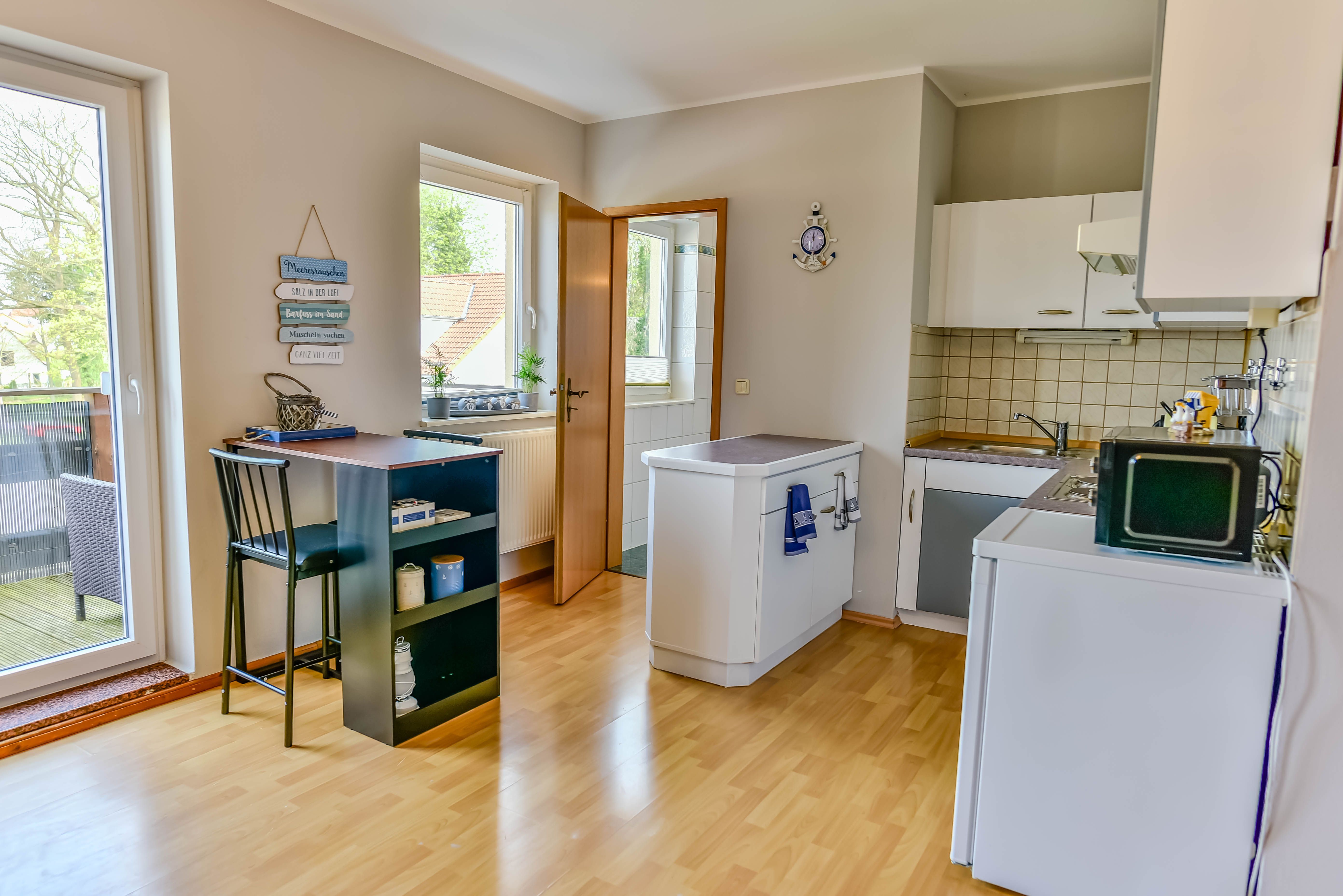 Im Wohnzimmer schaffen helle Farben und maritime Dekoration eine gleichzeitig gemütliche und elegante Atmosphäre. Hier findest du ein Sofa zum Entspannen und Schlafen sowie alles, was du für einen angenehmen Aufenthalt benötigst. Die Küchenzeile ist komplett ausgestattet mit einem Kühlschrank, einer Mikrowelle, einem Induktionskochfeld, Töpfen, Pfannen und Besteck. Du kannst dir heiße Getränke mit dem Wasserkocher zubereiten oder einen köstlichen Kaffee aus der Espressomaschine genießen. Und für die Kleinen gibt es sogar einen Toaster für schnelle Snacks.