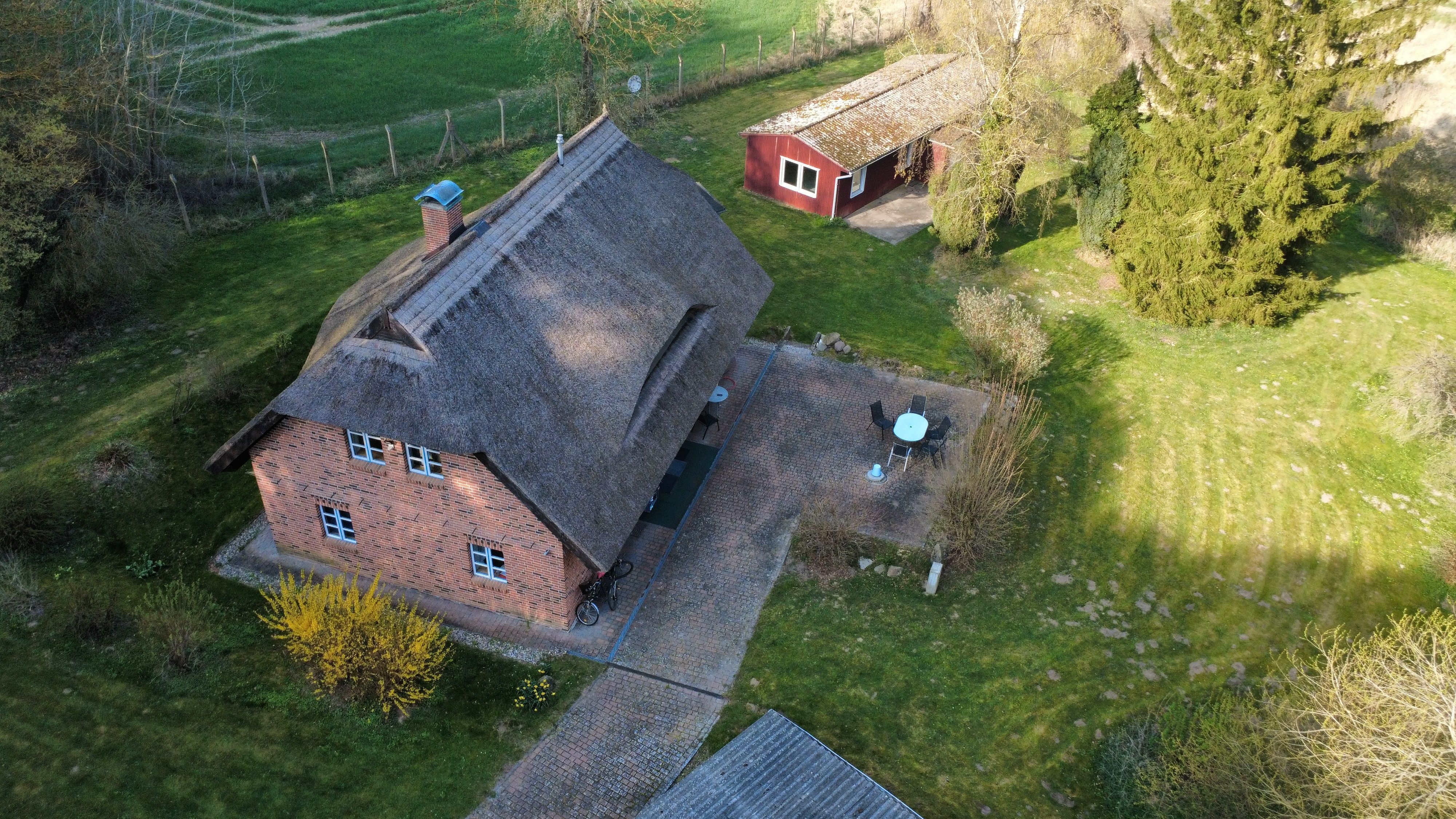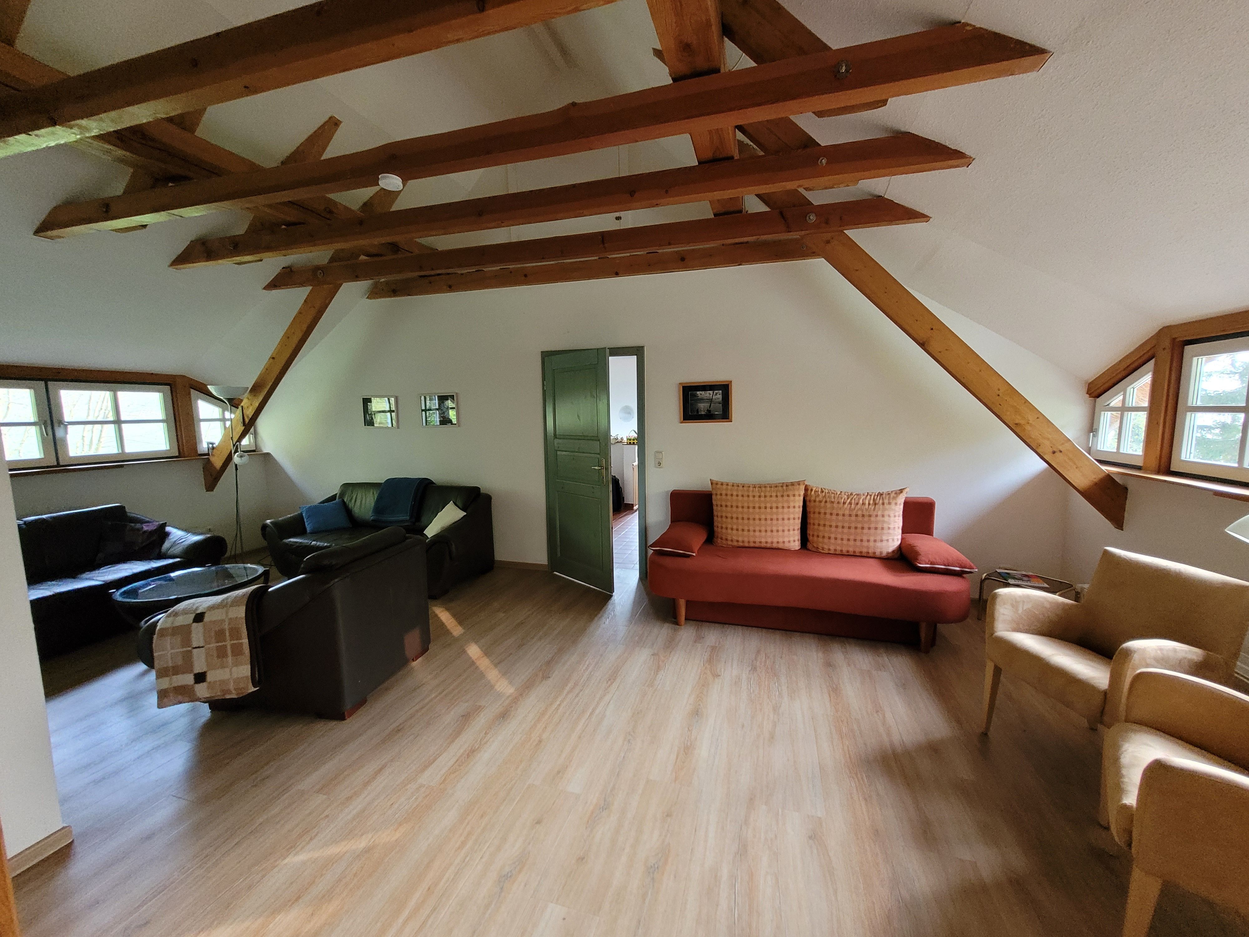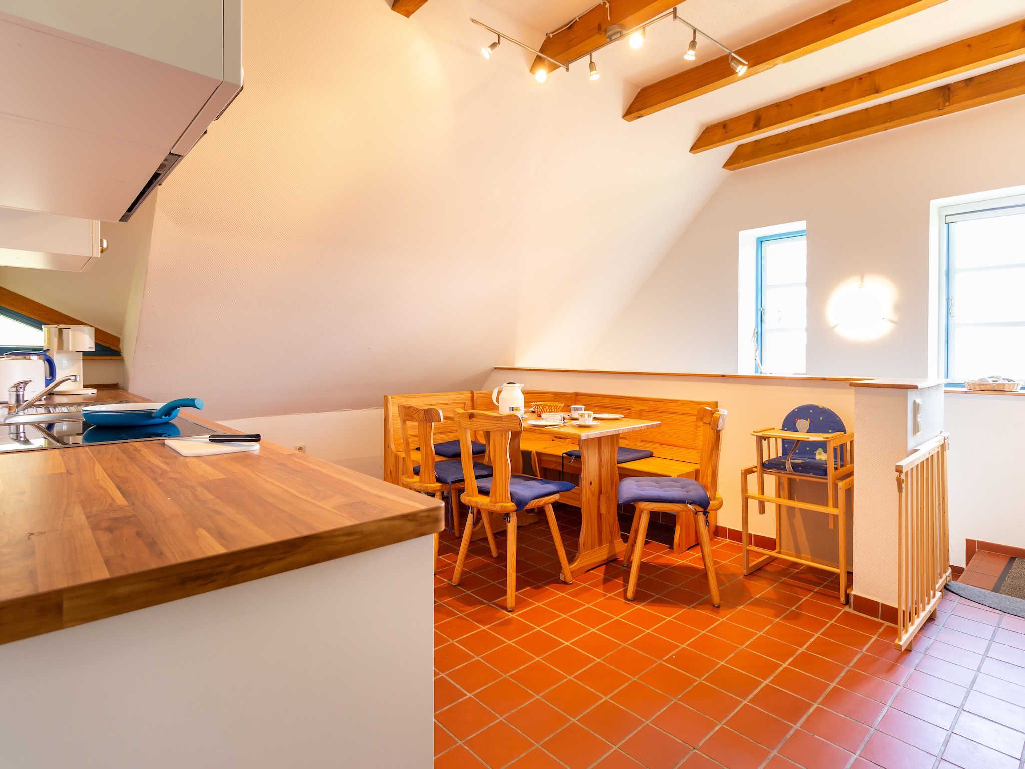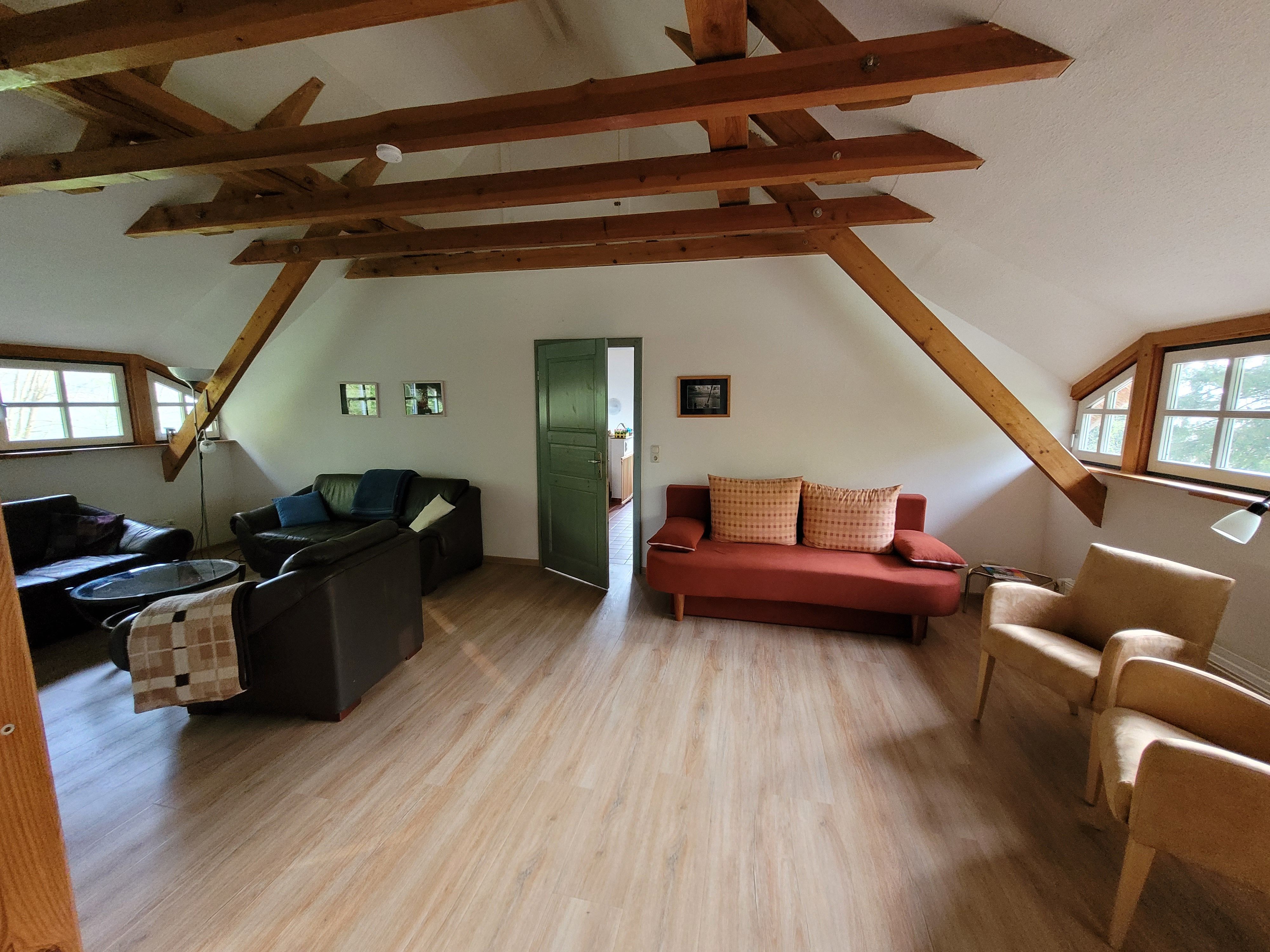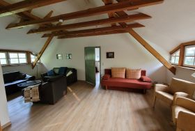 Die ca. 70 m² große Ferienwohnung liegt im Obergeschoss des reetgedeckten Hauses und verfügt über einen separaten Zugang von außen.