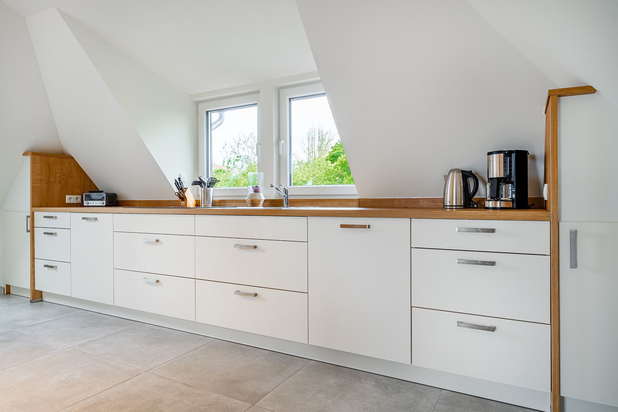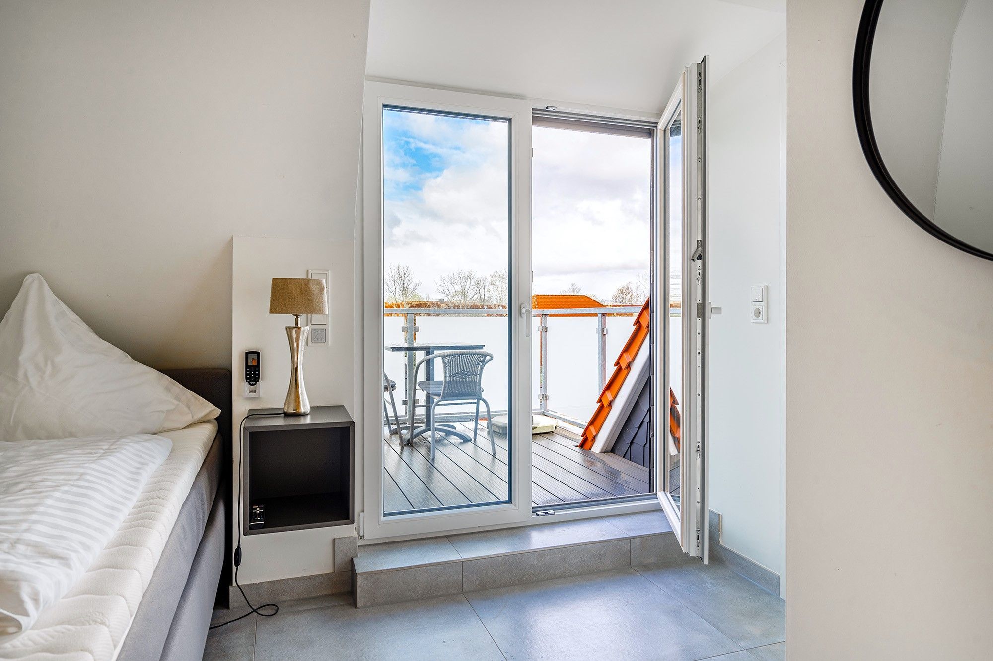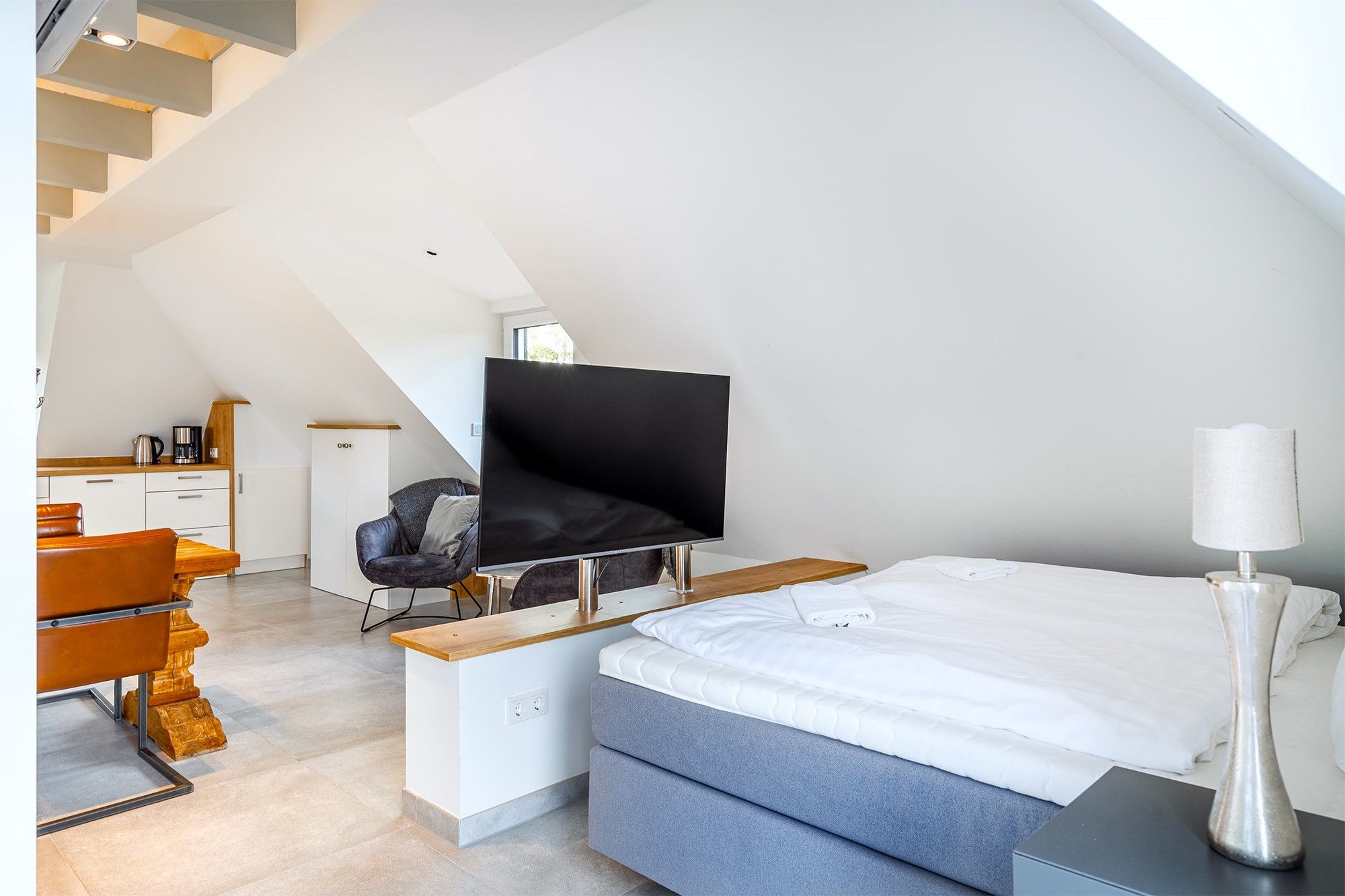Klein aber fein - das beschreibt unsere Ferienwohnung Die Zimmerei 3 am Besten. Diese erreichen Sie über einen separaten Eingang. Zentral aber dennoch ruhig gelegen, befindet sich die Wohnung im Dachgeschoss eines Hauses mit insgesamt fünf Wohneinheiten. Schon beim Hereintreten in diese gemütlich ausgestattete Wohnung kann man sich nur wohlfühlen! Im etwa 35qm großen und lichtdurchfluteten Wohnraum, der mit einem offenen Schlaf- und Wohnbereich im Loftstil gestaltet wurde finden Sie eine vollausgestattete Küche, einen Esstisch und ein bequemes Boxspringbett. Das Tageslichtbad ist praktisch geschnitten und bietet eine bodengleiche Dusche, sowie eine Waschmaschine. Vom Wohnbereich aus gelangen Sie auf die Dachterrasse mit Blick über Greetsiel- Platz zum Frühstücken, zum Sonnen und zum frische Nordluft tanken. Selbstverständlich steht Ihnen ein eigener Parkplatz am Haus zur Verfügung. Sollten Sie mit einem E-Auto anreisen, verfügt das Objekt auch über eine Ladesäule, die Sie hinzu buchen können.