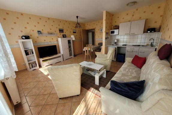 Unser Ferienhaus liegt ca.15 Geh-Minuten vom Strand entfernt in einer ruhigen Wohnlage. Die komplett eingerichtete Ferienwohnung mit Wohnzimmer, ein Schlafzimmer mit einem Ehebett und einer Liege, Küchenzeile, Dusche, WC, Flur und großem Balkon/Terrasse würde für Sie bereitstehen. Zur Ausstattung gehören weiter Radio, Fernseher, einmalig Bettwäsche und Handtücher. In der Küchenzeile sind Mikrowelle, Kaffeemaschine und Toaster, Eier-und Wasserkocher sowie ein 2-Platten-Kocher, Kühlschrank und Geschirr vorhanden. Eine Aufbettung ist im Wohnzimmer nach Absprache auf dem ausziehbarem Sofa möglich. Zu jeder Wohnung gehört ein kostenloser Parkplatz für Ihr Auto. In dieser Wohnung sind keine Haustiere erlaubt.