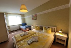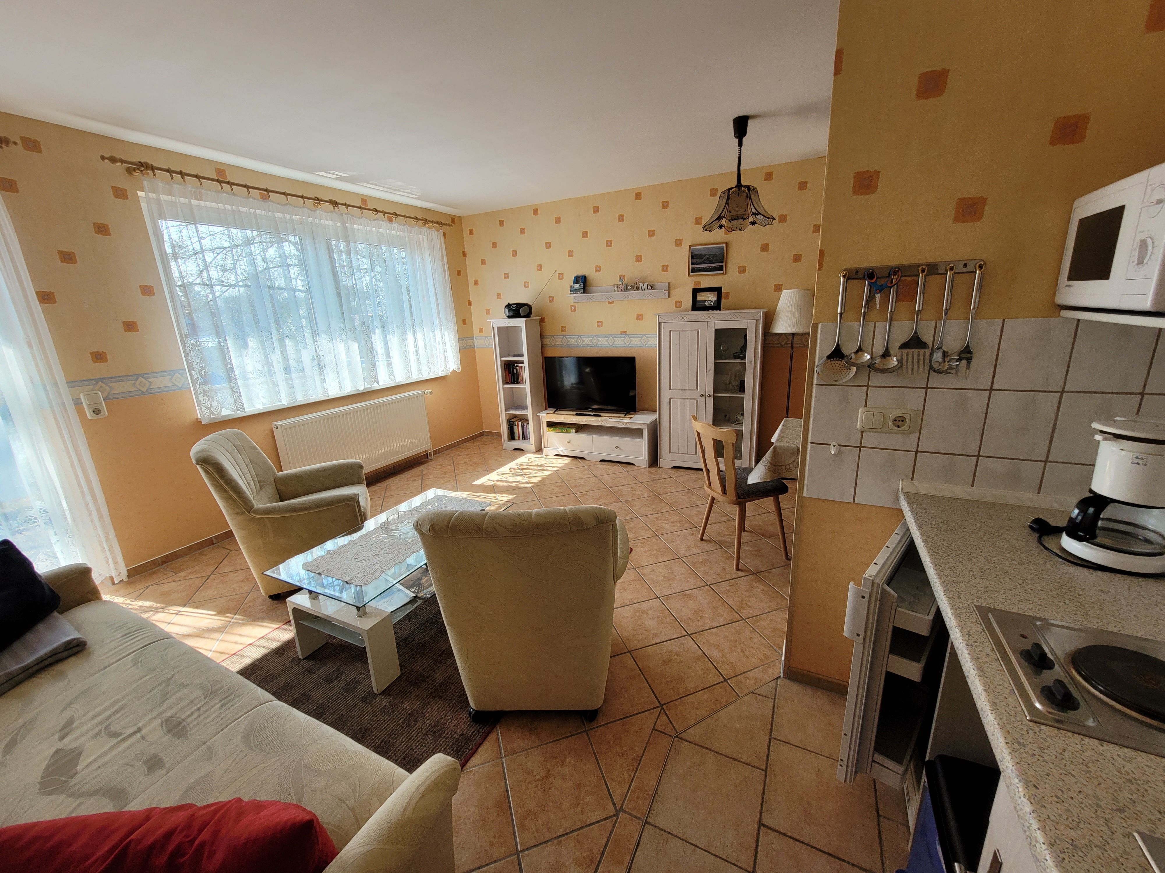 Die komplett eingerichtete Ferienwohnung mit Wohnzimmer, ein Schlafzimmer mit einem Ehebett und einer Liege, Küchenzeile, Dusche, WC, Flur und großem Balkon würde für Sie bereitstehen. Zur Ausstattung gehören weiter Radio, Sat-Fernseher, einmalig Bettwäsche und Handtücher. In der Küchenzeile sind Mikrowelle, Kaffeemaschine und Toaster, Eier- und Wasserkocher sowie ein 2- Platten-Kocher, Kühlschrank und Geschirr vorhanden. Wir möchten Sie darauf hinweisen, dass es sich bei unseren Ferienwohnungen um Nichtraucherwohnungen handelt. Natürlich dürfen Sie auf dem Balkon oder der Terrasse rauchen. Die Waschmaschinen- und Trocknerbenutzung ist nach vorheriger Absprache möglich.