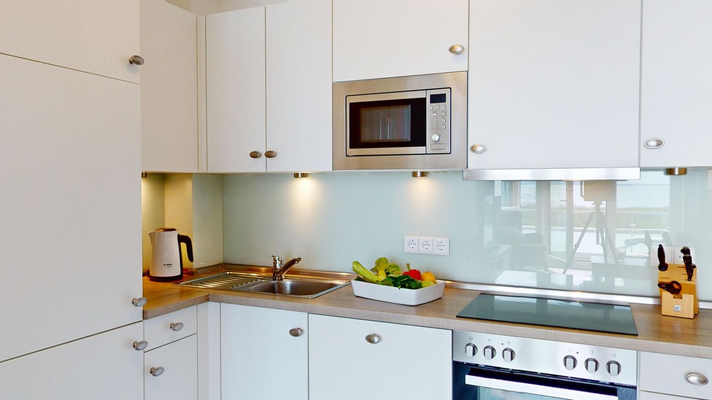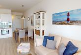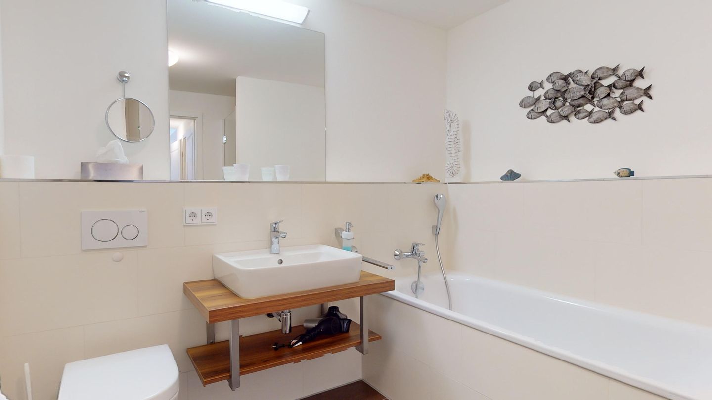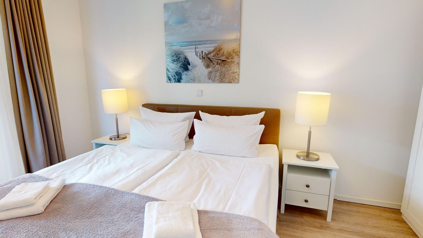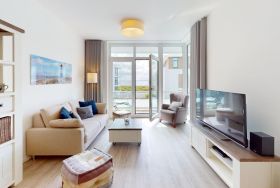 Die 59 m² große Wohnung ist modern und hell eingerichtet. Der einladende Wohn- und Essbereich grenzt an eine voll ausgestattete Küchenzeile. Das Sofa lässt sich auch als Schlafcouch für zwei Personen nutzen. Das Schlafzimmer ist mit einem Boxspring-Doppelbett ausgestattet. Im Badezimmer erwartet Sie eine Badewanne und eine separate Dusche.