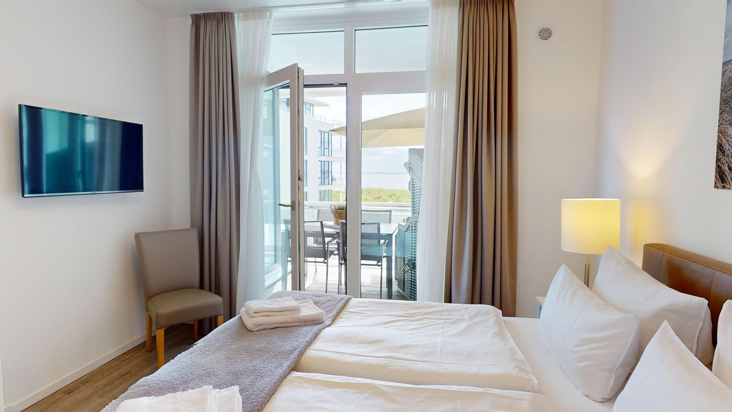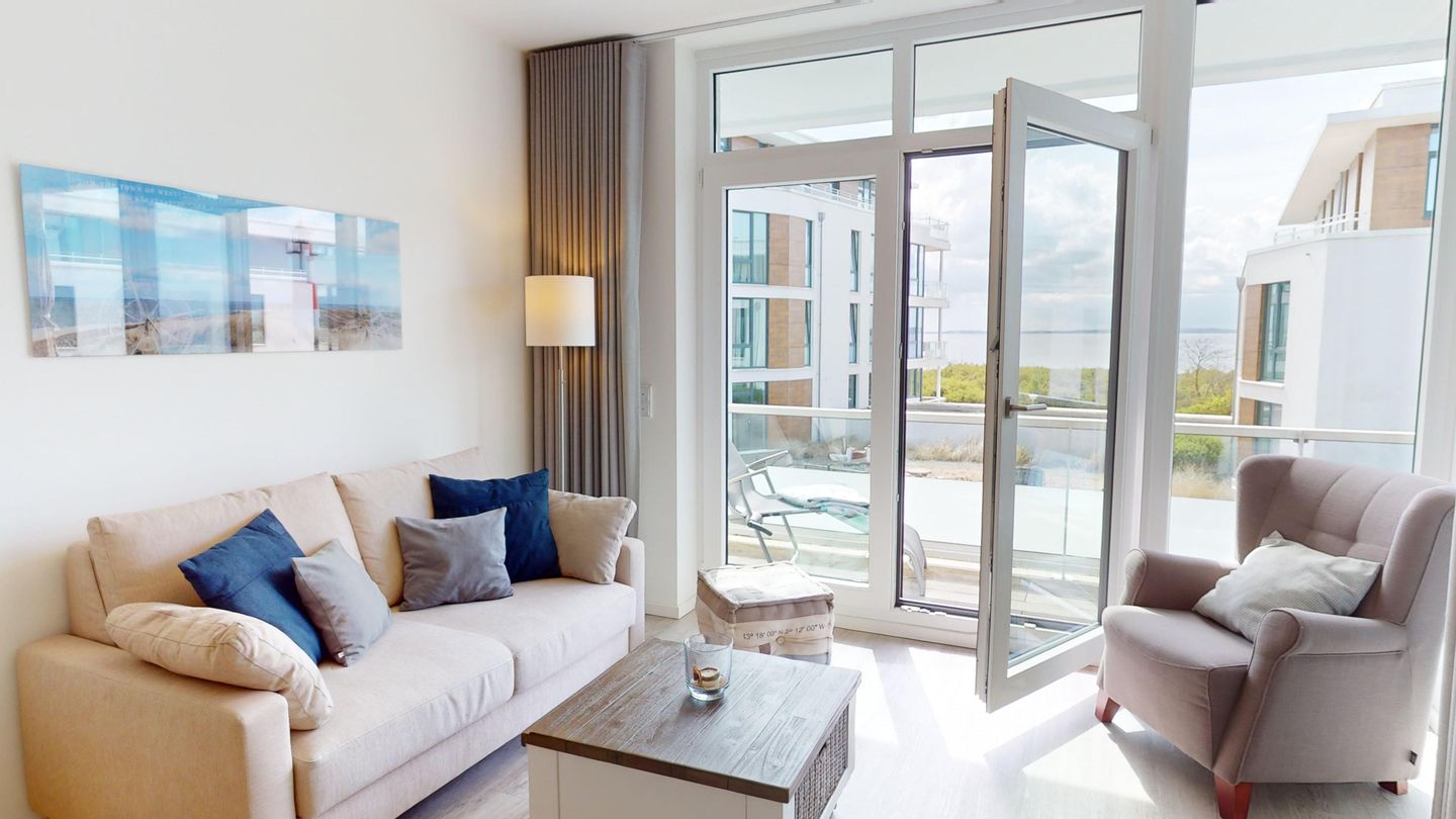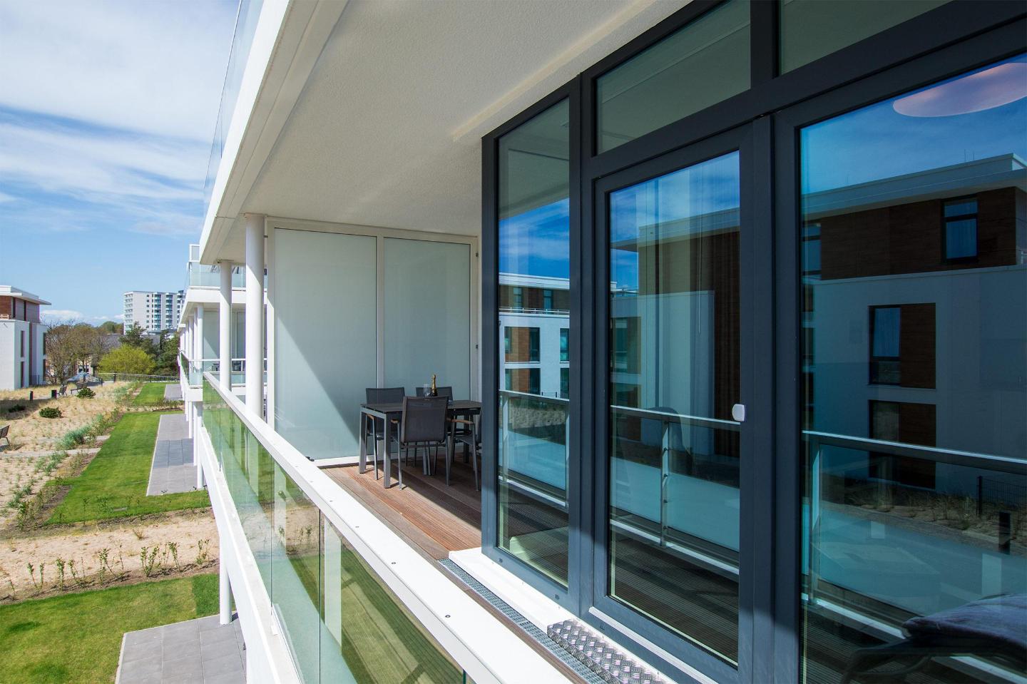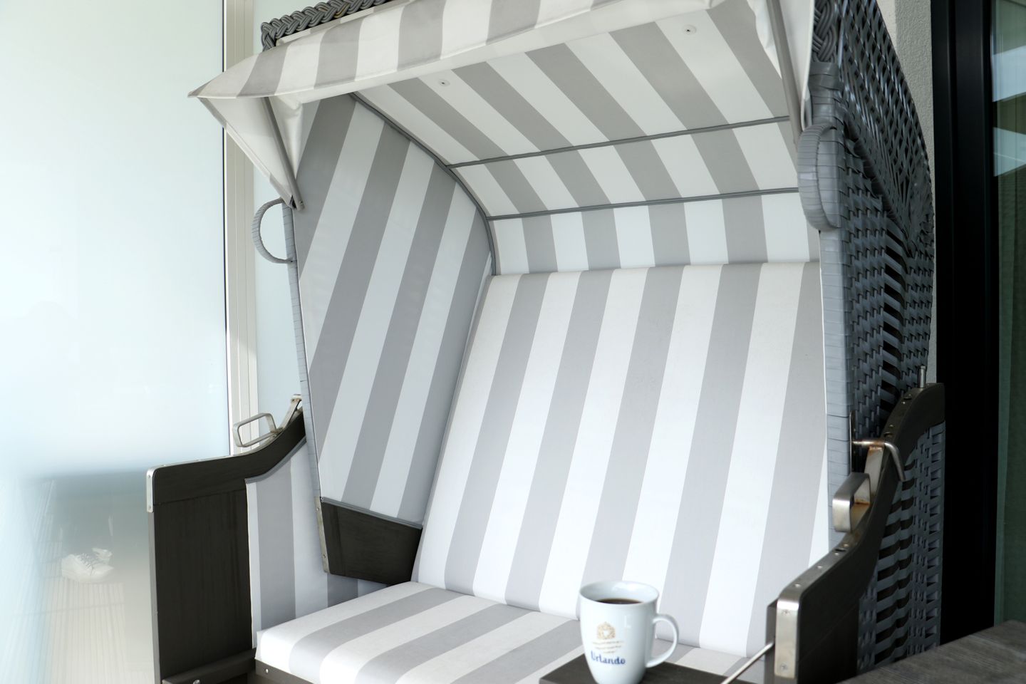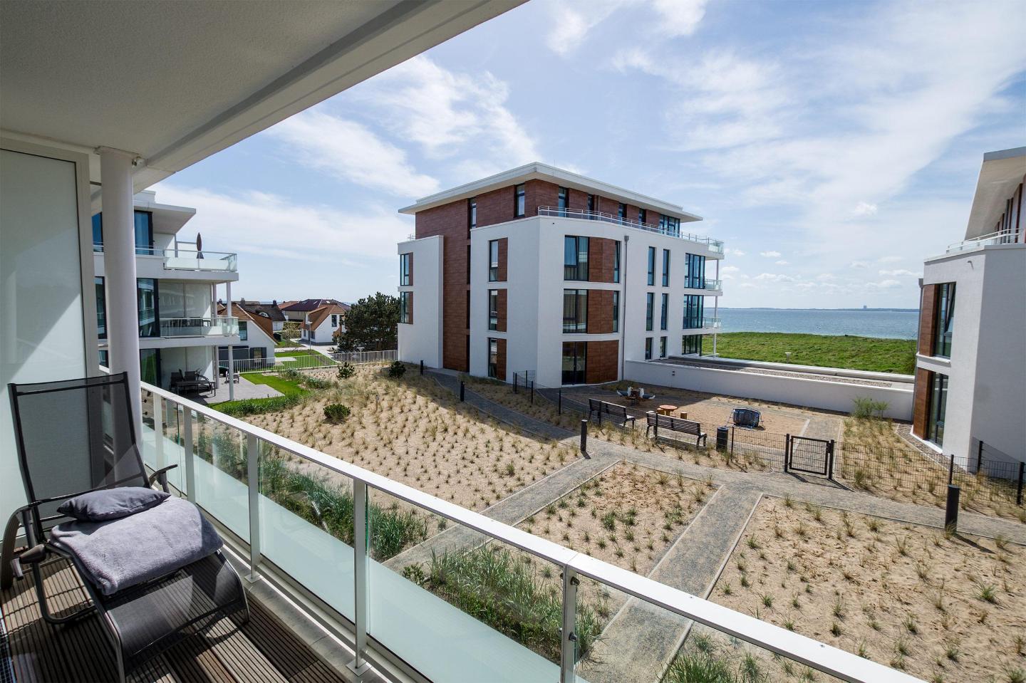 Auf dem überdachten Balkon erwartet Sie ein Tisch mit vier Stühlen, Sonnenliegen sowie ein Strandkorb für gemütliche Auszeiten mit Blick auf die Ostsee.