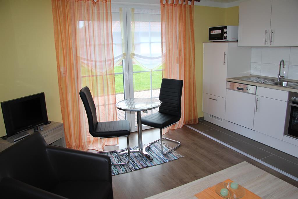 Unsere kleine Ferienwohnung im Erdgeschoss (ca. 45 m²) liegt direkt vorm Deich. Im Wohn-/Essbereich werden Sie eine ein Sat-TV und Stereoanlage sowie eine Küchenzeile mit div. elektr. Geräten wie Kaffeemaschine, Wasserkocher, Toaster u.s.w. vorfinden.