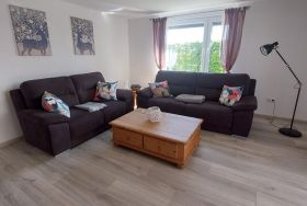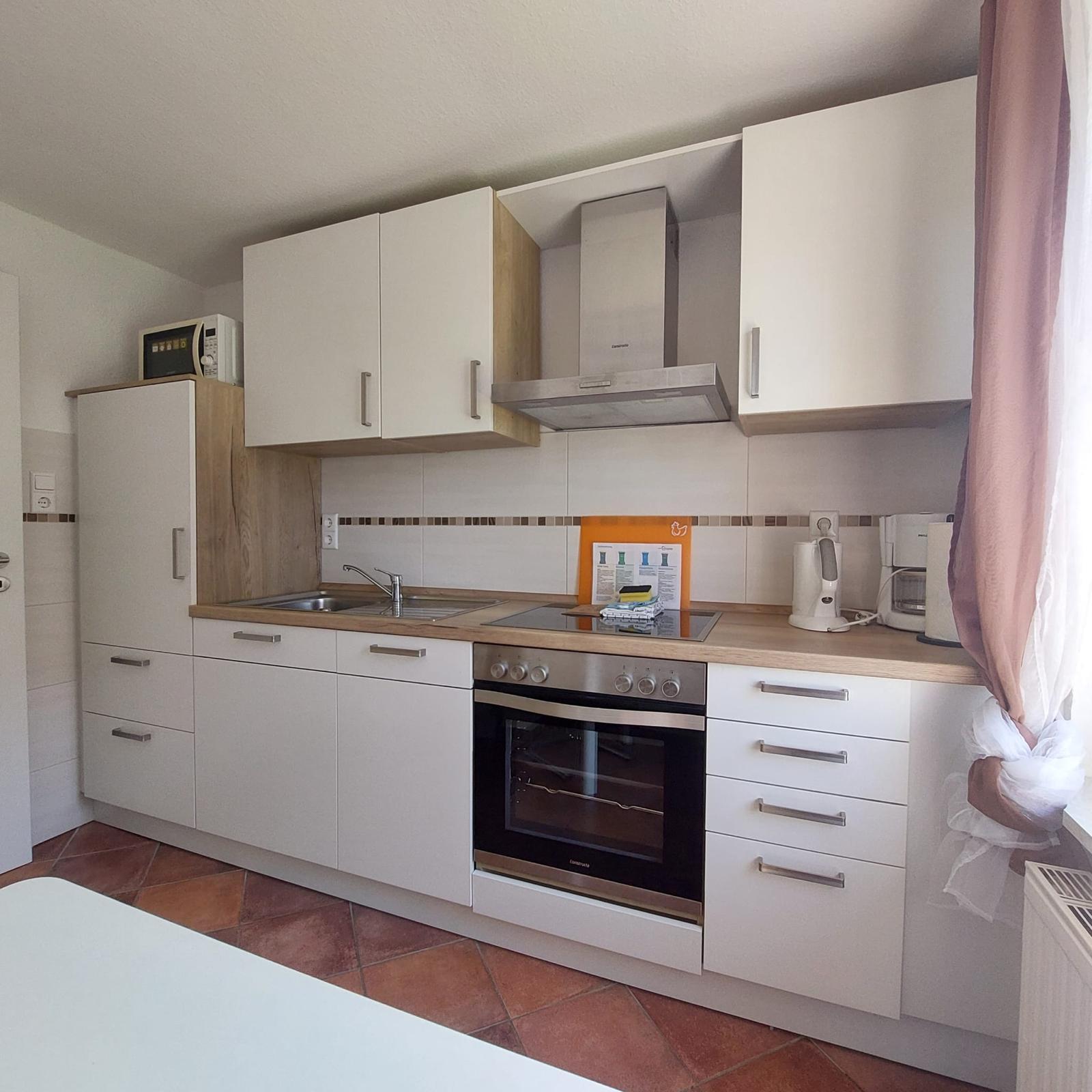 Ferienwohnung West (ca. 55 m²) befindet sich im Erdgeschoss und ist zum Westen ausgerichtet. Im Wohnzimmer erwartet Sie ein Sat-TV sowie eine Stereoanlage. In der separaten Küche erwartet Sie eine komplett eingerichtete Küchenzeile mit einem Vierplattenherd und Backofen, Kühlschrank mit Gefrierkombination, Mikrowelle und div. elektrischen Geräten.