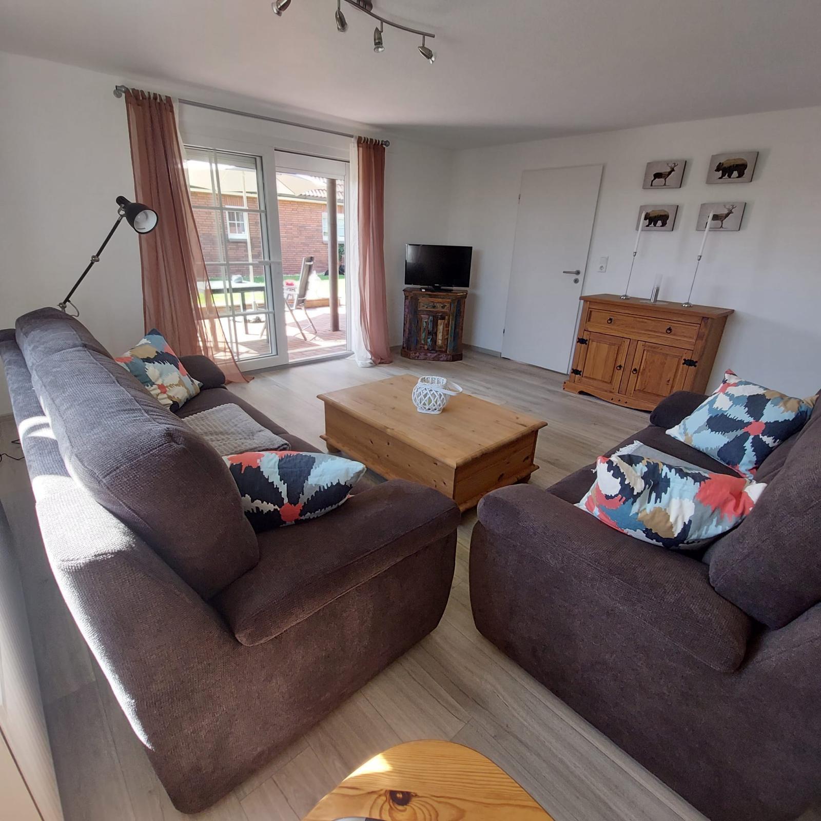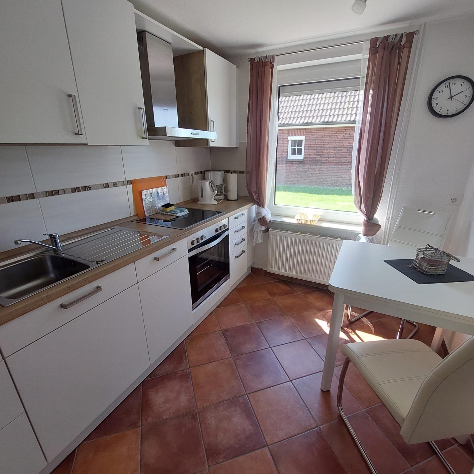 Unsere kleine Ferienwohnung im Erdgeschoss (ca. 45 m²) liegt direkt vorm Deich. Im Wohn-/Essbereich werden Sie eine ein Sat-TV und Stereoanlage sowie eine Küchenzeile mit div. elektr. Geräten wie Kaffeemaschine, Wasserkocher, Toaster u.s.w. vorfinden.