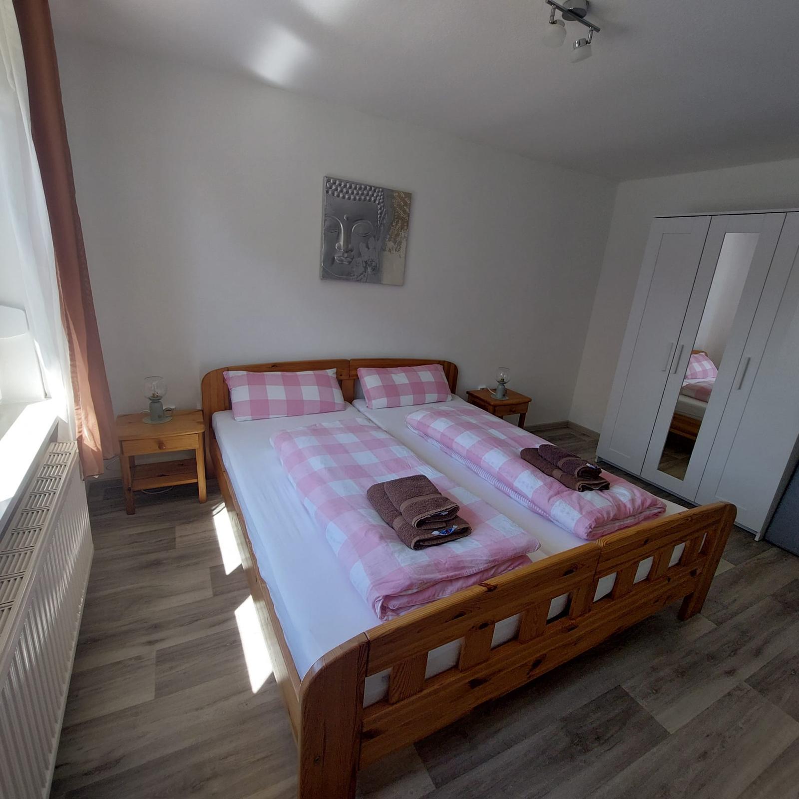 Auf einer Wohnfläche von ca. 55 m² werden Sie in unserer Ferienwohnung im Obergeschoss einen kombinierten Wohn-/Essbereich mit Sat-TV, eine integrierte Küchenzeile mit Vierplattenherd und Backofen, Kühlschrank mit Gefrierkombination sowie eine Mikrowelle und div. elektrischen Geräte vorfinden. Zwei Schlafräume sind mit jeweils einem Doppelbett ausgestattet und Ihre Betten sind bereits bei Anreise bezogen. Das Bad verfügt über Dusche/WC.