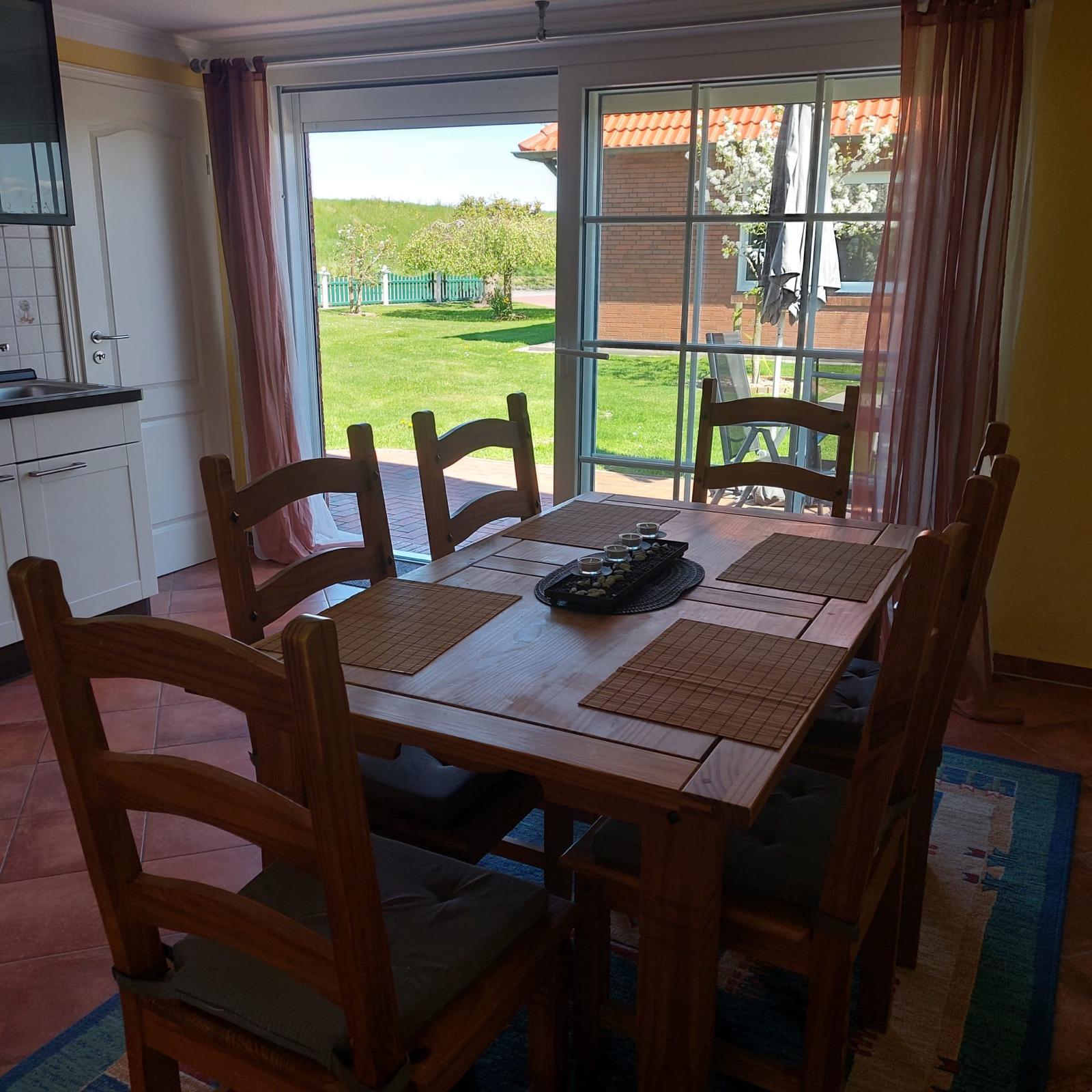 Unsere kleine Ferienwohnung im Erdgeschoss (ca. 45 m²) liegt direkt vorm Deich. Im Wohn-/Essbereich werden Sie eine ein Sat-TV und Stereoanlage sowie eine Küchenzeile mit div. elektr. Geräten wie Kaffeemaschine, Wasserkocher, Toaster u.s.w. vorfinden.