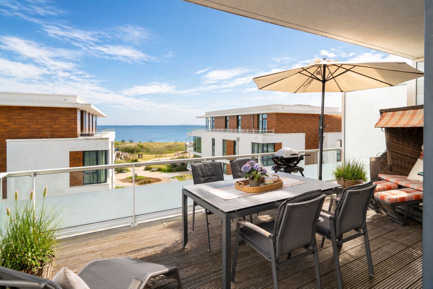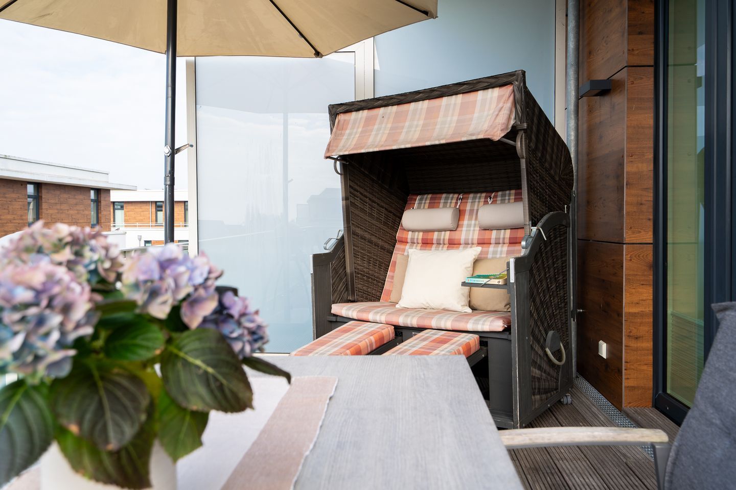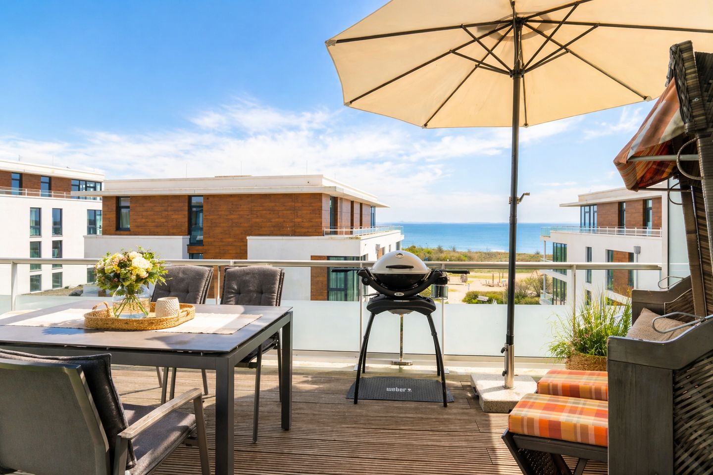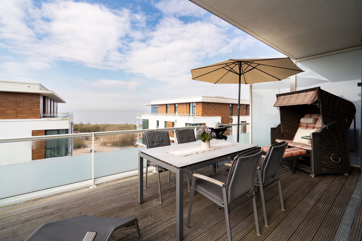 Auf der großen, teils überdachten Dachterrasse, von der Sie den direkten Meerblick genießen können, stehen eine Terrassenmöblierung mit 2 Liegen, ein Strandkorb sowie ein hochwertiger Grill zur Verfügung.