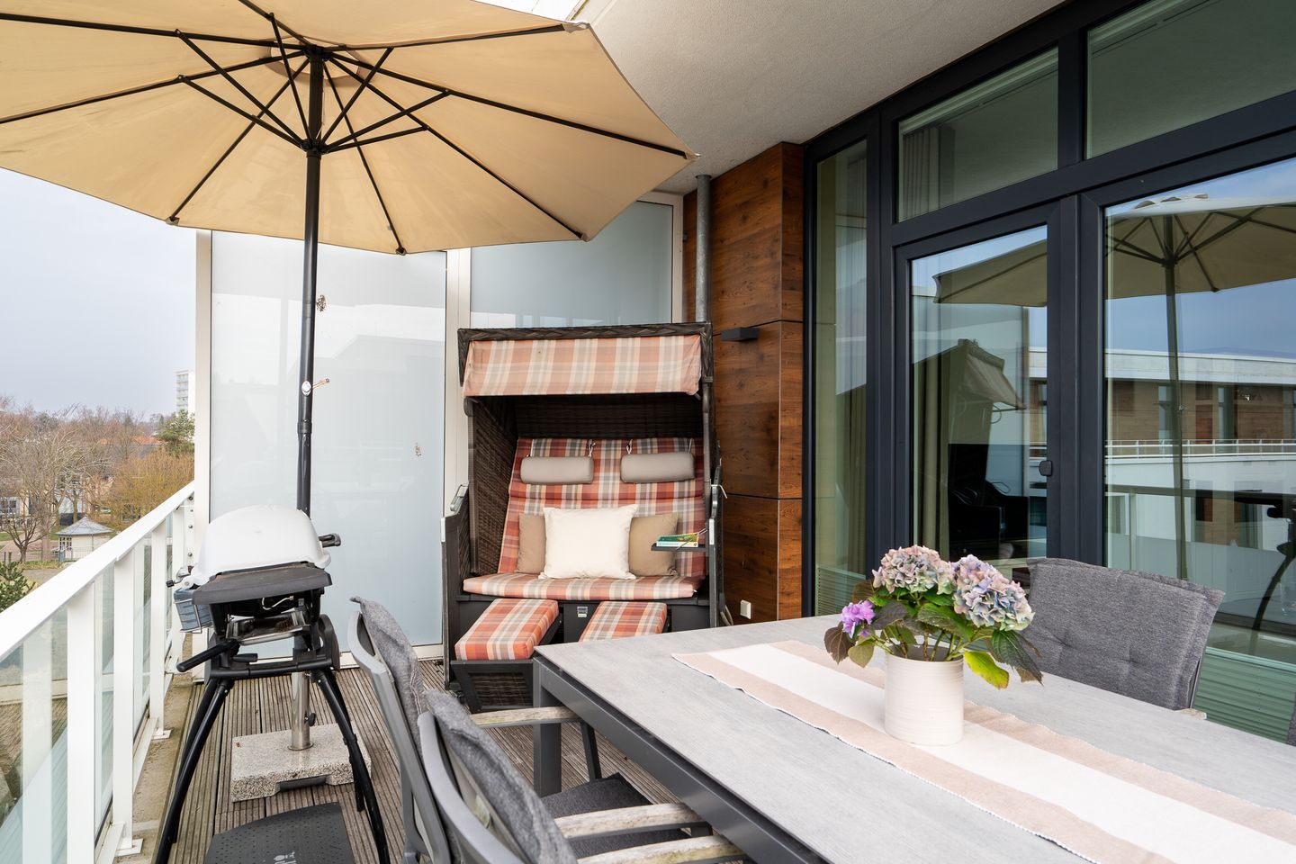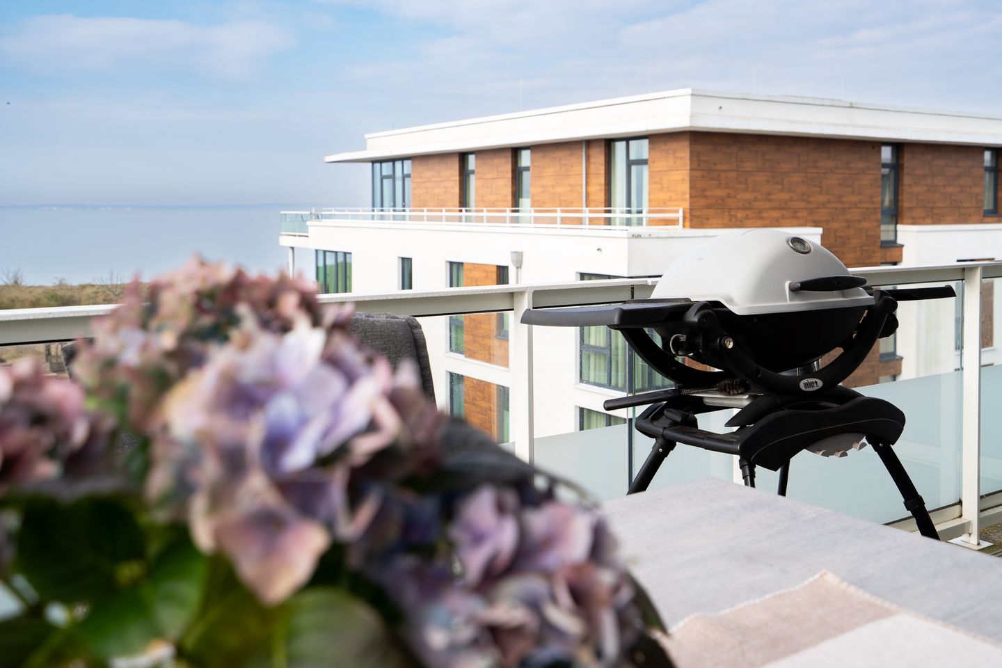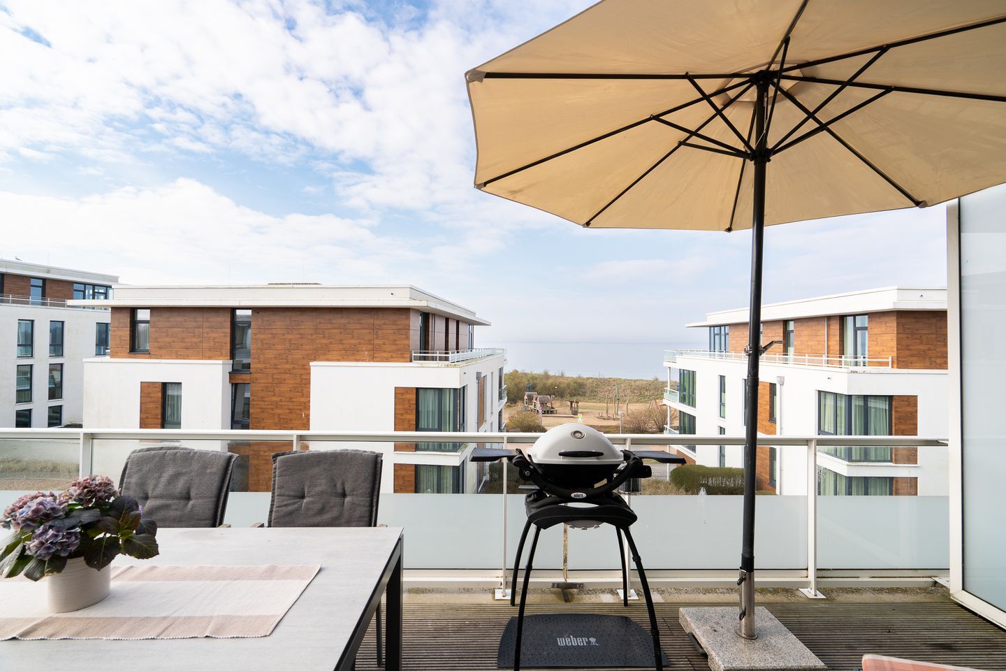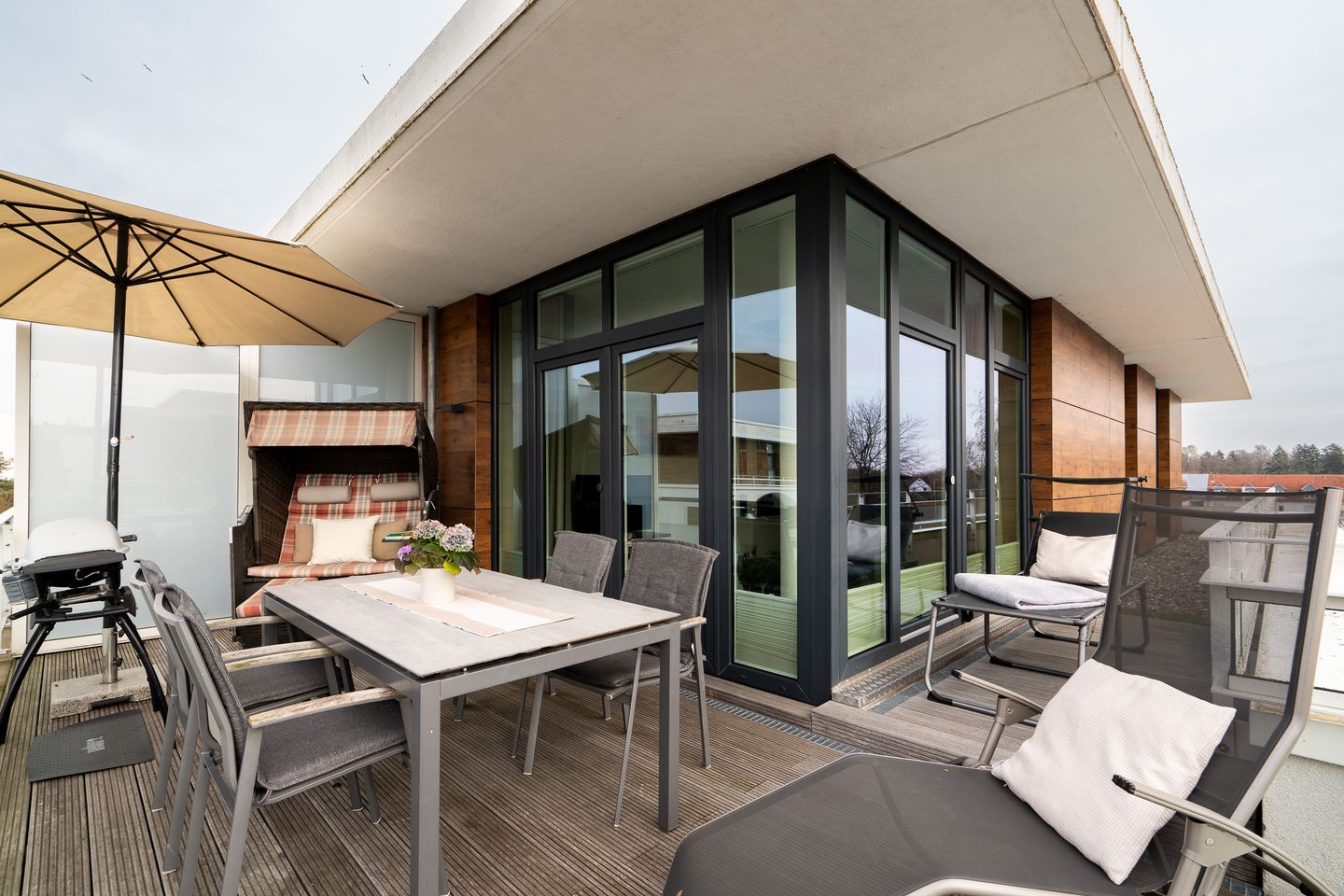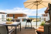 Auf der großen, teils überdachten Dachterrasse, von der Sie den direkten Meerblick genießen können, stehen eine Terrassenmöblierung mit 2 Liegen, ein Strandkorb sowie ein hochwertiger Grill zur Verfügung.