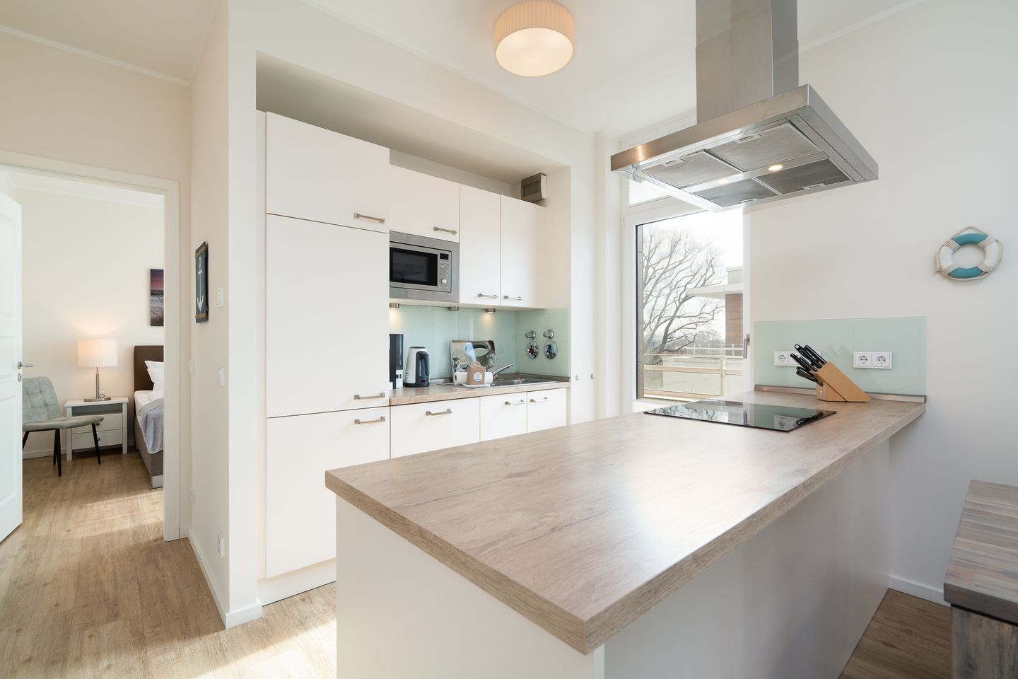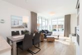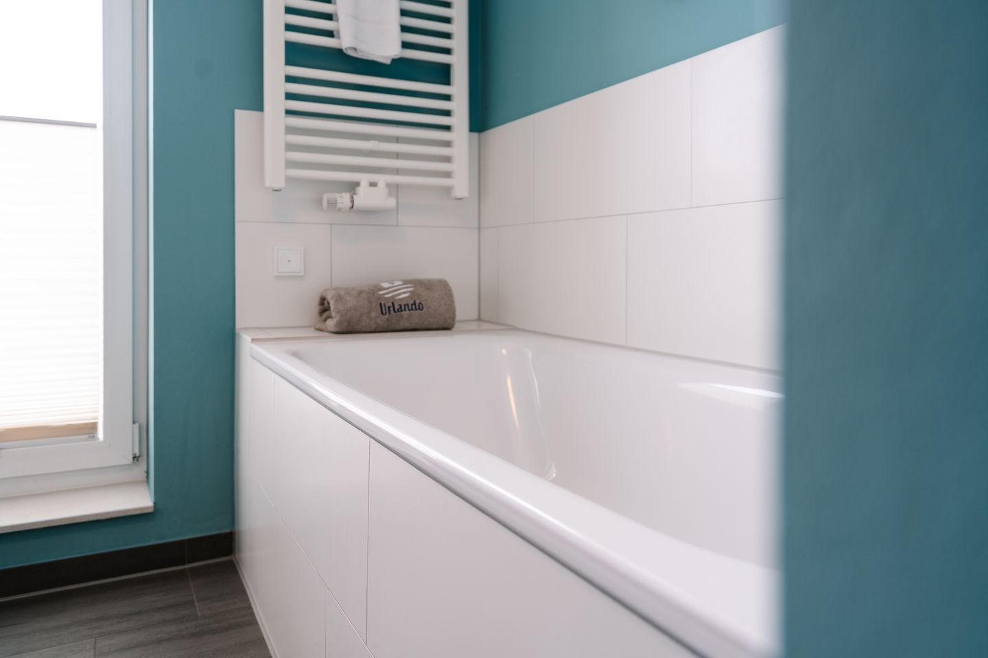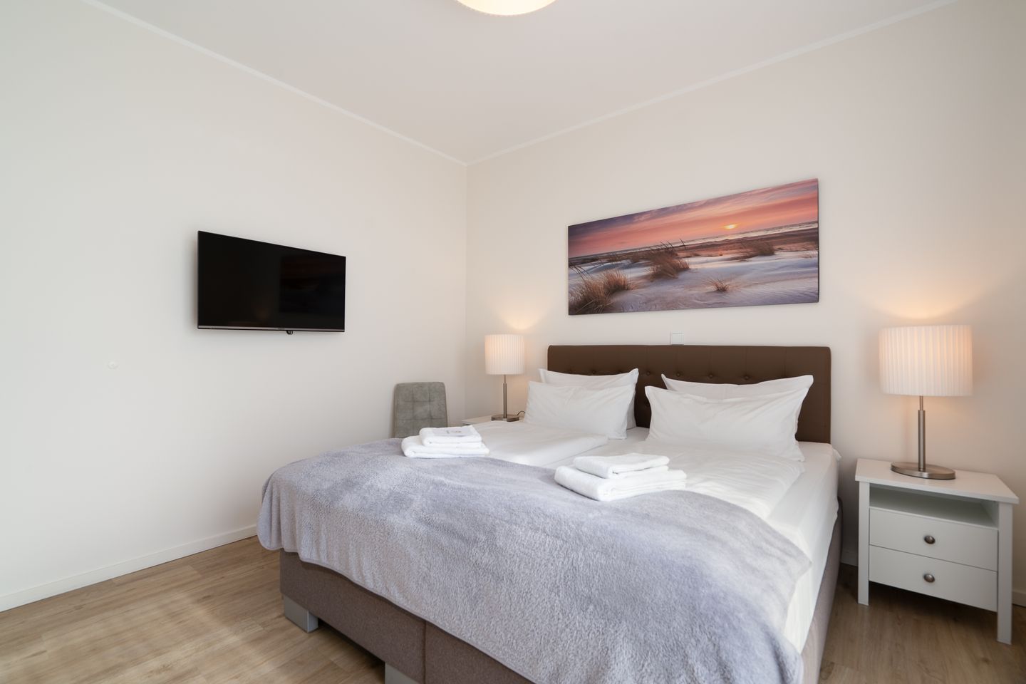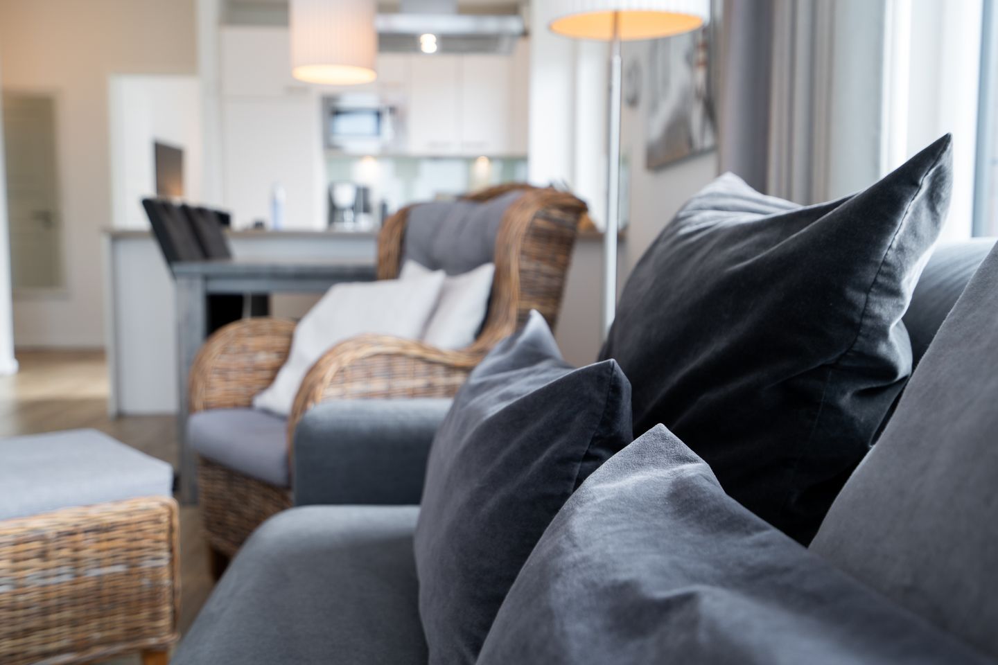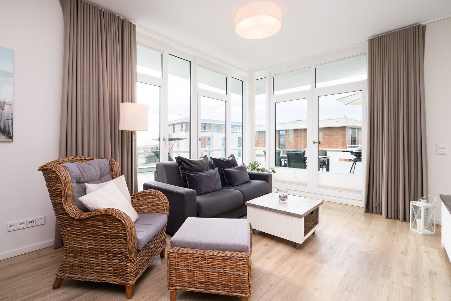 Es verfügt über ein nach Südwesten ausgerichtetes, lichtdurchflutetes Wohnzimmer mit Essbereich und anschließender offener, gut ausgestatteter Küche. Weiterhin gibt es ein Schlafzimmer mit einem Boxspring-Doppelbett für zwei Personen. Die Couch im Wohnzimmer dient als Schlafmöglichkeit und bietet weiteren Platz für 2 Personen. Abgerundet wird das Penthouse durch das moderne Bad mit Badewanne und Dusche. Je ein Kinderbett und ein Kinderhochstuhl sind in der Wohnung vorhanden.