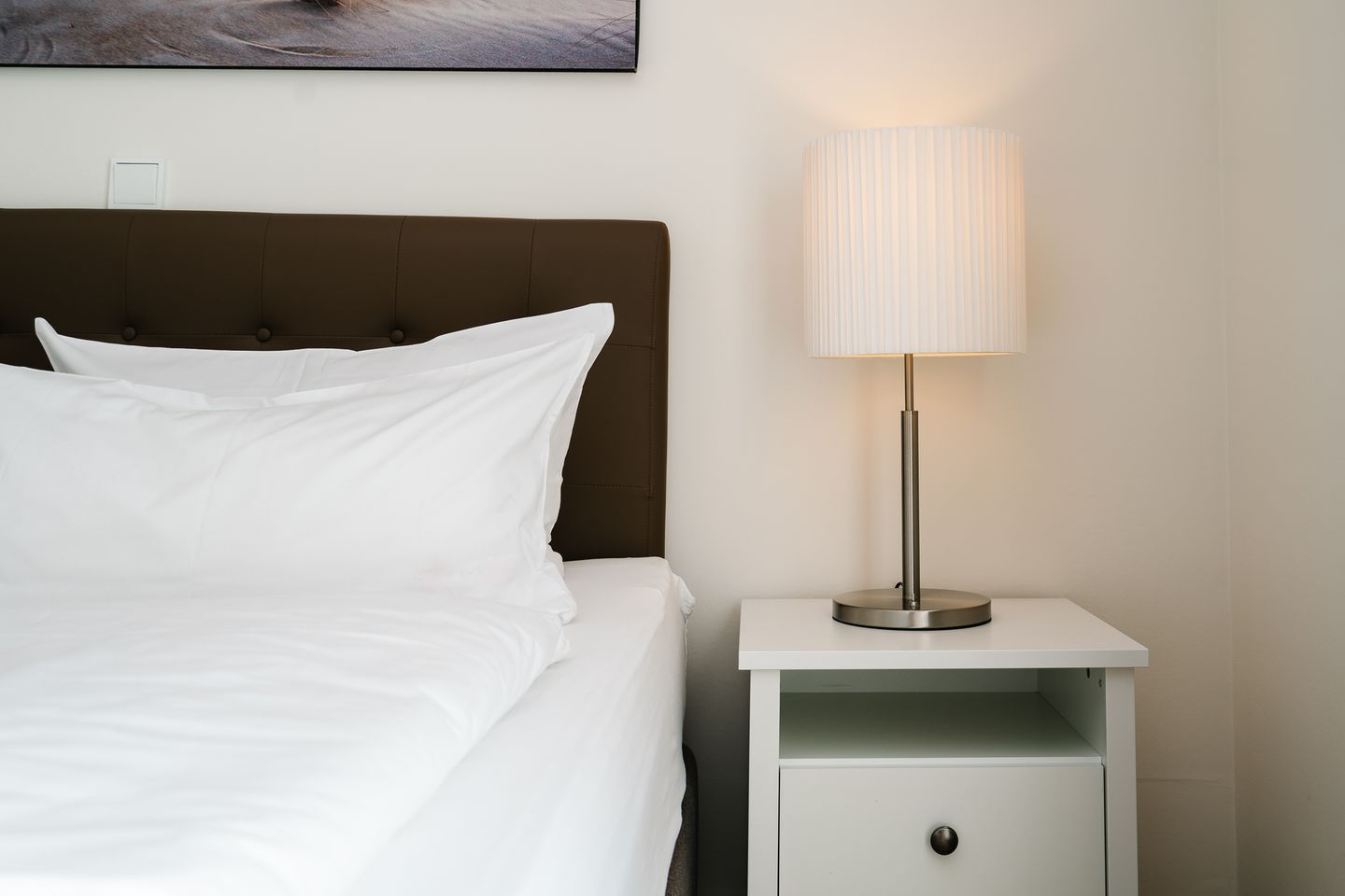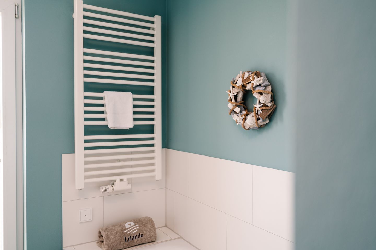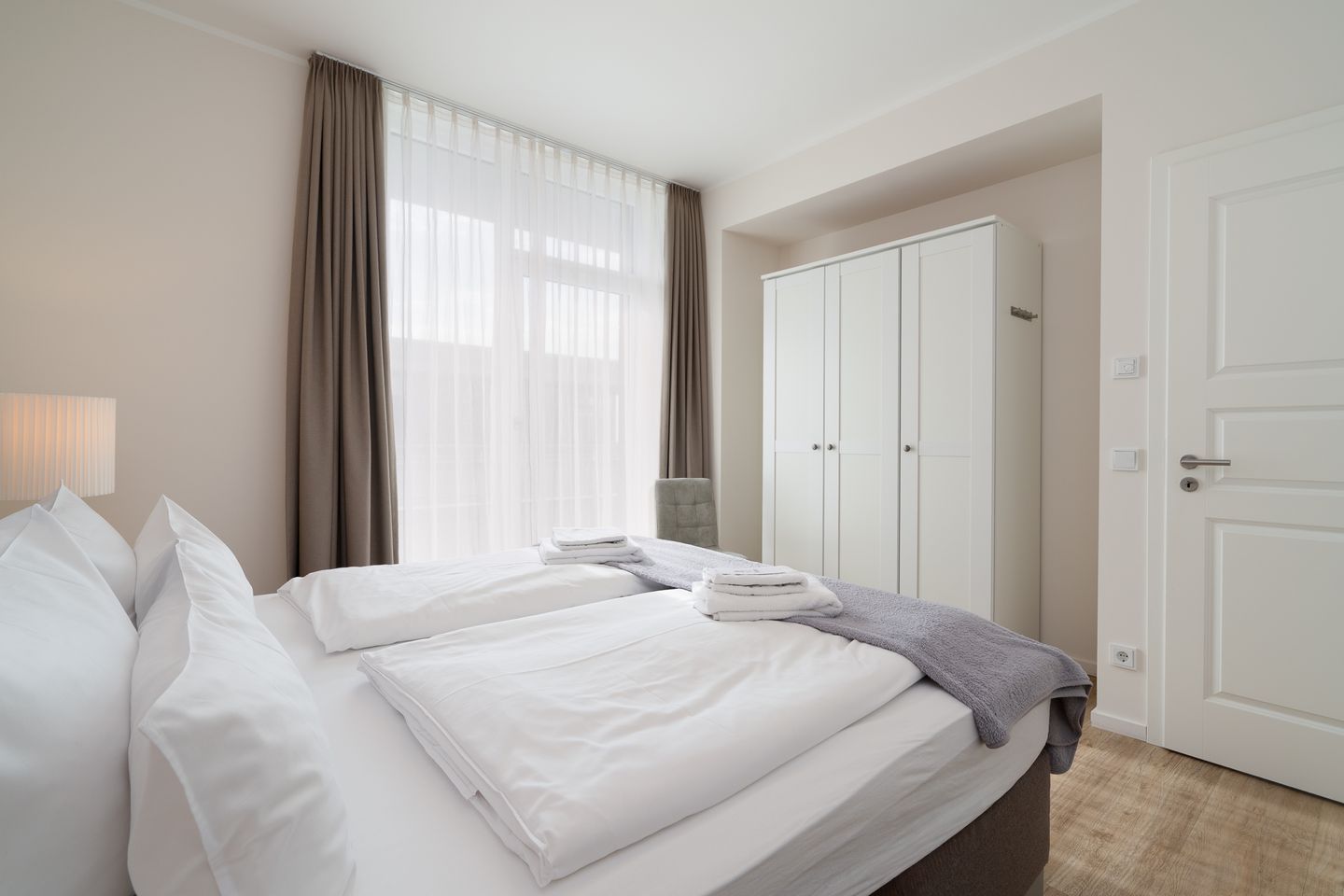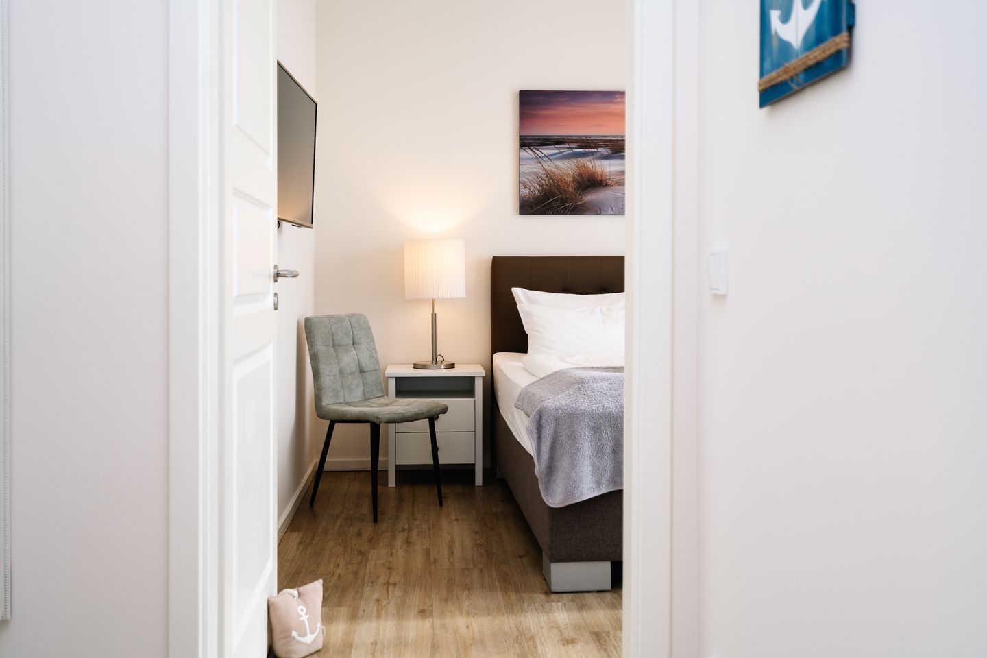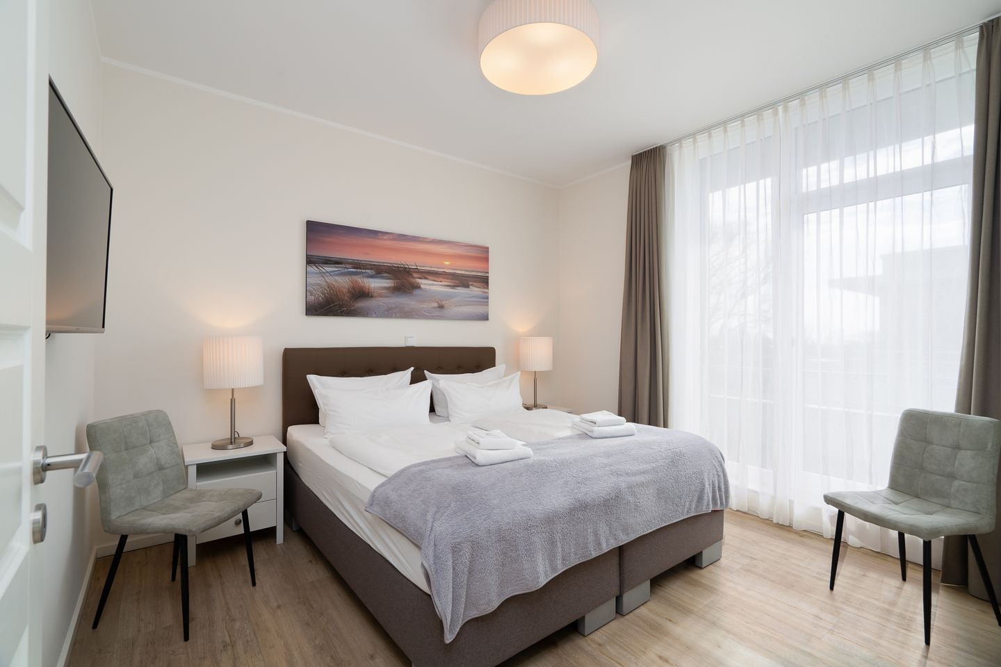 Es verfügt über ein nach Südwesten ausgerichtetes, lichtdurchflutetes Wohnzimmer mit Essbereich und anschließender offener, gut ausgestatteter Küche. Weiterhin gibt es ein Schlafzimmer mit einem Boxspring-Doppelbett für zwei Personen. Die Couch im Wohnzimmer dient als Schlafmöglichkeit und bietet weiteren Platz für 2 Personen. Abgerundet wird das Penthouse durch das moderne Bad mit Badewanne und Dusche. Je ein Kinderbett und ein Kinderhochstuhl sind in der Wohnung vorhanden.