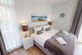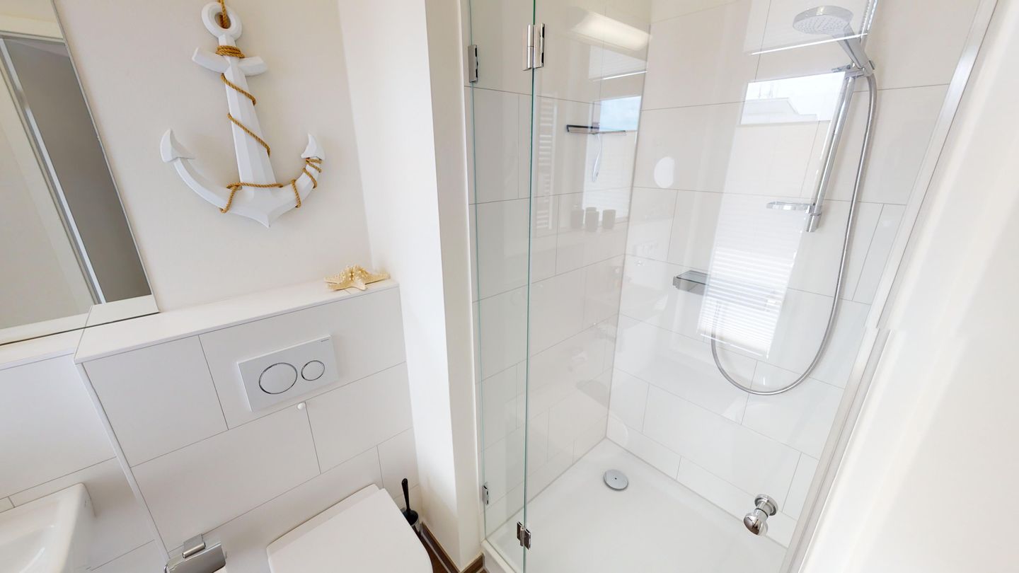 Das Badezimmer bietet großzügige Ablageflächen, eine Dusche und eine zusätzliche Badewanne. Beide Badezimmer sind exklusiv ausgestattet und haben Tageslicht. Das kleine Badezimmer bietet sogar einen kleinen Meerblick. Das zweite Schlafzimmer der Ferienwohnung ist mit zwei hochwertigen Boxpring-Einzelbetten, einem Kleiderschrank, einem Schminktisch und einem dritten wandhängenden SMART TV ausgestattet. Auch von diesem Zimmer aus kann man einen Ostseeblick auf die Lübecker Bucht genießen. In der Ferienwohnung befinden sich außerdem ein eingebauter Safe und diverse Haushaltsutensilien wie ein Dyson Akku-Staubsauger, Wischmop, Besen, Handfeger, Bügelbrett und Bügeleisen. Ein Föhn ist natürlich ebenfalls vorhanden.