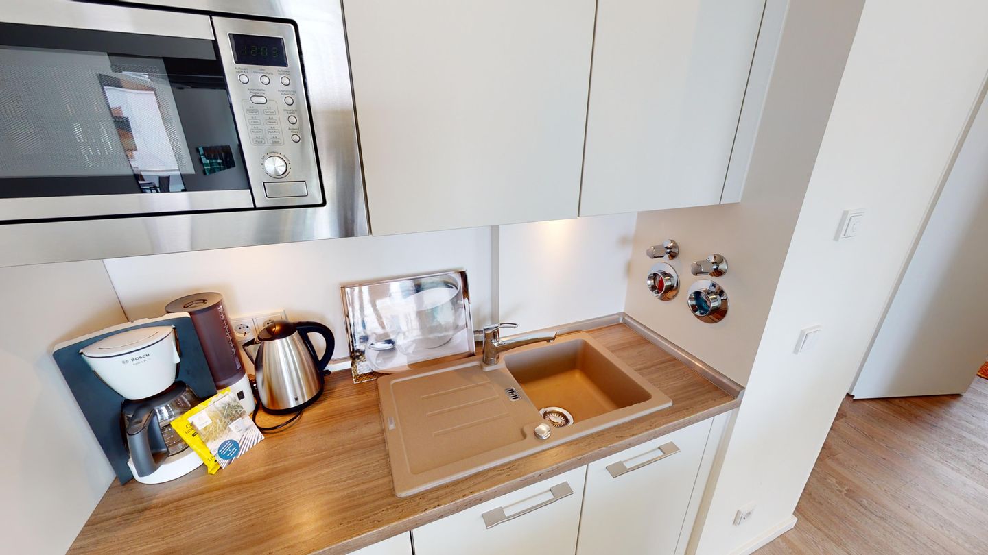 Die Küche ist komfortabel ausgestattet mit Geschirrspülmaschine, Mikrowelle, einem Kochtresen mit Ceranfeld, Backofen und Dunstabzugshaube, einer Tassimo Kaffee-Tab-Maschine (wahlweise auch Nutzung der vorhandenen Bosch Filterkaffeemaschine möglich), Toaster, Wasserkocher und Eierkocher. Ein Elektrogrill von Philips bietet die Möglichkeit für gemütliche Grillabende auf der Dachterrasse.