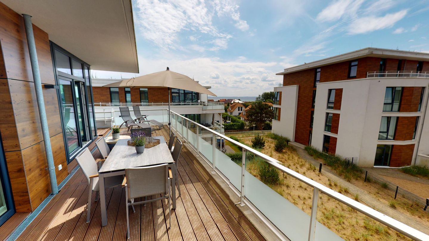 Die große Dachterrasse mit tollem Meerblick ist nach Süden ausgerichtet und bietet durch die in der Lübecker Bucht einzigartigen Lage bei gutem Wetter fast den ganzen Tag Sonne. Die halbüberdachte Dachterrasse ist mit einem großen Tisch, Stühlen, zwei Liegestühlen, einem Sonnenschirm und einer Gartenbox ausgestattet.